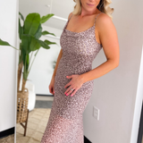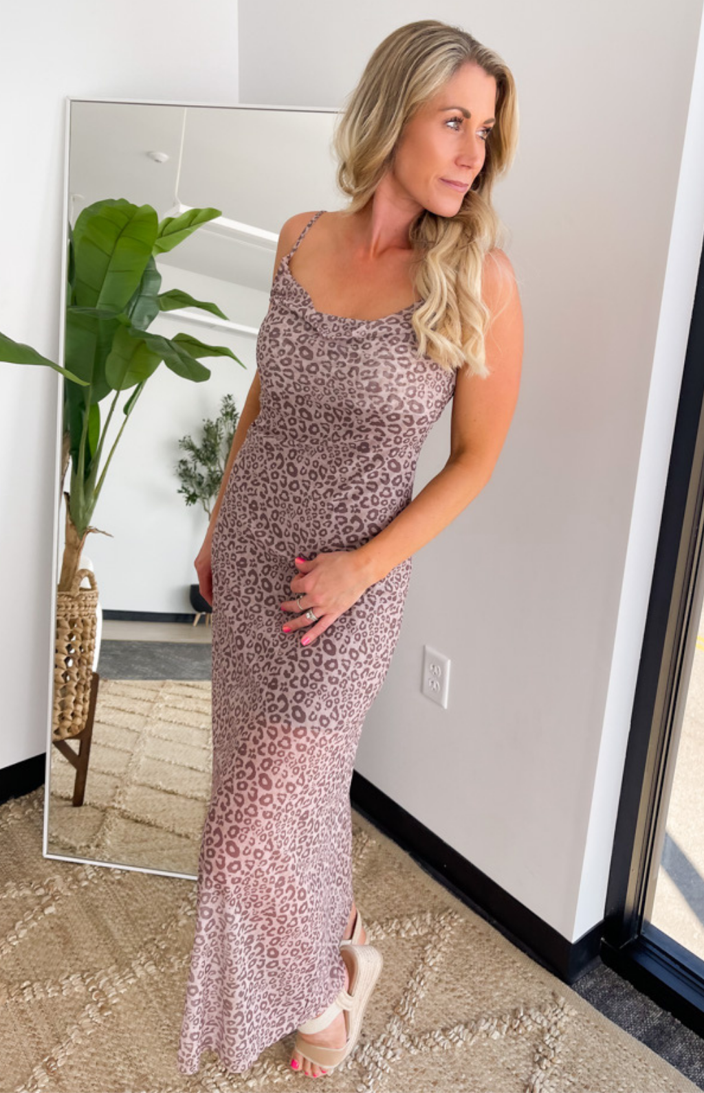 Turn heads in this fierce and feminine leopard print knit dress. Designed with a lightweight, breathable mesh fabric, it drapes effortlessly with a soft cowl neckline, a scoop back that dips toward the shoulder blades, and a flowy silhouette. The inner lining hits just at the knees for comfort and coverage, while the sheer overlay adds movement and a little edge. Perfect for date nights, summer getaways, or whenever you're feeling bold—this dress brings that wild energy in a wearable, flattering way. Runs true to size with a breezy fit.