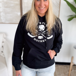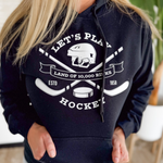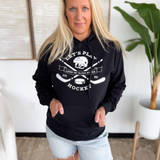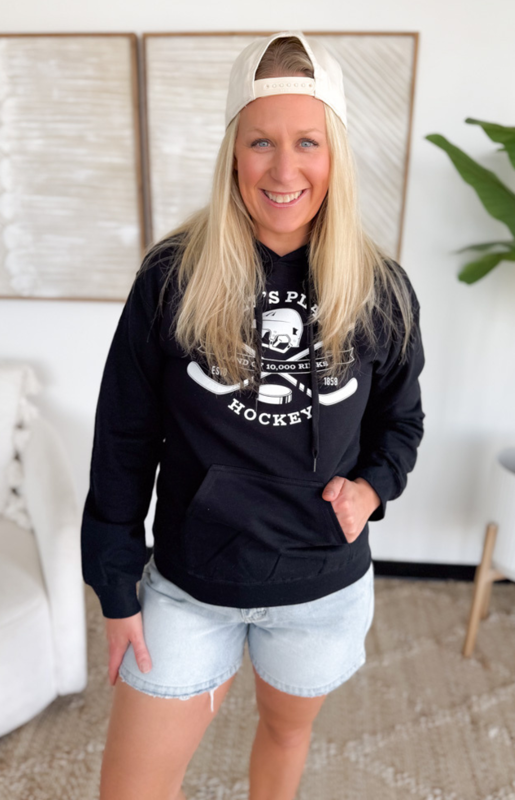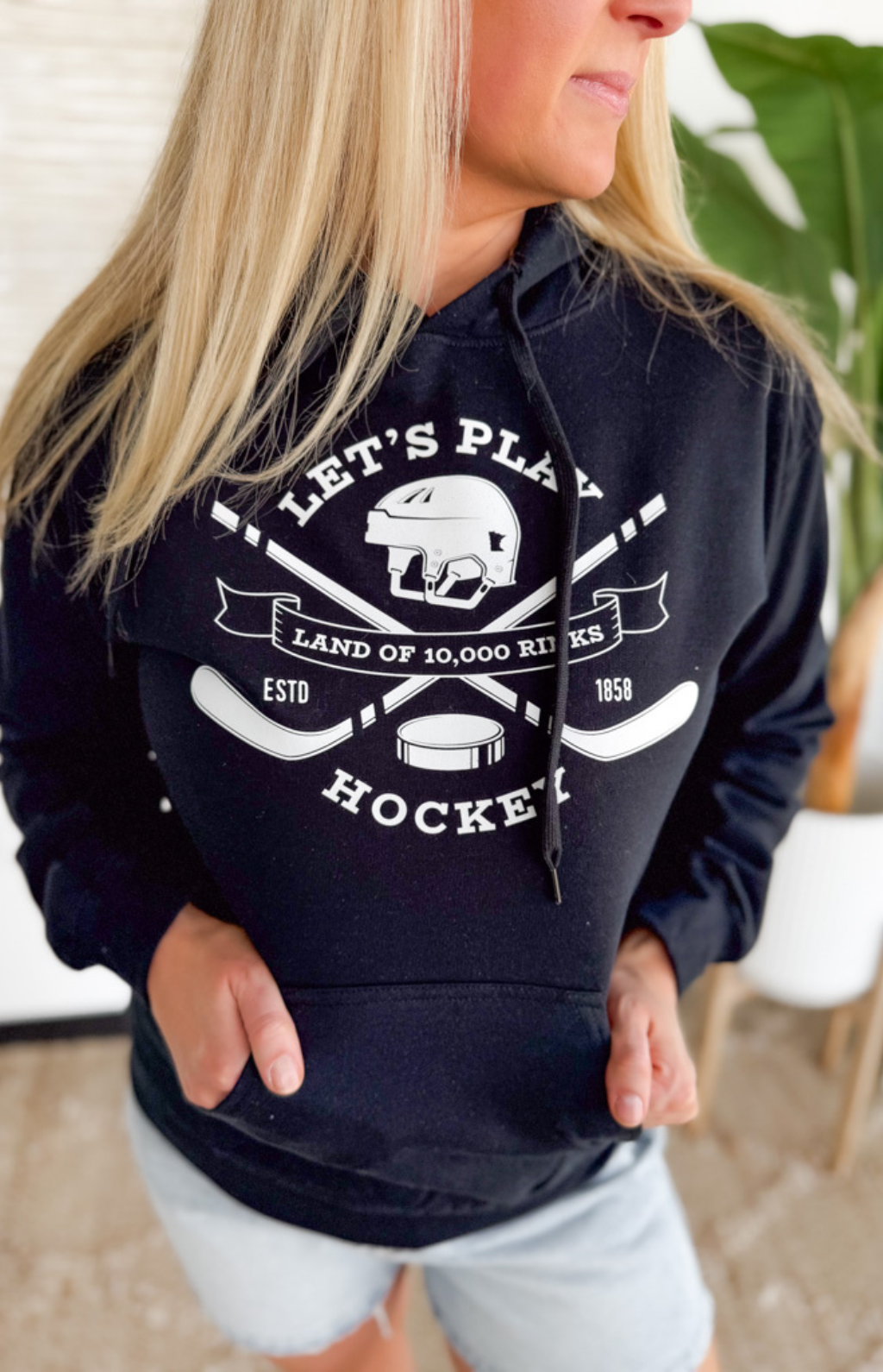 Perfect for any Minnesota hockey family! This hoodie features a "let's play hockey / land of 10,000 ice rinks" design on the front. Warm and stylish for the next game or tournament!