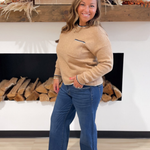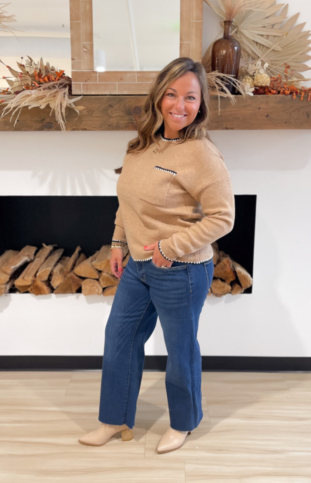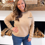 This light camel knit sweater gets a modern upgrade with black and white edge stitching along the hemlines. The subtle detailing adds just the right amount of contrast, giving this classic piece a fresh, updated look. Soft and cozy, it’s designed with a relaxed fit that makes it easy to wear all day long. The neutral camel color pairs effortlessly with denim, trousers, or skirts, making it a versatile go-to. Chic with a touch of edge, this sweater is perfect for everyday wear with a polished twist.