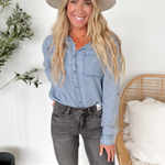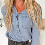 This lightweight chambray button-down is the ultimate everyday staple. Soft and breathable, it’s perfect for layering or wearing on its own for a relaxed, polished look. The classic light denim color pairs effortlessly with everything from jeans to skirts, while the long sleeves and button-down front keep it versatile for any season. Easy to throw on for work, errands, or weekend outings, it’s a timeless piece that keeps you looking put-together with minimal effort.