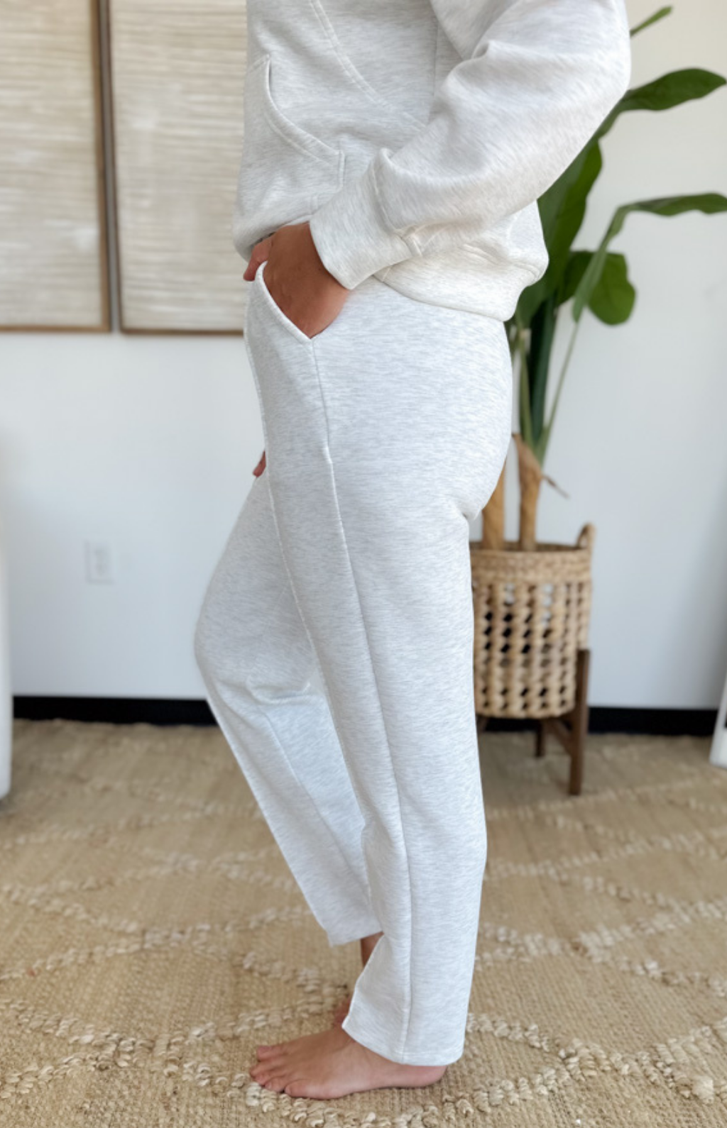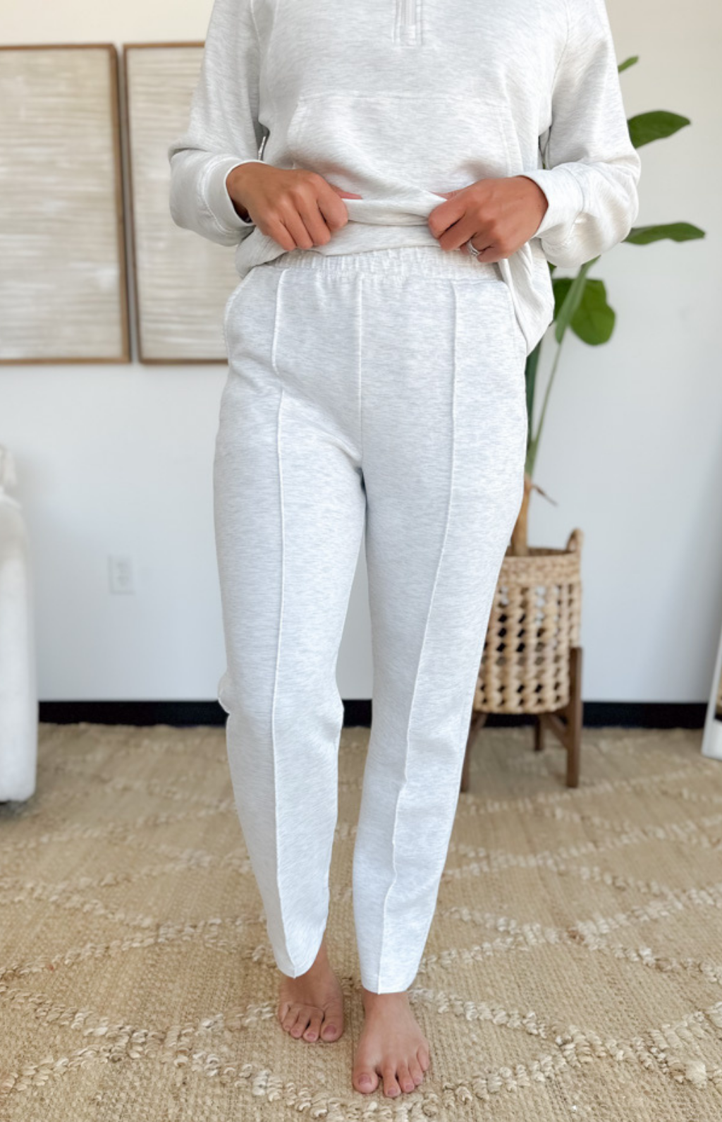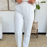 These light grey scuba pintuck pants are where polished meets sporty. Made from a soft modal-poly blend with a spongy scuba feel, they offer all-day comfort with an elevated edge. The pintuck detailing down the front adds a tailored touch, while the athletic-inspired fabric gives them a sleek, modern vibe. Perfect for dressing up with a blazer or keeping casual with a tank and sneakers!