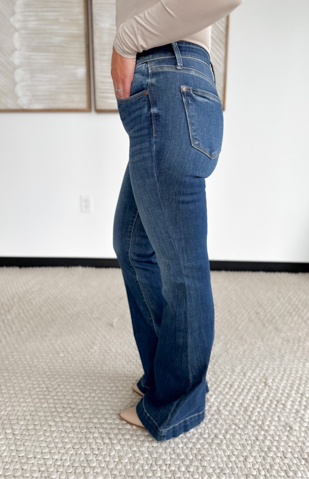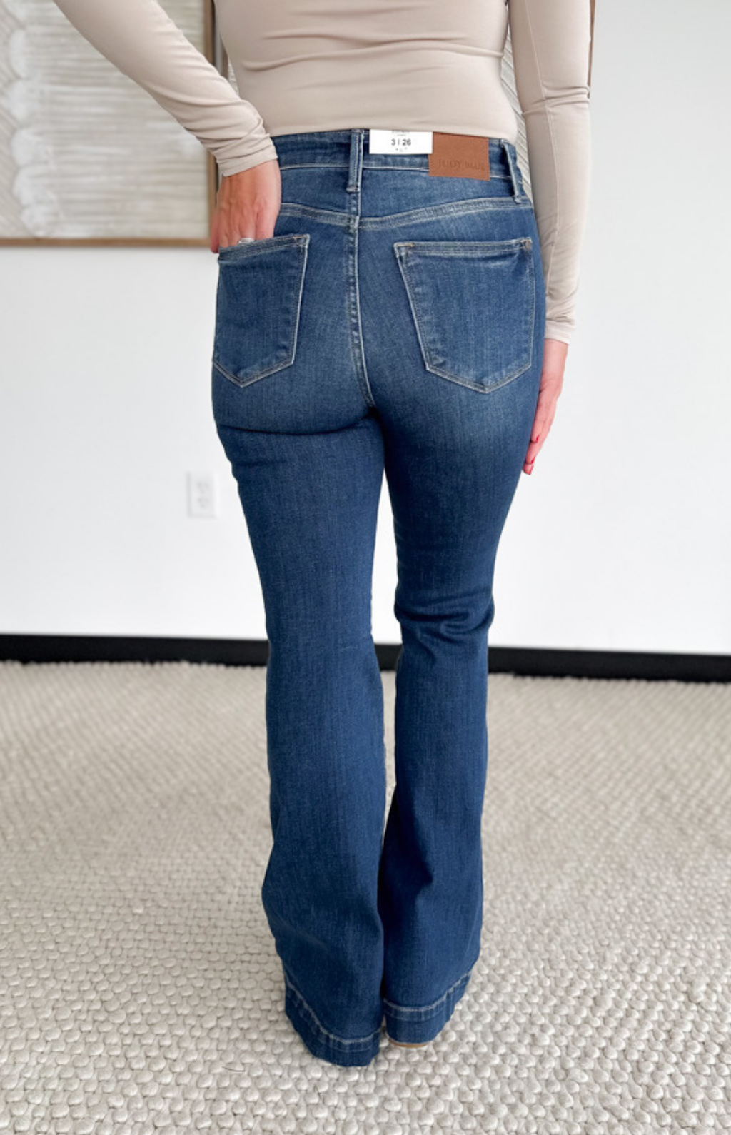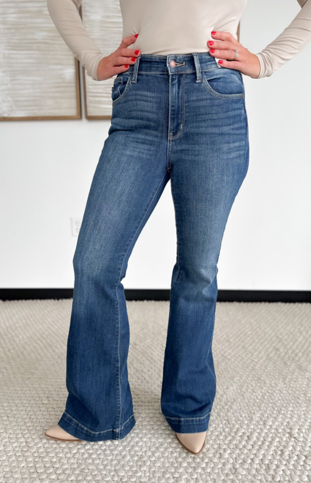 These medium wash flare jeans are a timeless denim staple with a flattering, modern fit. Designed with a high-rise waistband, they smooth and shape in all the right places while offering all-day comfort. The clean, no-distressing finish keeps them polished and versatile—perfect for dressing up with a blouse or keeping it casual with a cozy sweater. With their classic flare leg, these jeans give you that effortlessly elongating look that never goes out of style.