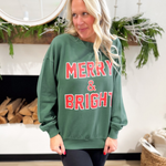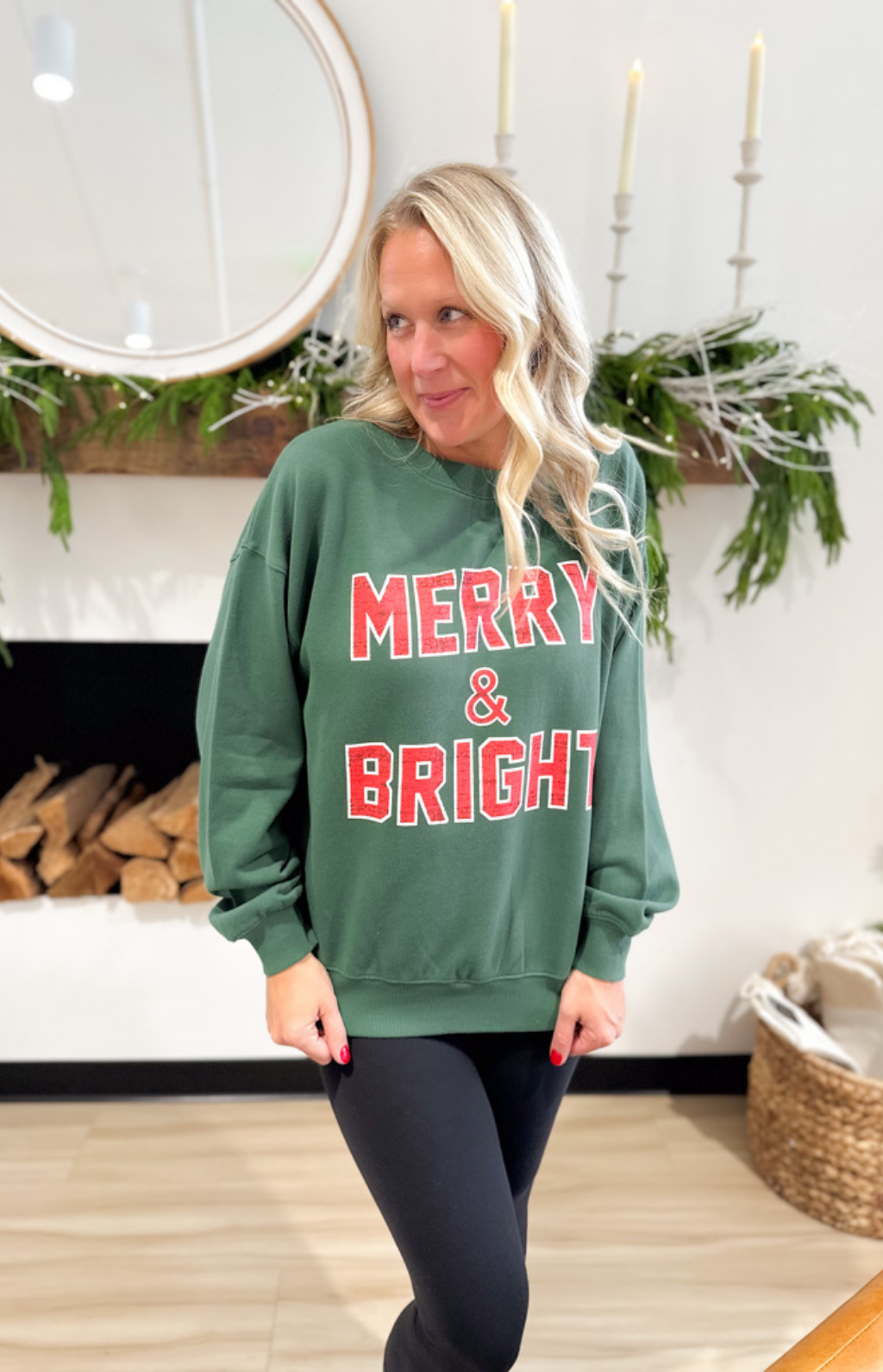 This green crewneck sweatshirt is the perfect way to spread a little holiday cheer. The bold red “Merry & Bright” graphic across the front adds a festive pop of color that’s full of Christmas spirit. Made from soft, cozy fabric with a classic relaxed fit, it’s perfect for everything from decorating the tree to cozy nights by the fire. Pair it with jeans or leggings for an easy, cheerful holiday look. Comfortable, cute, and perfectly merry—this sweatshirt is made for the season!