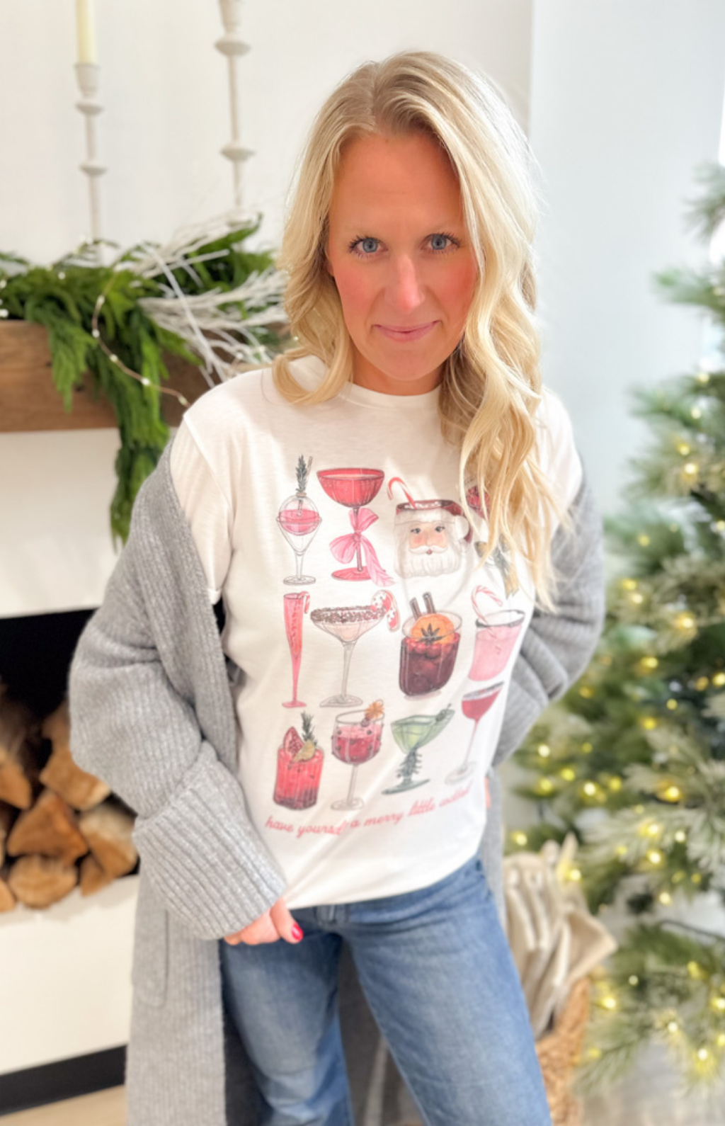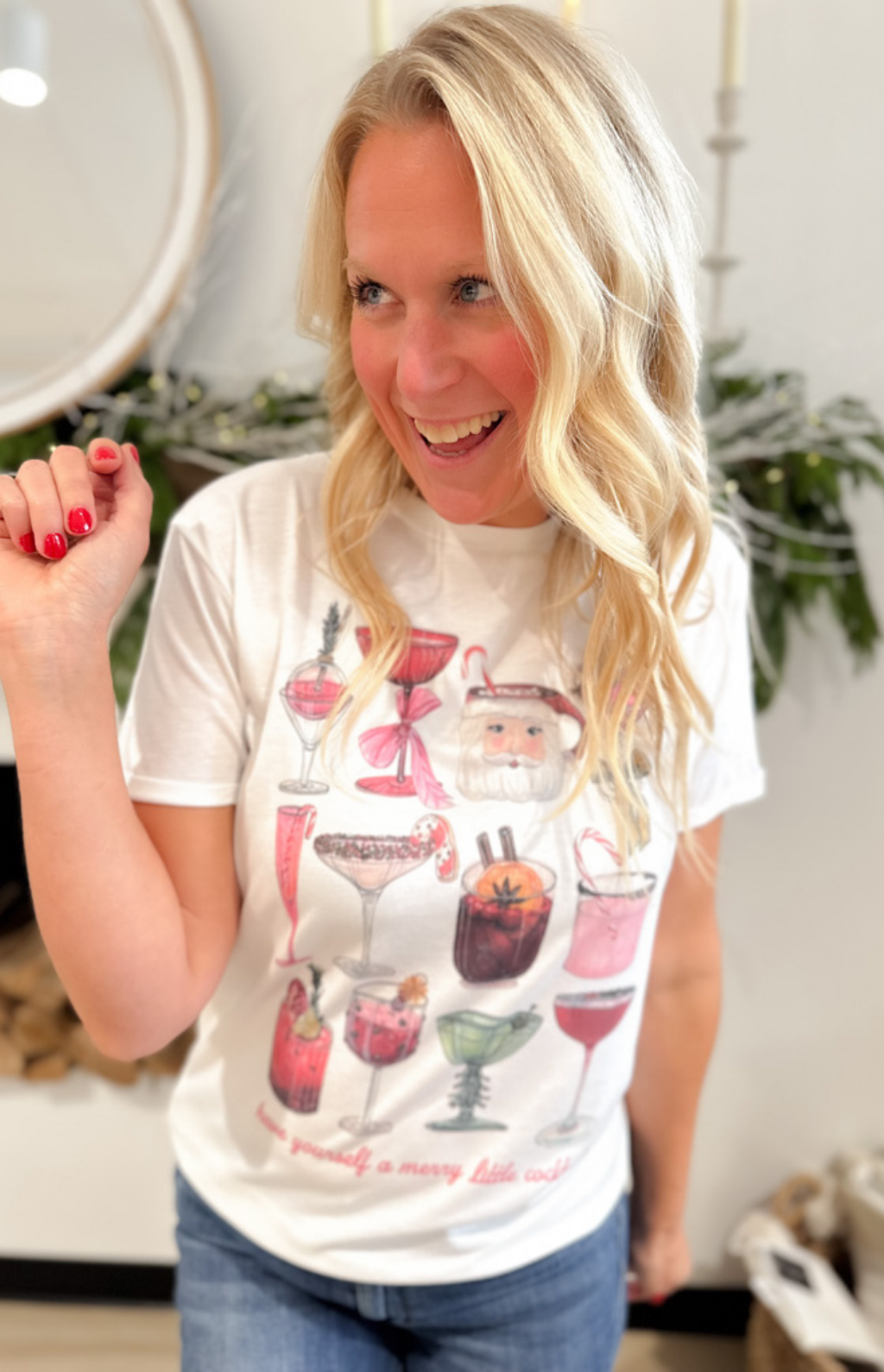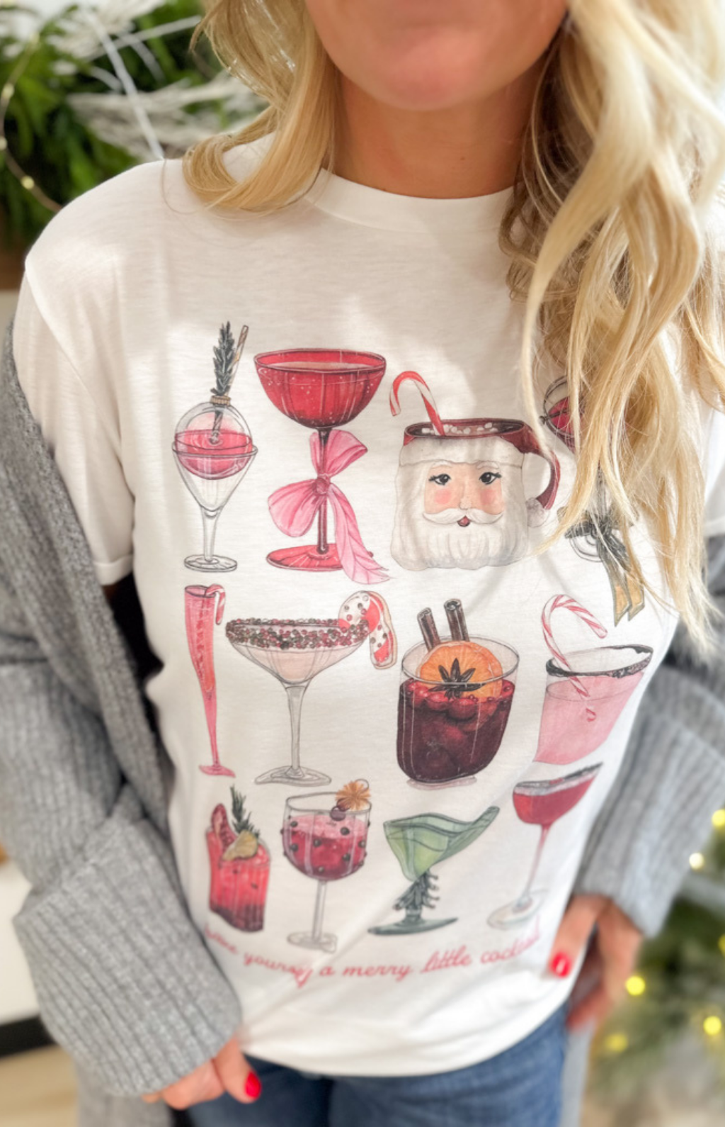 Get in the holiday spirit with this festive white tee featuring a playful Christmas cocktail design on the front! The soft, lightweight fabric makes it comfy enough for all-day wear—whether you’re mixing up holiday cheer in the kitchen or wrapping gifts by the fire. The cheerful design adds just the right pop of fun to your casual looks, pairing perfectly with jeans, leggings, or a cozy cardigan. It’s that easy, merry piece that instantly puts you in a holiday mood—like your favorite seasonal sip in T-shirt form!