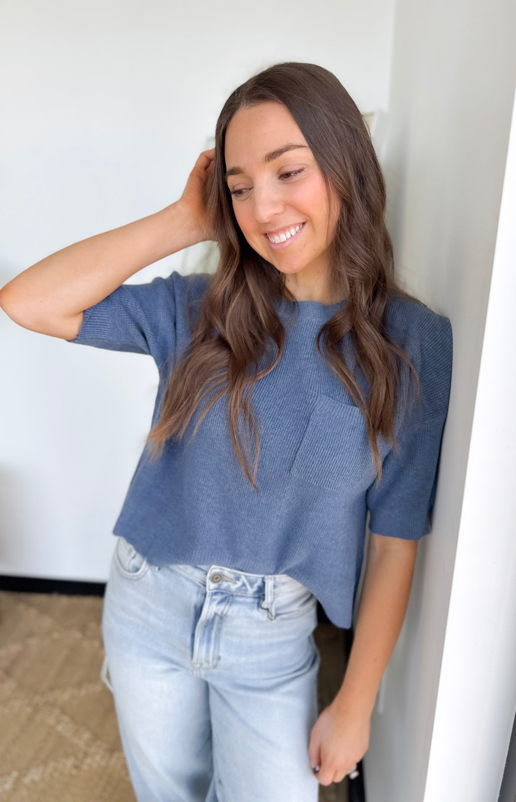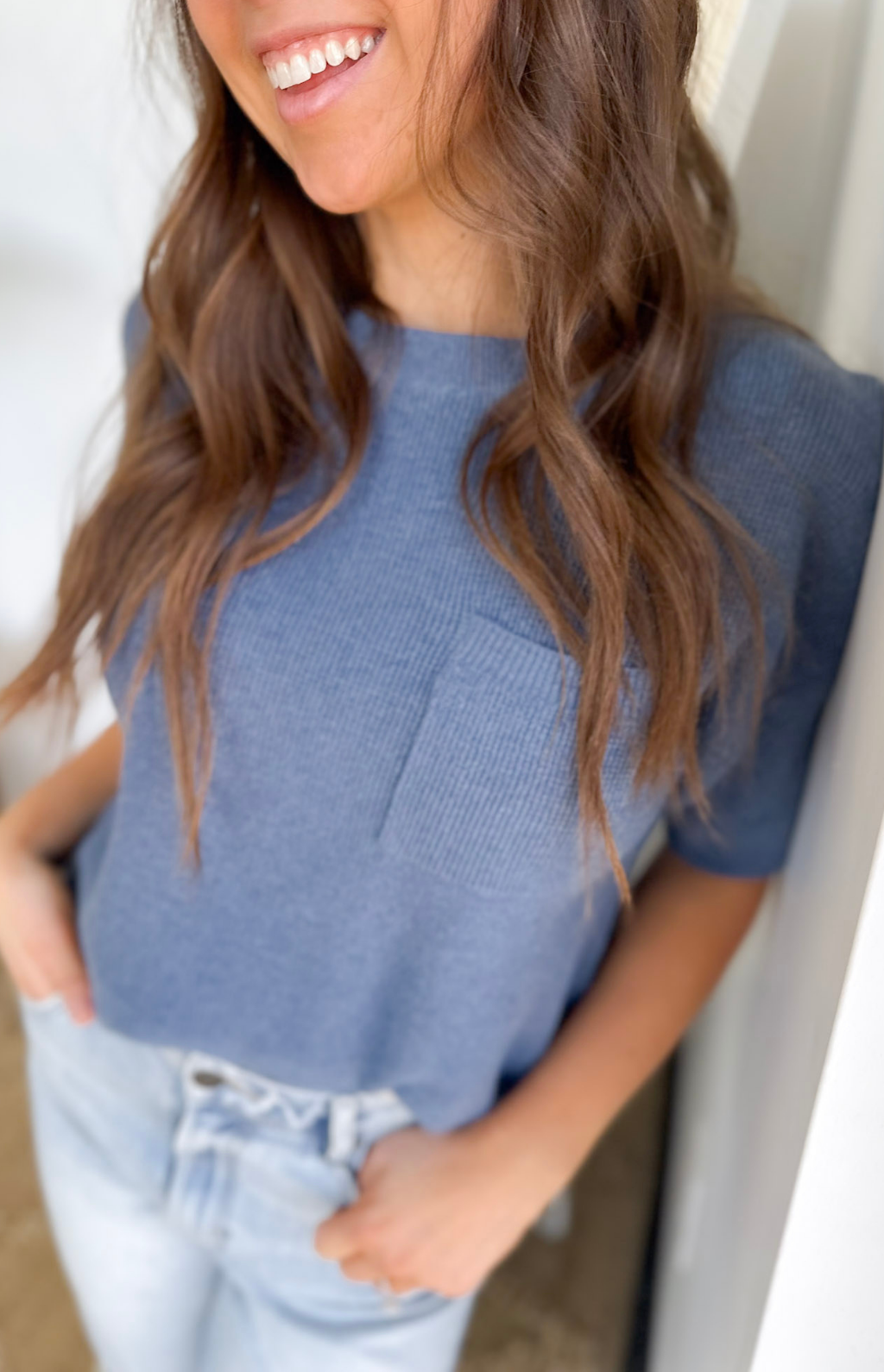 This mini waffle knit blue short sleeve top is one of those everyday basics that feels anything but boring. The lightweight waffle texture adds just the right amount of detail, while the soft knit keeps it comfy and breathable for all-day wear. It’s perfect for busy days when you want something easy that still looks cute and put together.