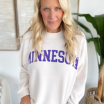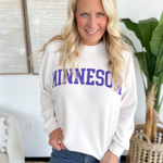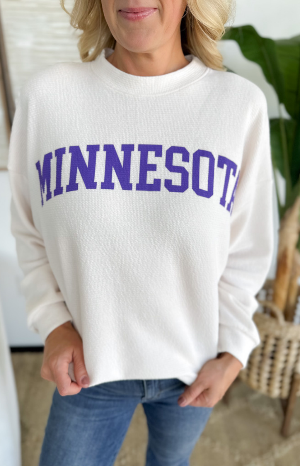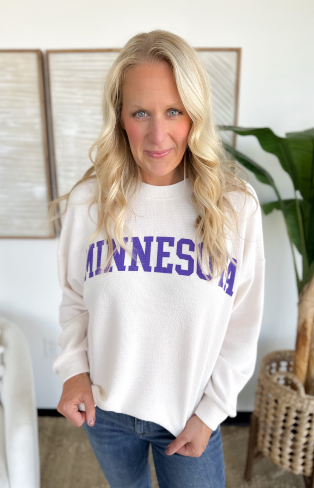 This cream knit pullover is cozy, casual, and full of charm. The soft knit fabric keeps you comfortable all day, while the bold “Minnesota” lettering in purple adds a playful, spirited touch. With its relaxed fit and classic pullover style, it’s perfect for layering over jeans or leggings for errands, weekends, or cozy days at home. Easy to wear and effortlessly stylish, it’s a go-to piece that shows off your state pride with comfort and flair.