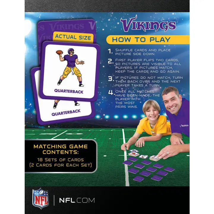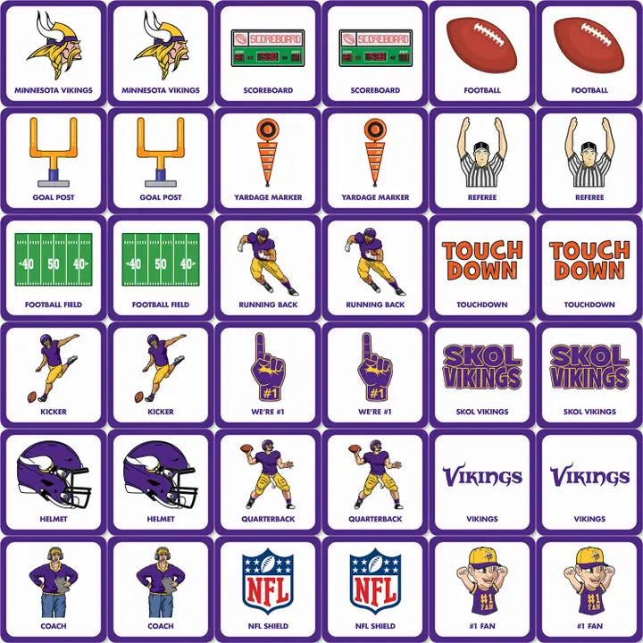 Challenge your memory and show off your team spirit with this officially licensed NFL matching game featuring the Minnesota Vikings. Perfect for fans of all ages, this engaging Minnesota Vikings matching game includes 18 pairs of unique symbols, making it a fun addition to any Minnesota Vikings collection or a thoughtful choice among Minnesota Vikings gifts for men, women, or kids.