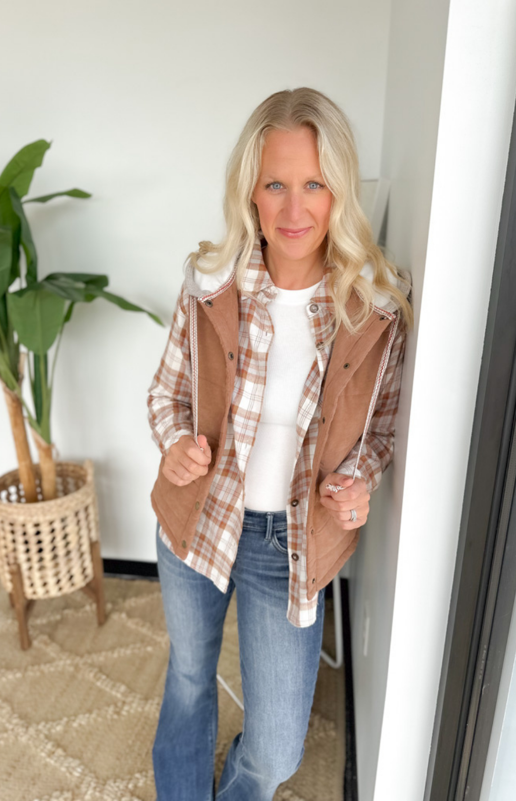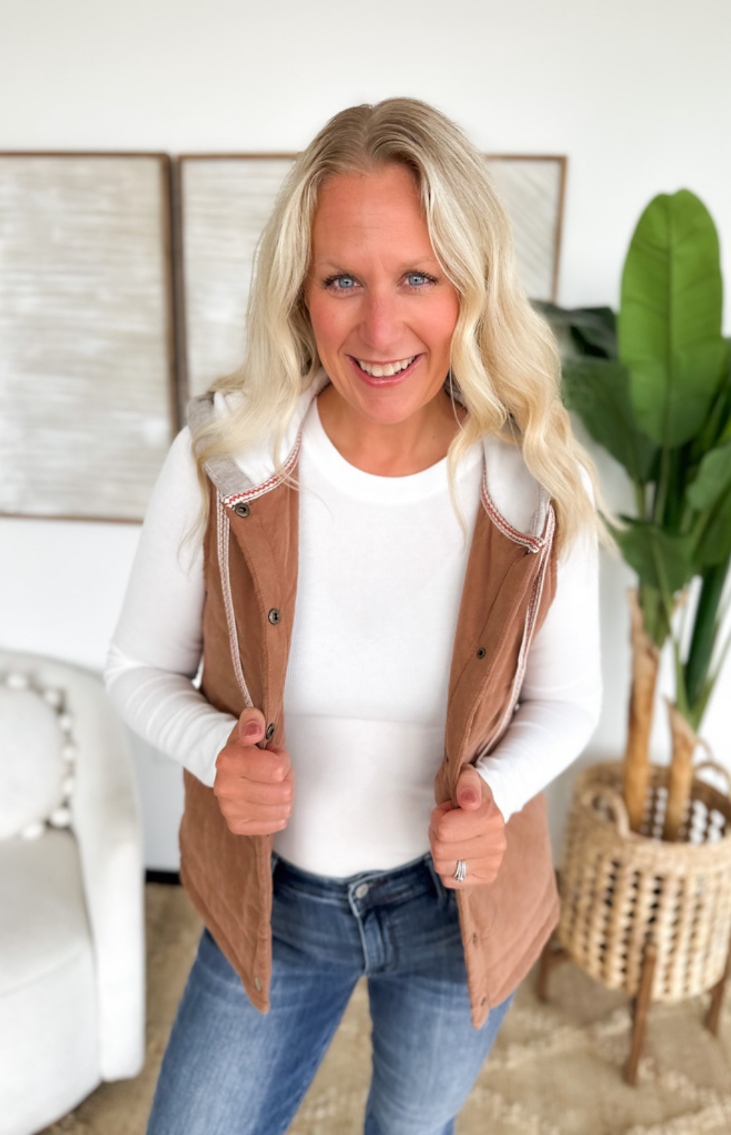 This mocha button-up puffer vest with a hood is your go-to for layering when the temps start to dip. The padded design keeps you warm without adding bulk, while the hood adds an extra layer of protection for windy or rainy days. Its button-front closure gives it a polished touch, making it easy to style over sweaters, flannels, or long sleeves. Perfect for running errands, weekend walks, or casual outings—it’s the versatile layer your cold-weather wardrobe needs!
