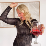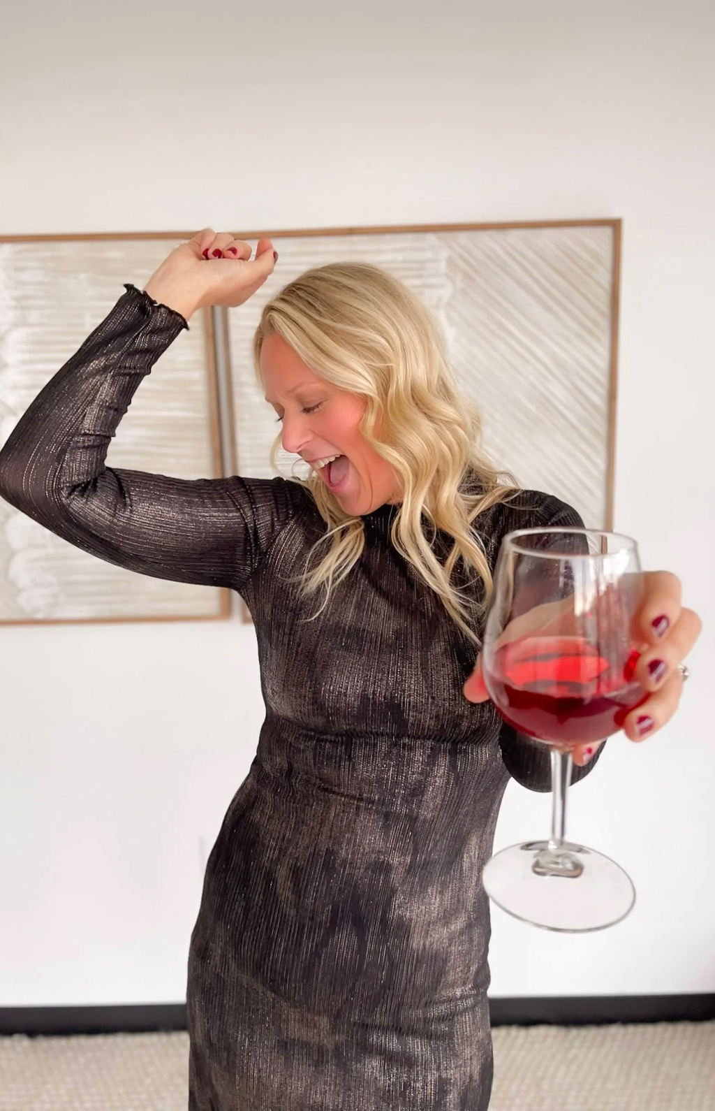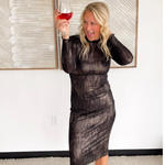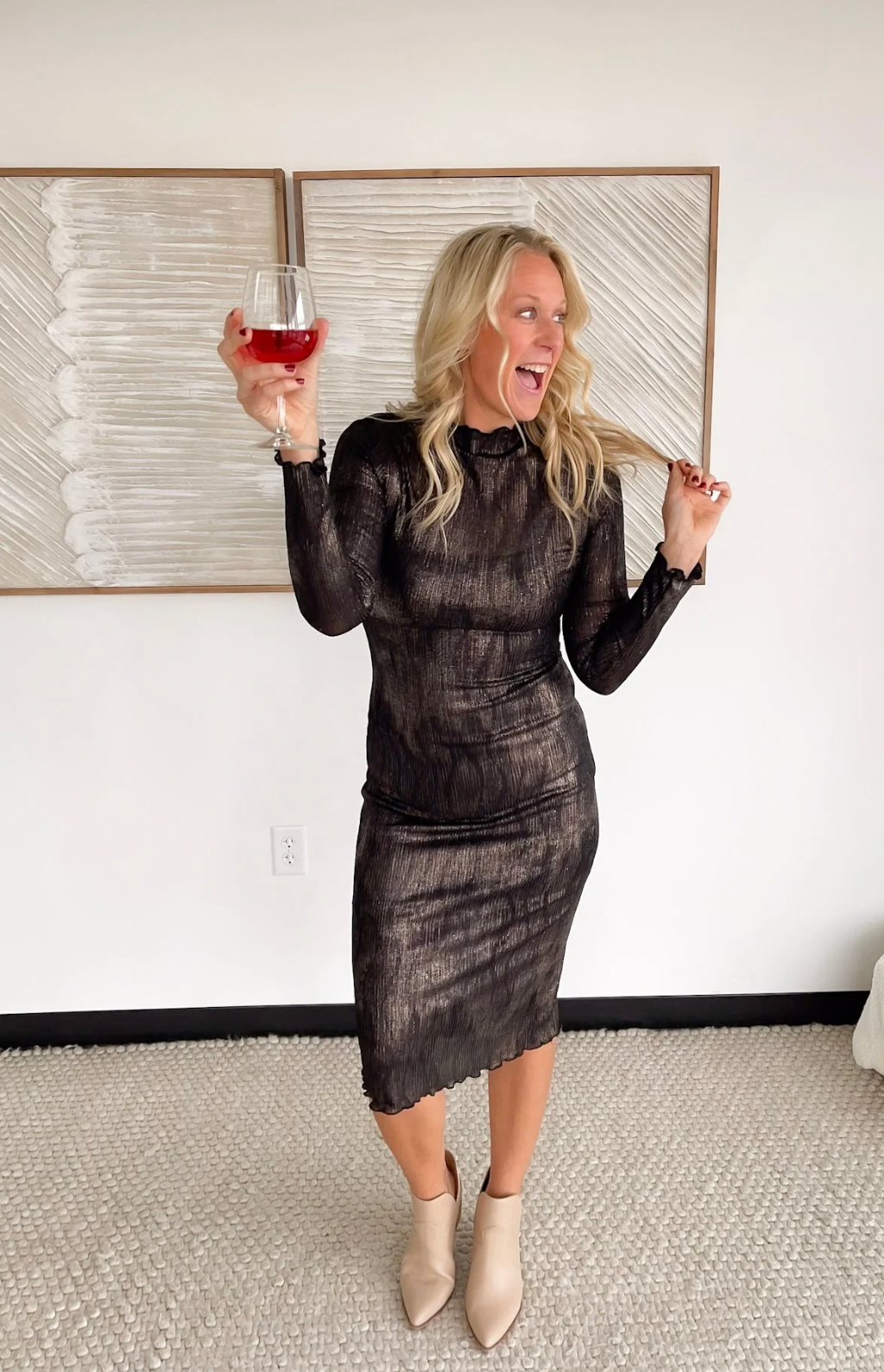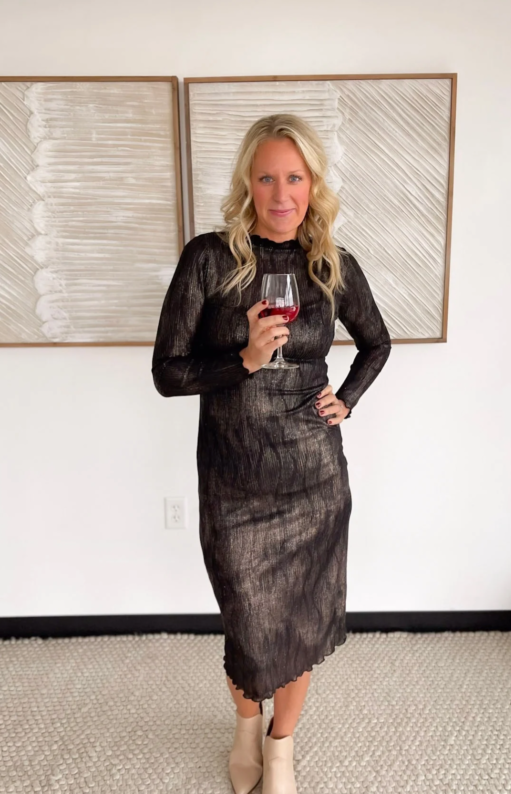 This fitted midi dress is your secret weapon for those nights you want to shine without overthinking a thing. The black knit is sleek and stretchy, and those gold shimmer accents give it just the right amount of sparkle—eye-catching but still classy. The mock neckline keeps the look polished, while the separate lining underneath makes it feel smooth, secure, and totally worry-free. It hugs in all the right places but still lets you move comfortably, whether you're heading to dinner, a holiday event, or a special night out. Slip it on and let the glow do the talking.