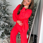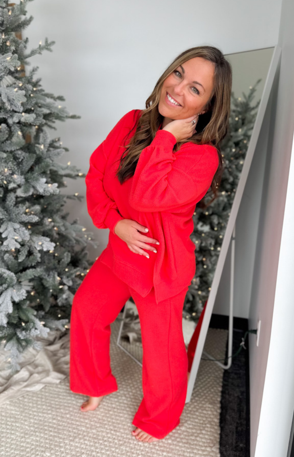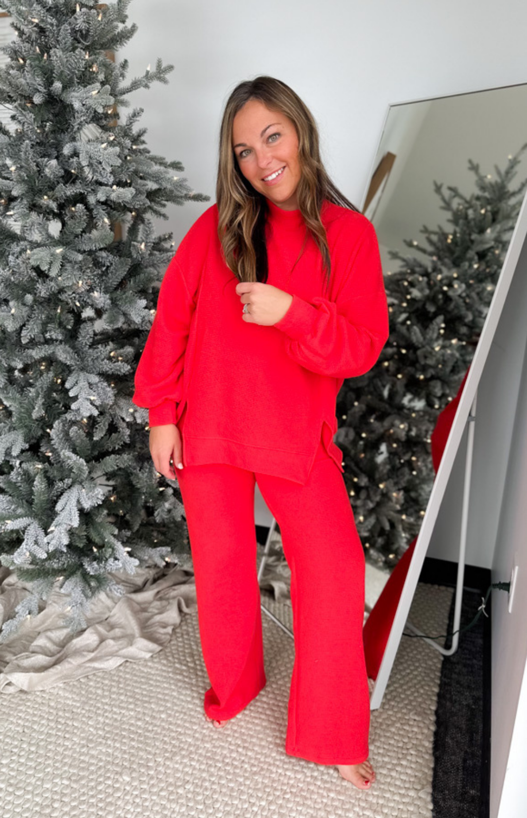 Get holiday-ready in this cozy red knit pullover set! The relaxed-fit pullover features stylish side slits for ease and a flattering silhouette that pairs well with the matching red pants that create a perfectly coordinated look that’s both comfortable and festive. Soft, warm knit fabric keeps you cozy during winter gatherings, and the sharp red hue adds that seasonal cheer. Whether you’re sipping cocoa by the fire, hosting family brunch, or lounging in style, this set makes celebrating effortless and chic. It’s the ultimate mix of comfort, style, and holiday spirit.