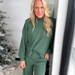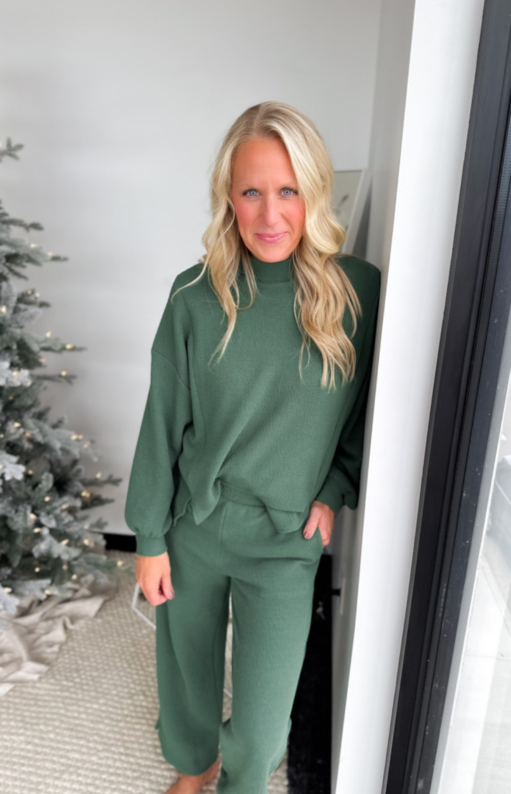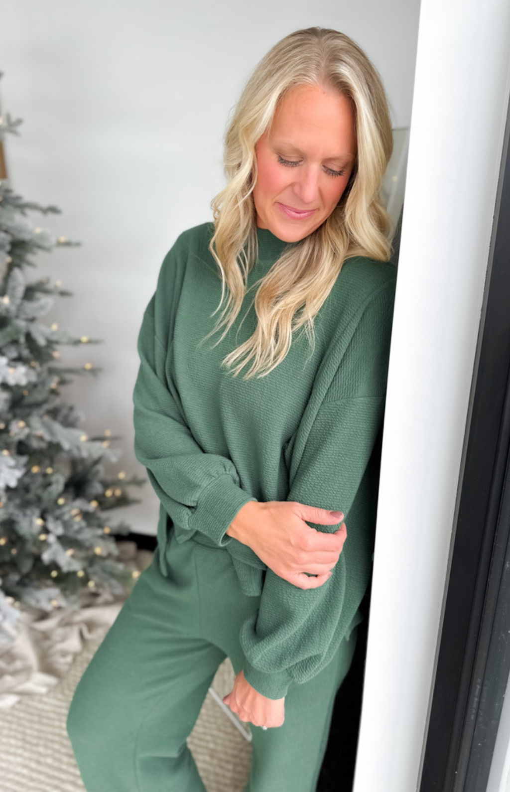 Get holiday-ready in this cozy green knit pullover set! The relaxed-fit pullover features stylish side slits for ease and a flattering silhouette that pairs well with the matching green pants that create a perfectly coordinated look that’s both comfortable and festive. Soft, warm knit fabric keeps you cozy during winter gatherings, and the rich green hue adds that seasonal cheer. Whether you’re sipping cocoa by the fire, hosting family brunch, or lounging in style, this set makes celebrating effortless and chic. It’s the ultimate mix of comfort, style, and holiday spirit.