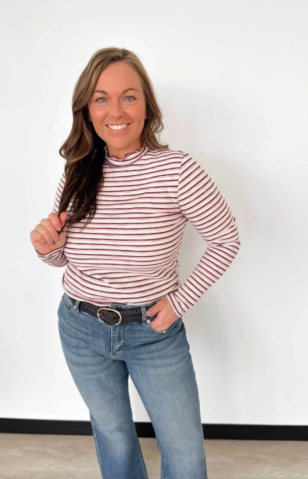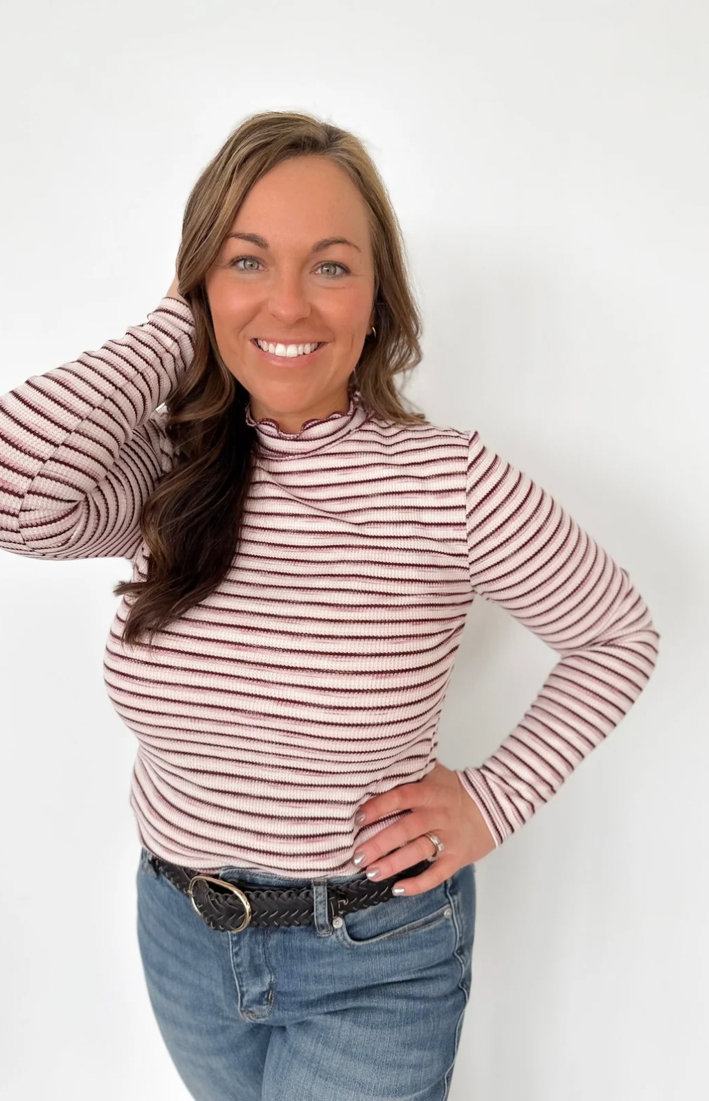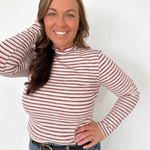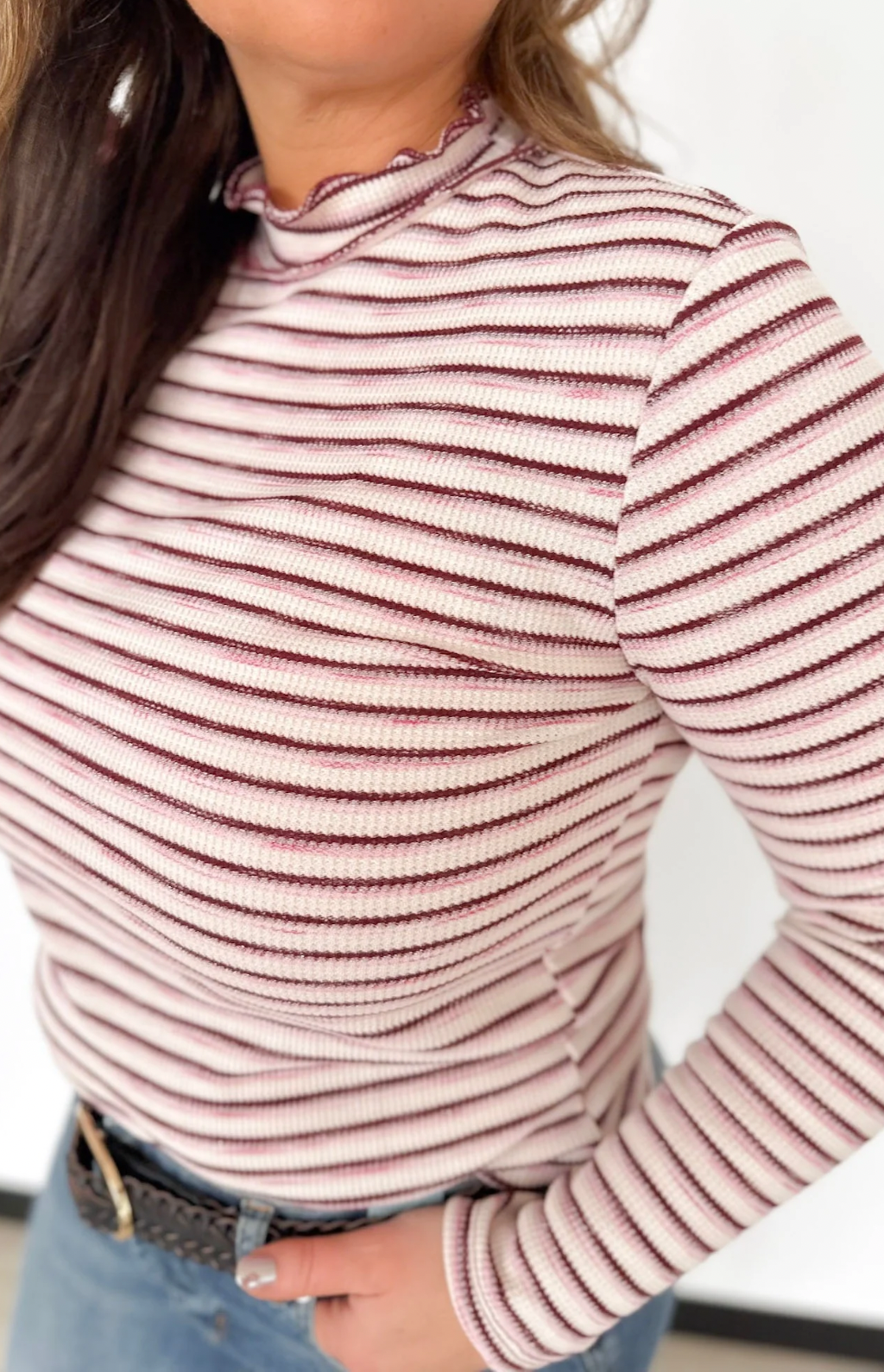 This fitted waffle knit top is a fun mix of cozy and festive, featuring a flattering mock neckline and a playful stripe detail in cream, maroon, pink, and just the right touch of sparkle. The textured knit hugs in all the right places without feeling restrictive, making it perfect for layering or wearing on its own. The sparkle stripe adds a subtle pop of personality that elevates your everyday look. Pair it with jeans or skirts for a put-together outfit in minutes. It’s the kind of top that makes you feel stylish and confident, even on your busiest days.