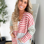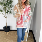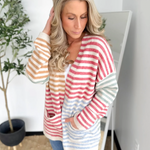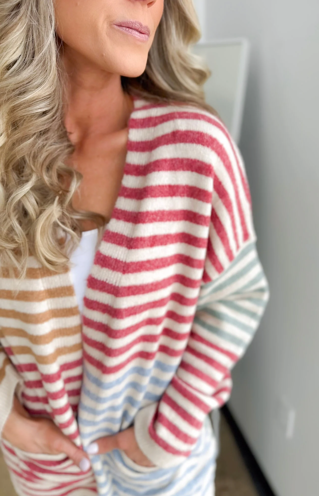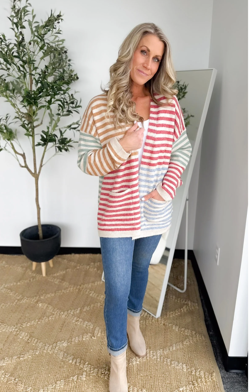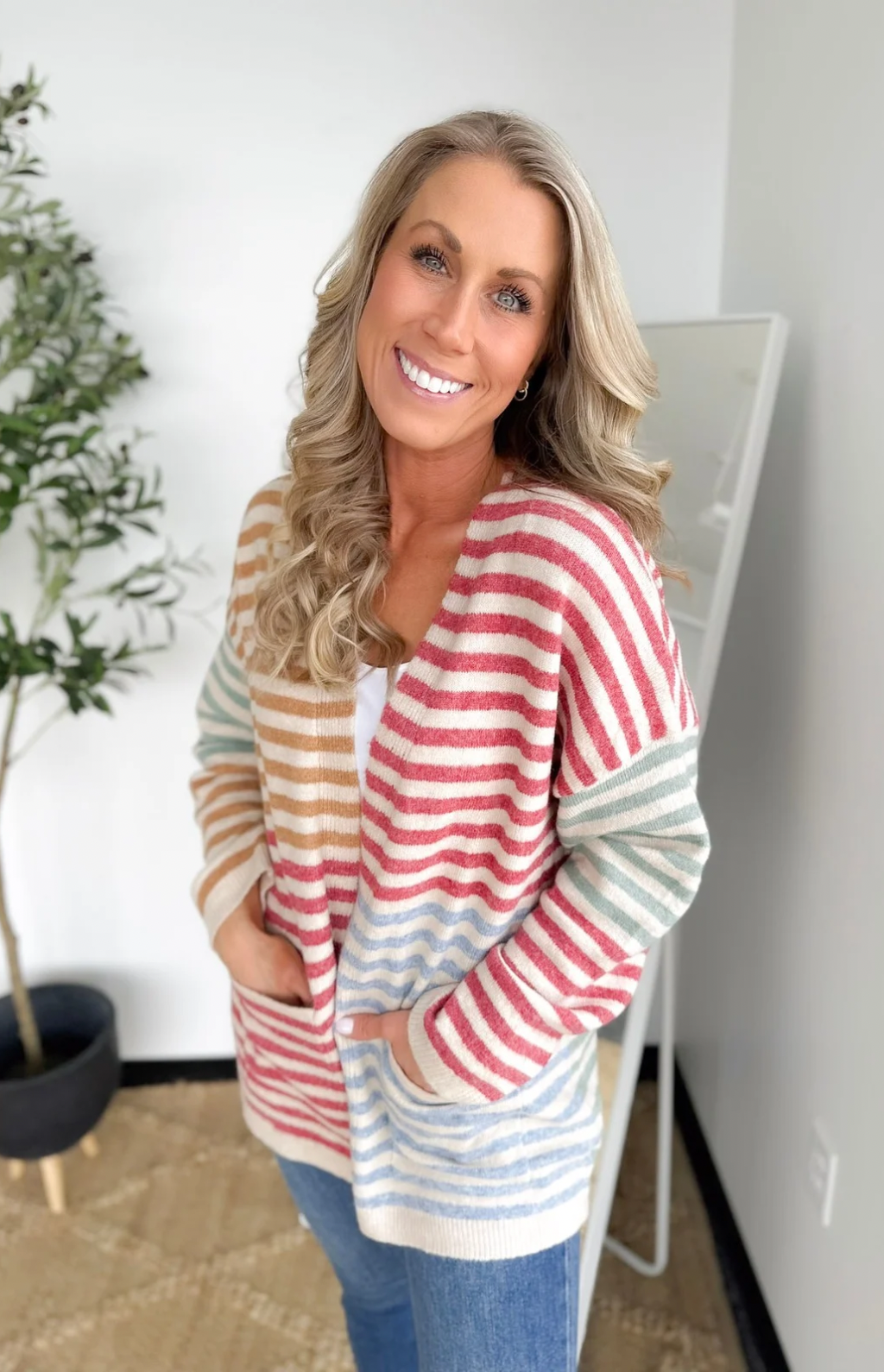 This lightweight knit cardigan brings all the cheerful, easygoing vibes with its multicolored stripe pattern. It’s the perfect layer when you want something breezy but still put-together, whether you’re running to the office or chasing kids to activities. The open-front design makes it effortless to toss on over a tee or tank, giving you instant color and comfort without any fuss. It drapes beautifully, adding a touch of softness to your everyday outfits. This is one of those grab-and-go cardigans that makes even the simplest look feel fun and fresh.