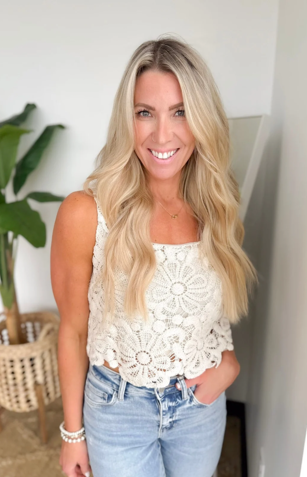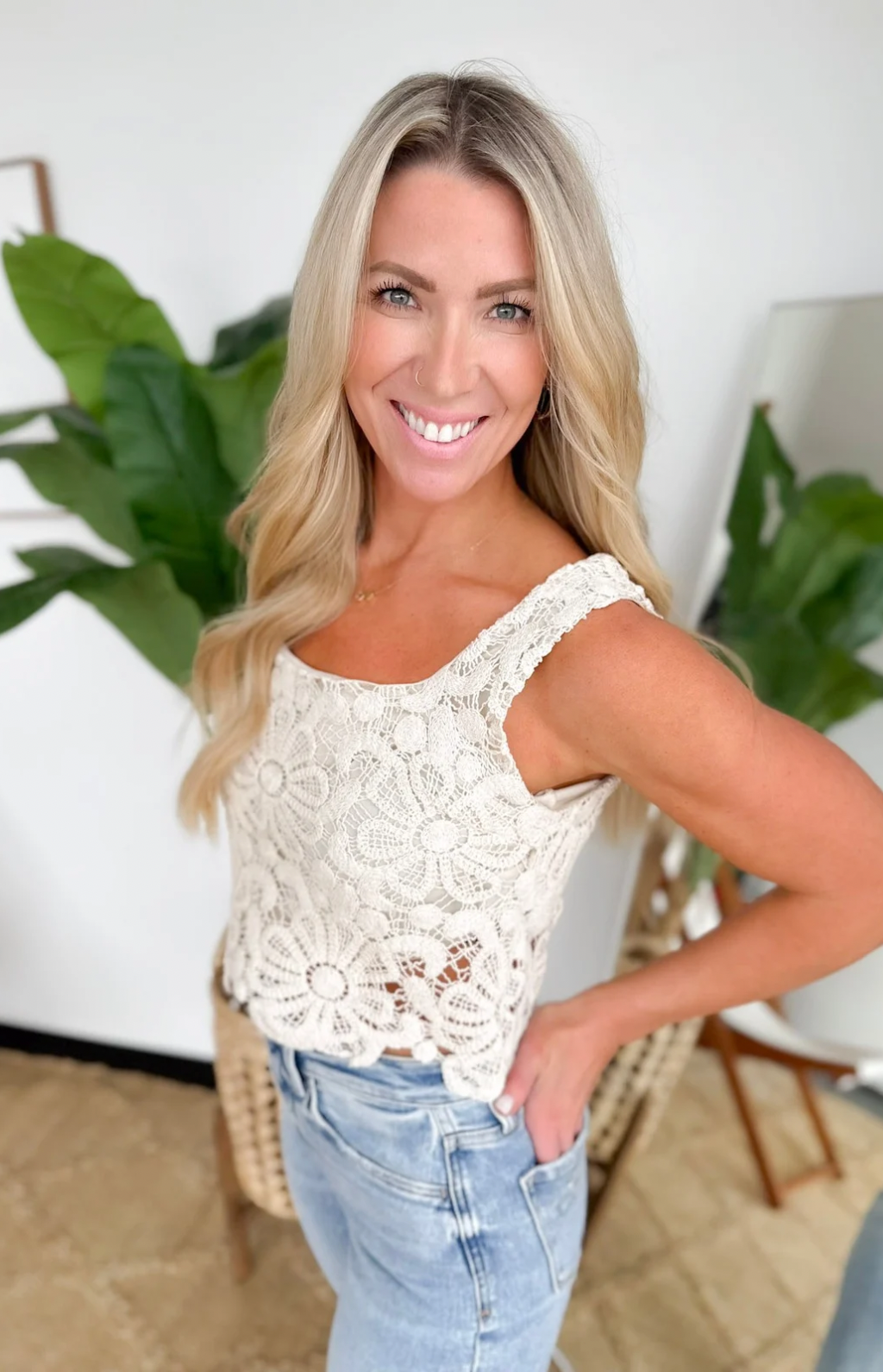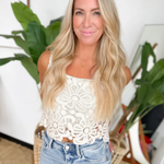 This floral crochet tank is such a pretty little statement for warm days. The natural hue keeps it soft and easy to style, while the square neckline and cropped fit give it a modern, flattering shape. The crochet detail adds that gorgeous texture you’ll love, and it’s fully lined so you can wear it with confidence and zero fuss. Pair it with high-waisted denim or a breezy skirt and you’ve got an instant outfit that feels feminine, fresh, and totally effortless.