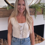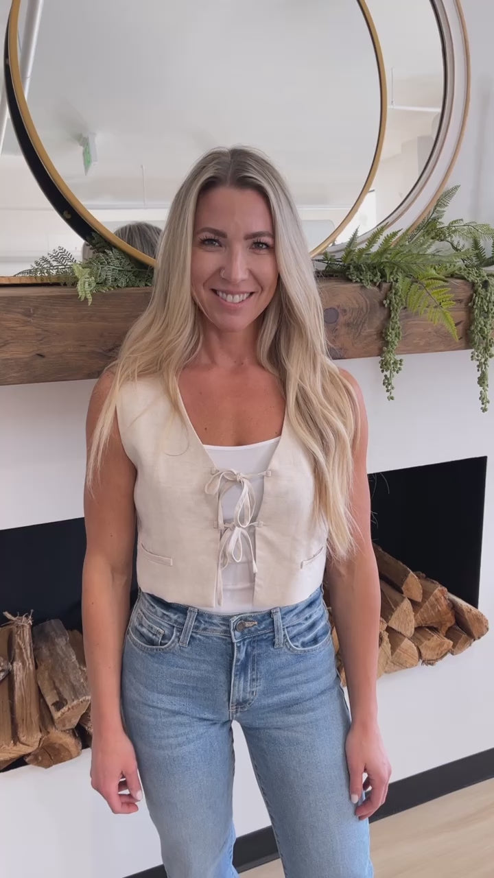 You will feel sleek and sophisticated in the new Linen Front Tie Vest all season long! This top features a gorgeous natural hue and a sleeveless style with a trendy front tie design. This versatile piece for chic layering or style on its own! Style with the matching skirt for a stunning look!