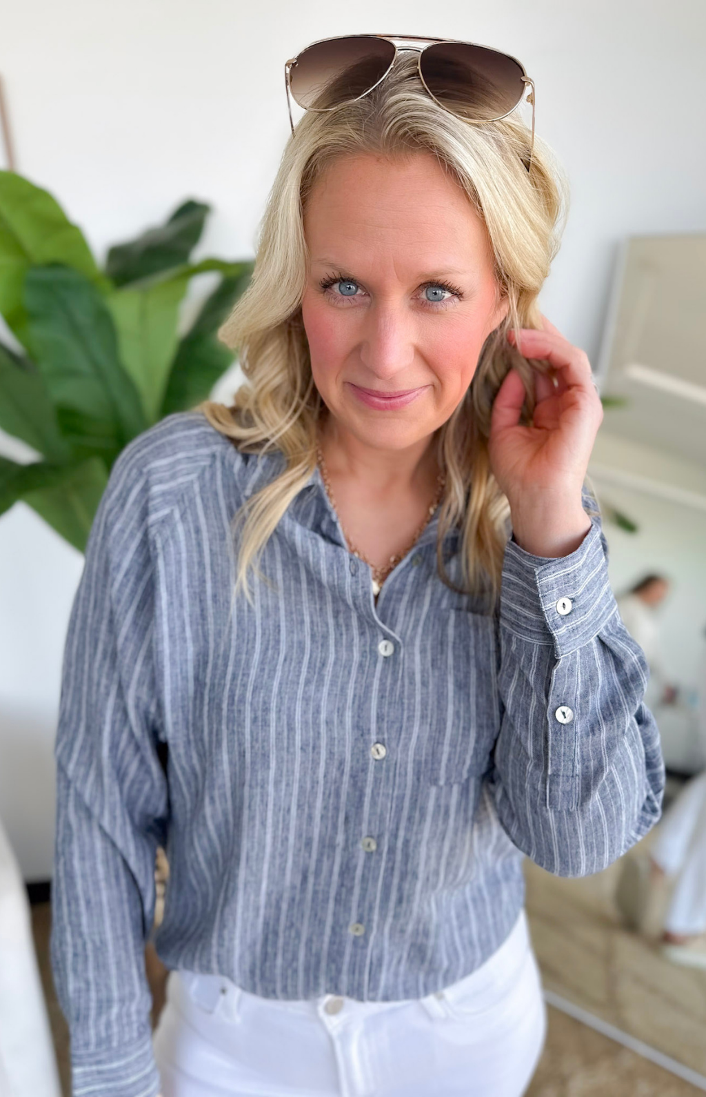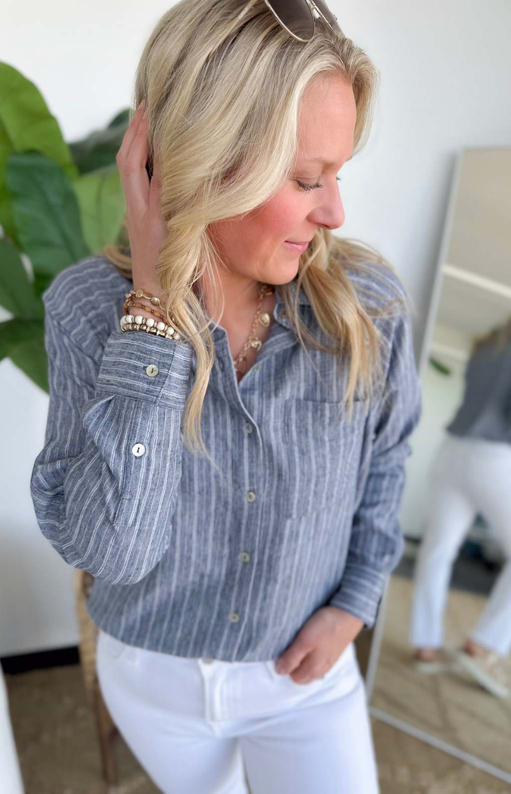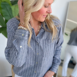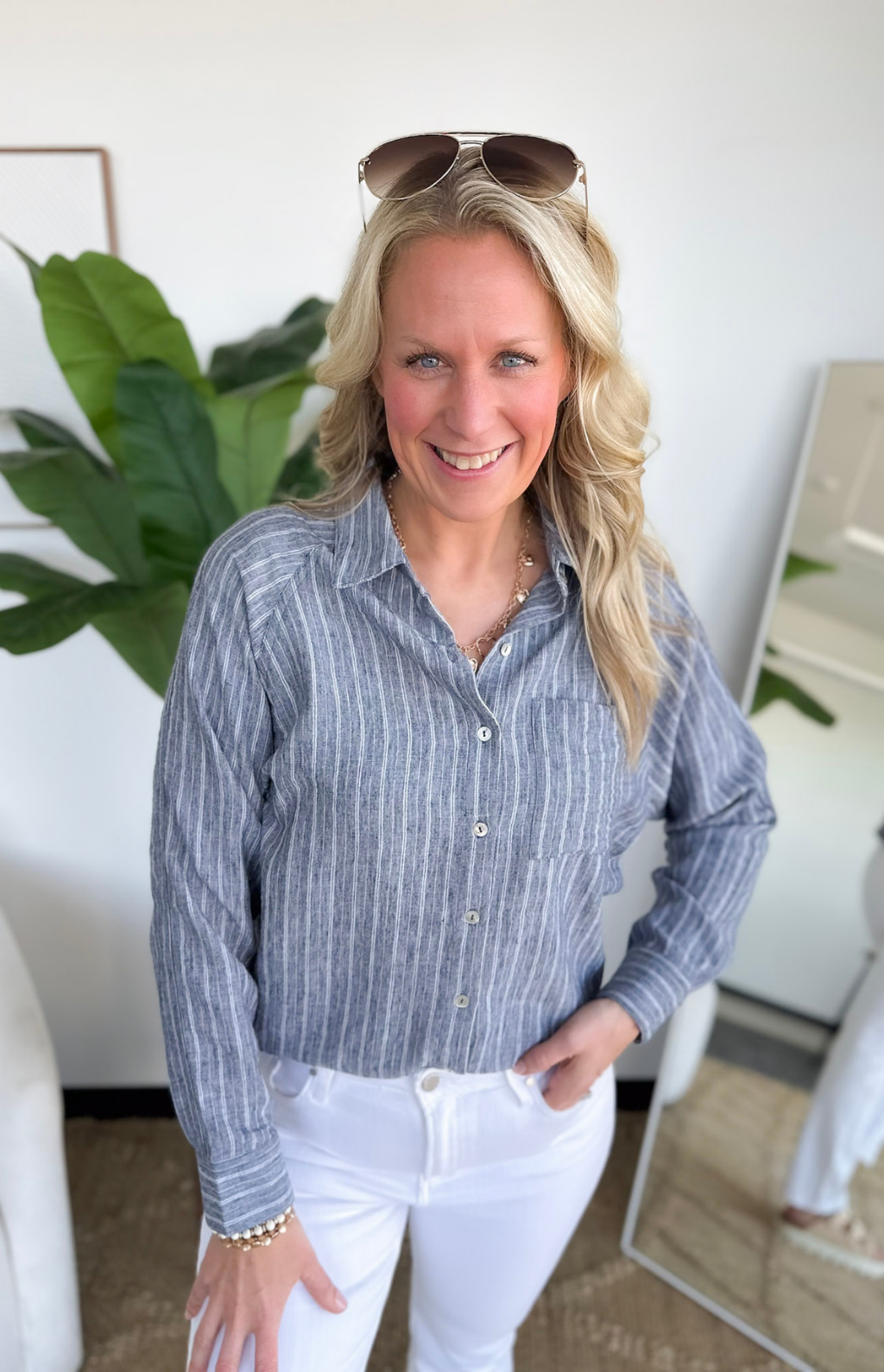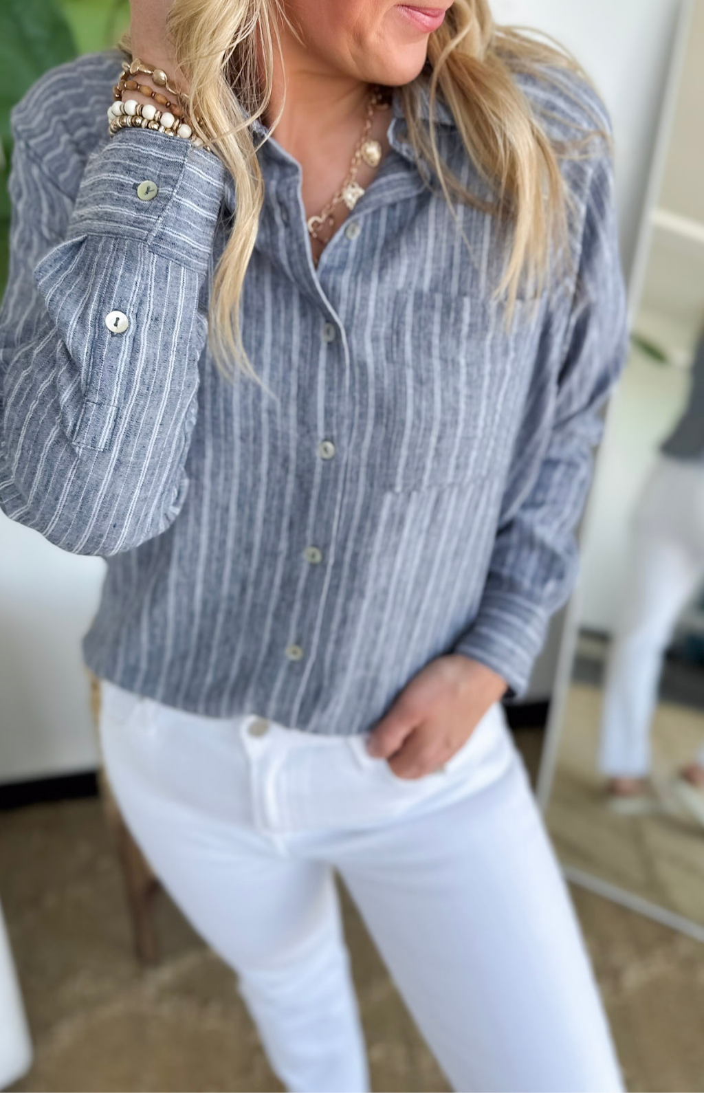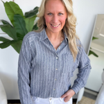 This navy striped button-down is one of those pieces that instantly makes you look pulled together. The classic collar and crisp button-front give it that polished feel, while the stripes keep it fresh and easy to wear. It’s lightweight and breathable, so you can tuck it into jeans for work or leave it slightly relaxed with shorts for weekend plans.