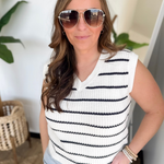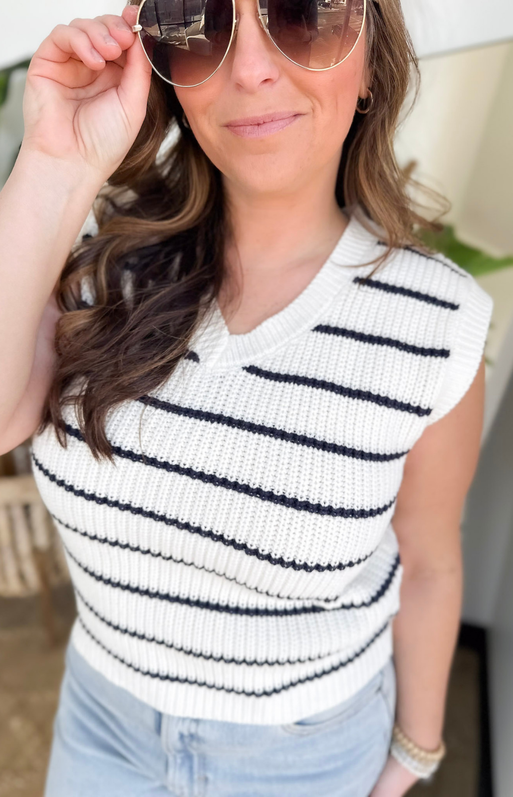 This cream knit v-neck sweater vest with navy stripes is such a fresh, easy piece for spring and summer styling. The lightweight knit keeps it breathable, while the classic stripe and flattering v-neck give you that clean, polished look without any effort. It’s perfect for layering over a tee or wearing on its own for warmer days.