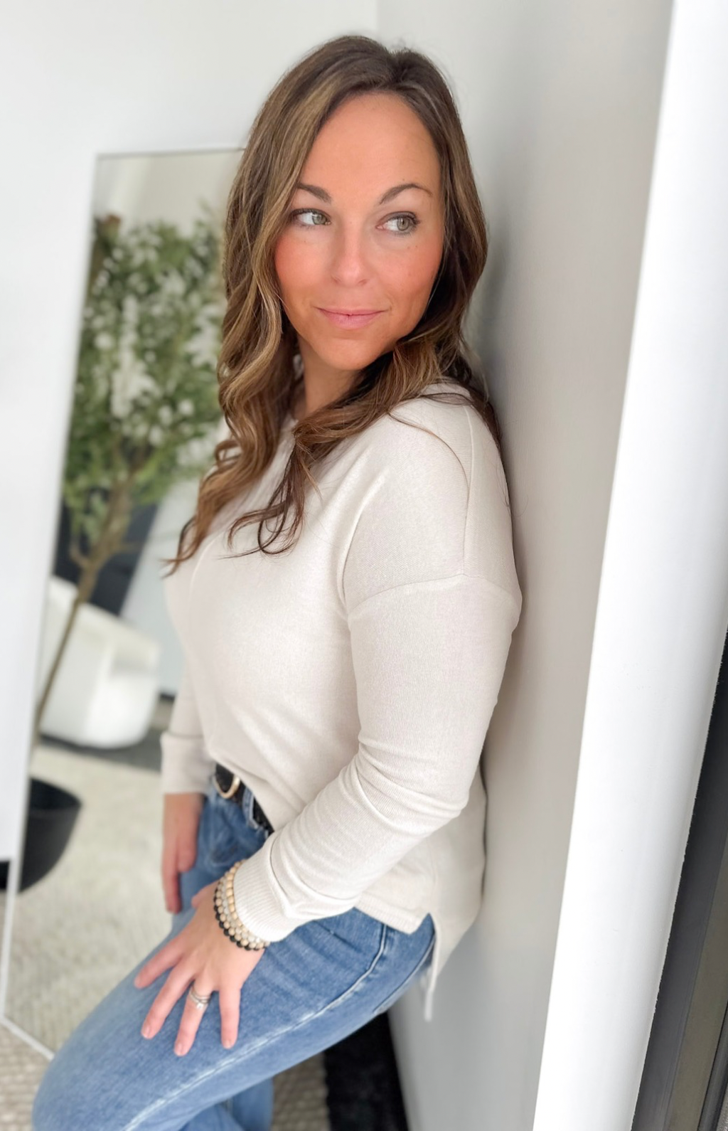 This oatmeal-colored long sleeve top is the ultimate go-to for effortless comfort. Made from soft, brushed material, it feels cozy against your skin without weighing you down. The rounded neckline keeps it classic, while the ribbed hemlines add a subtle, polished touch. Lightweight and easy to layer, it’s perfect for busy mornings, coffee runs, or cozying up at home. Pair it with jeans, leggings, or your favorite joggers for an easy, put-together look in seconds.