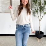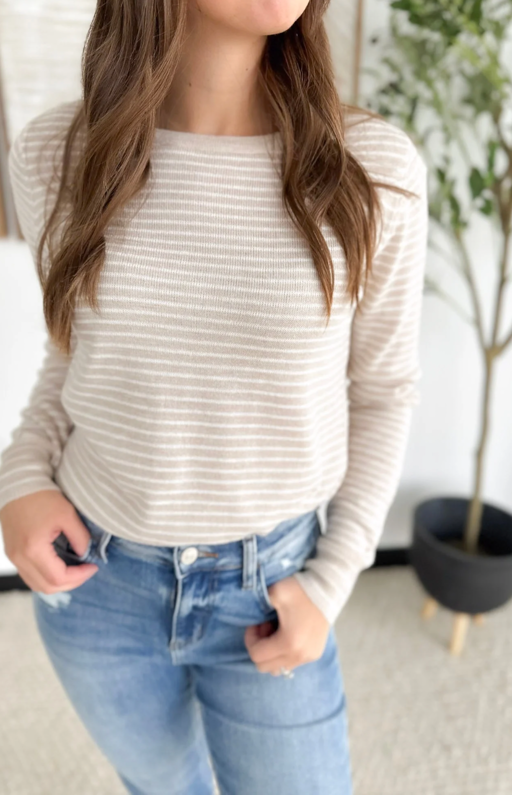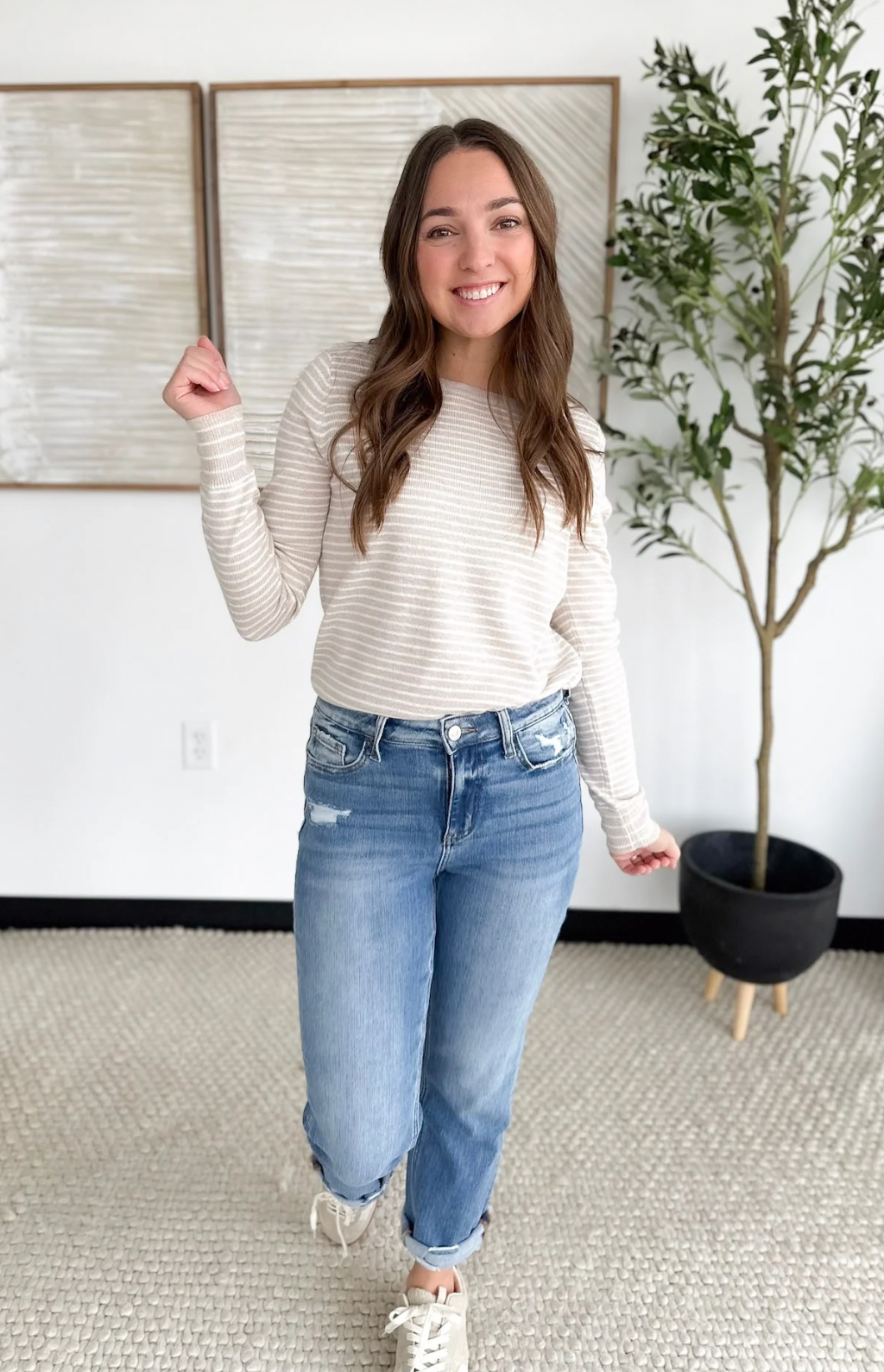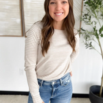This oatmeal and ivory striped long sleeve top is the definition of effortless comfort. The lightweight fabric makes it perfect for layering or wearing on its own, while the soft neutral stripes give it a timeless, easygoing look. With its relaxed fit and breathable feel, it’s an everyday essential you’ll reach for season after season. Pair it with jeans for that simple, laid-back style you love.
