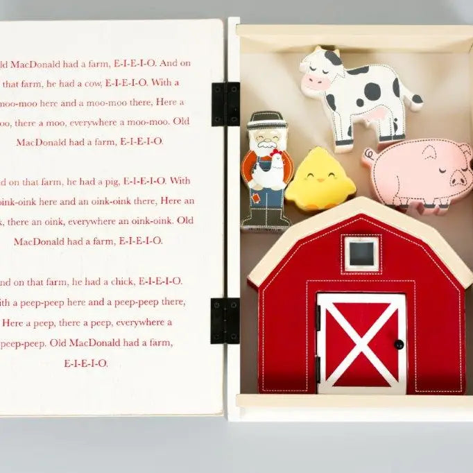 Our story is printed on the inside. Included is a red barn with door that opens, our farmer himself, a pig, a chick, and a cow.