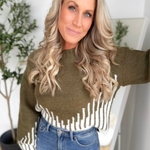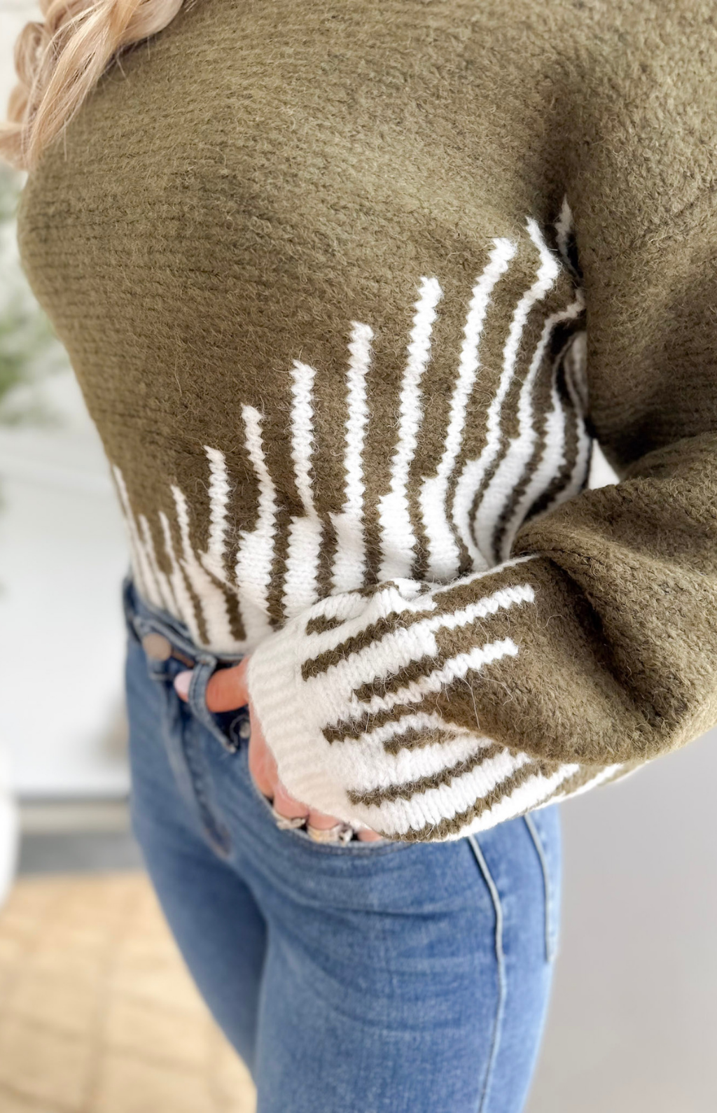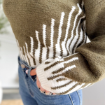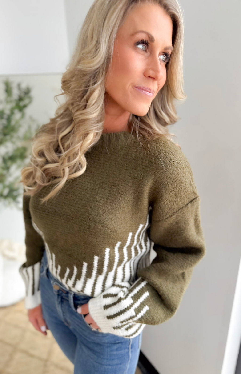 This olive knit sweater is one of those throw-on-and-go pieces that instantly makes you feel put together. The cream detailing adds just the right touch of contrast, giving it that “effortlessly elevated” vibe without you having to think twice. The balloon sleeves bring a soft, feminine shape that feels both cozy and chic. It’s the kind of sweater you’ll reach for on busy mornings when you want comfort but still need to look cute for work, errands, or school drop-off. Easy to style, easy to love—this one’s going to earn a permanent spot in your weekly rotation.