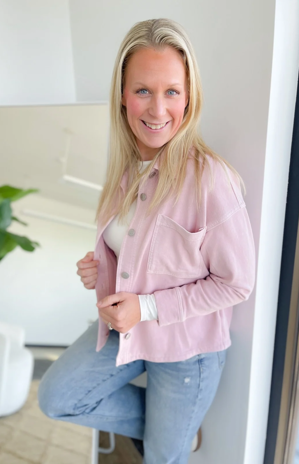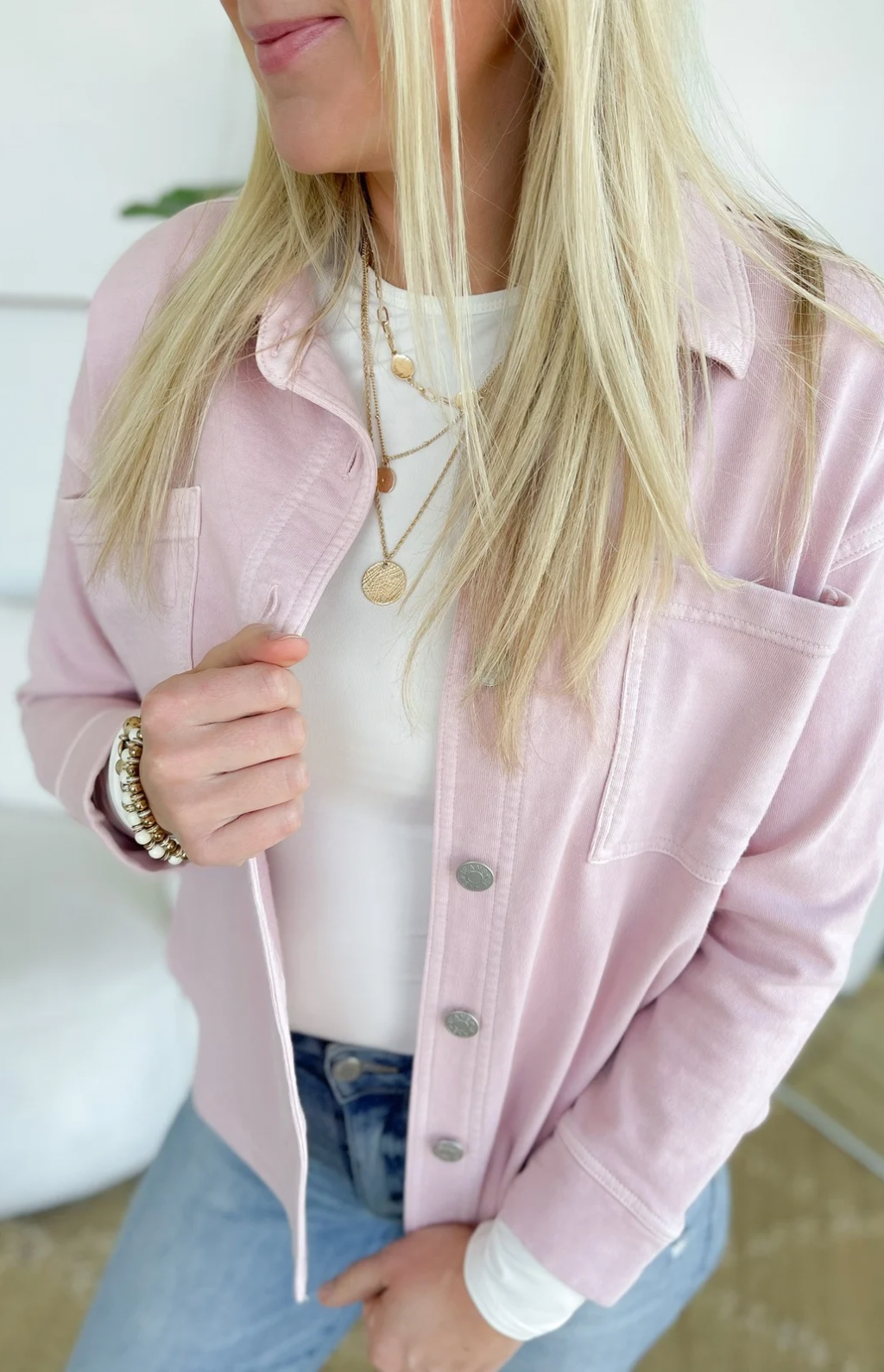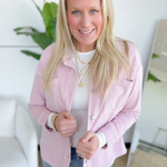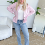 This soft knit denim button-up jacket in dusty pink is the perfect mix of cozy and cute. Designed with a cropped length and oversized fit, it gives you that relaxed, on-trend look without sacrificing comfort. The collared neckline keeps it classic, while the soft knit denim fabric makes it incredibly easy to wear all day.