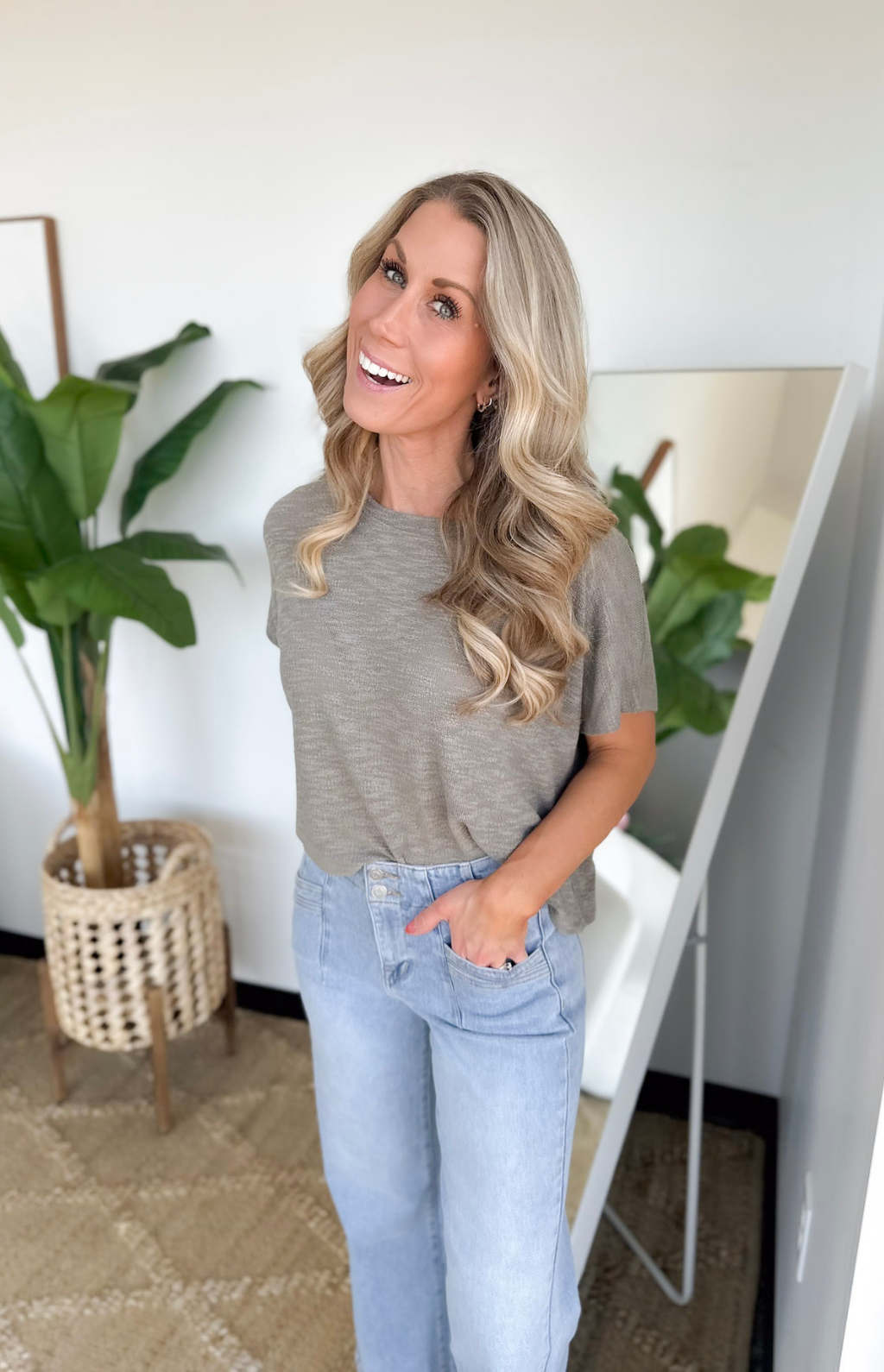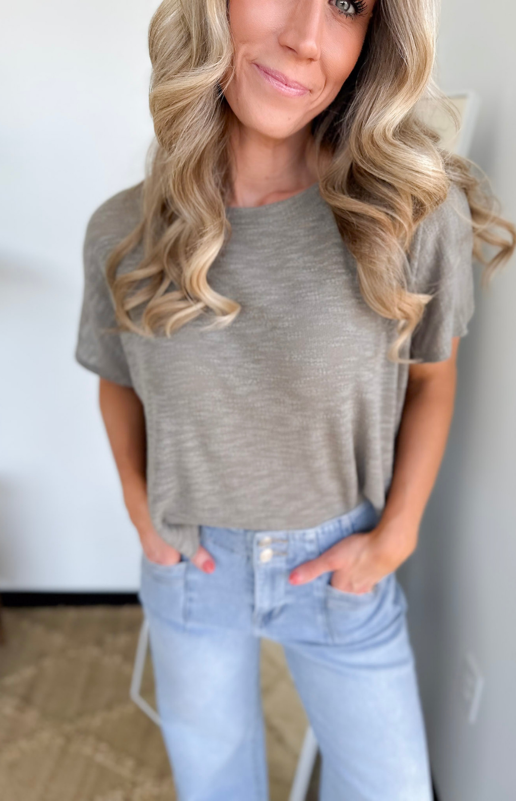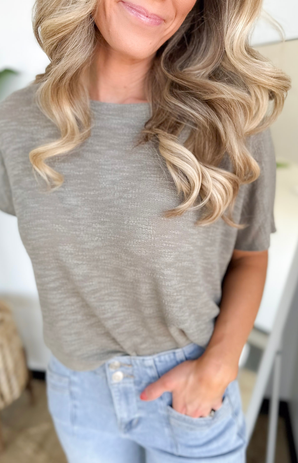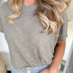 This pale olive soft knit short sleeve boxy top is one of those effortless essentials you’ll reach for again and again. The lightweight, cozy fabric feels amazing on, while the boxy fit gives you that relaxed, flattering shape that’s cute without trying too hard. It’s perfect for busy days when you want comfort but still want to look put together.