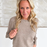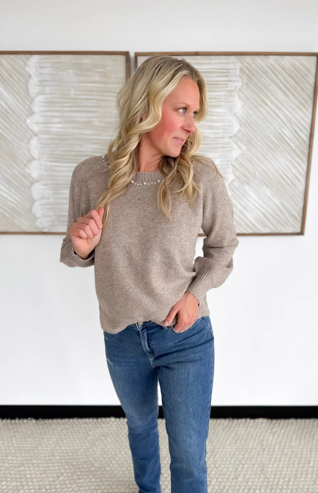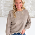 This taupe sparkled knit sweater brings a touch of glamour to your everyday wardrobe. The subtle sparkle adds just the right amount of shine, while the delicate pearl detailing along the neckline gives it a polished, feminine finish. Its soft knit keeps it cozy and comfortable, perfect for busy days when you want to look effortlessly put together. Pair it with jeans, skirts, or leggings for a versatile look that works from errands to lunch dates. It’s that little elevated piece that makes your outfit feel special without any extra effort.