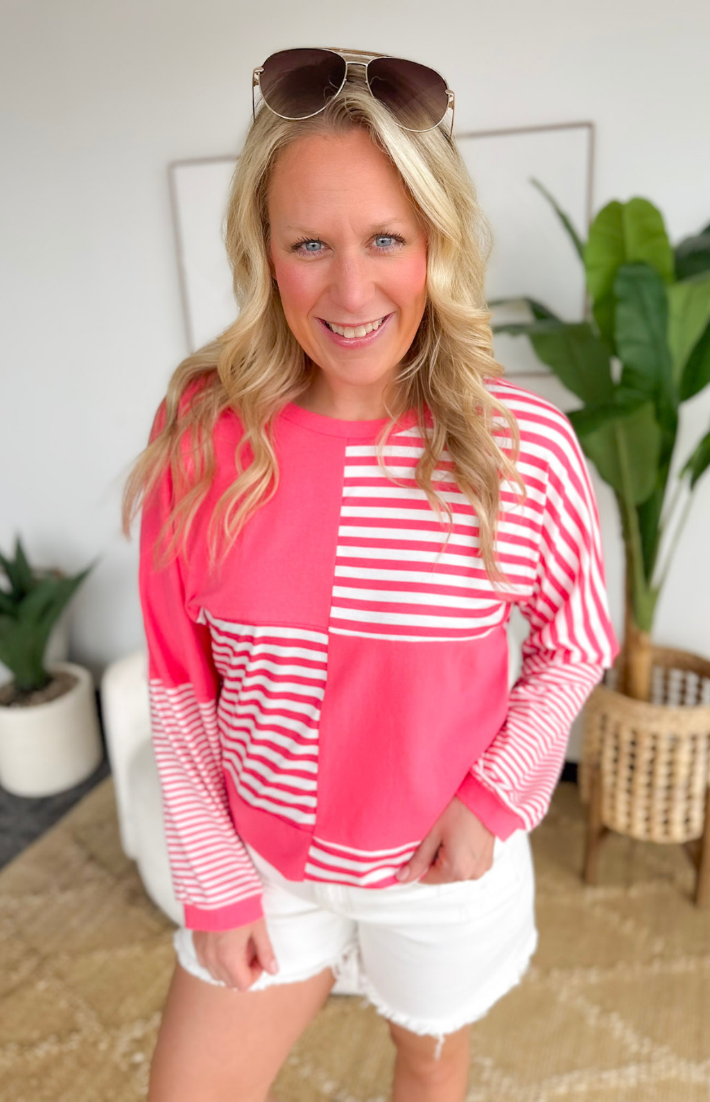 This hot pink and white color block multi-striped top is such a fun way to brighten up your everyday wardrobe. The bold stripe mix gives it that playful pop, while the long sleeves keep it practical for busy days on the go. It’s lightweight enough to layer under a vest or jacket, but cute enough to stand on its own with your favorite denim.