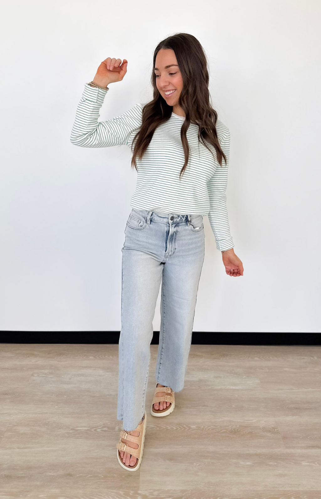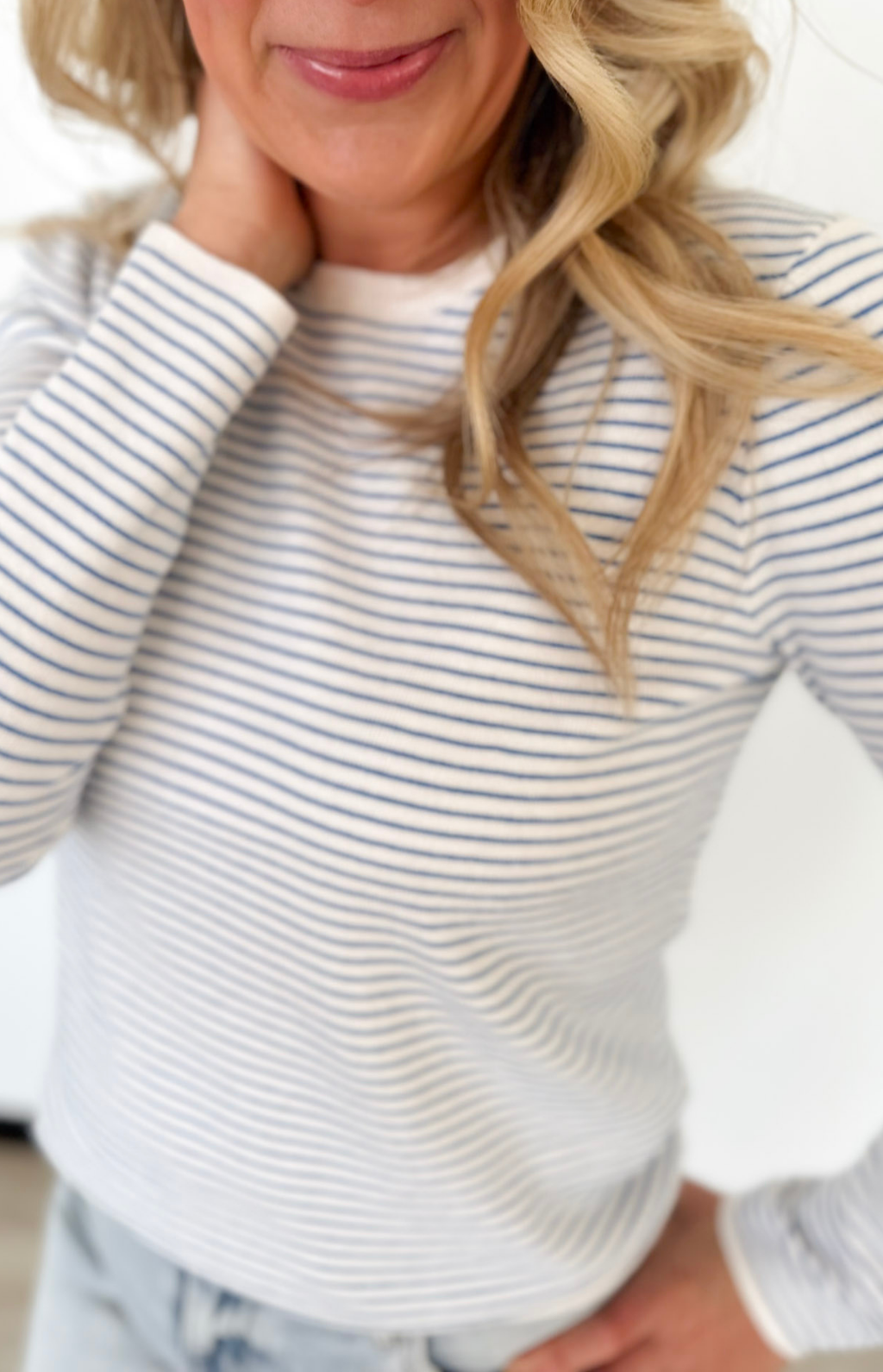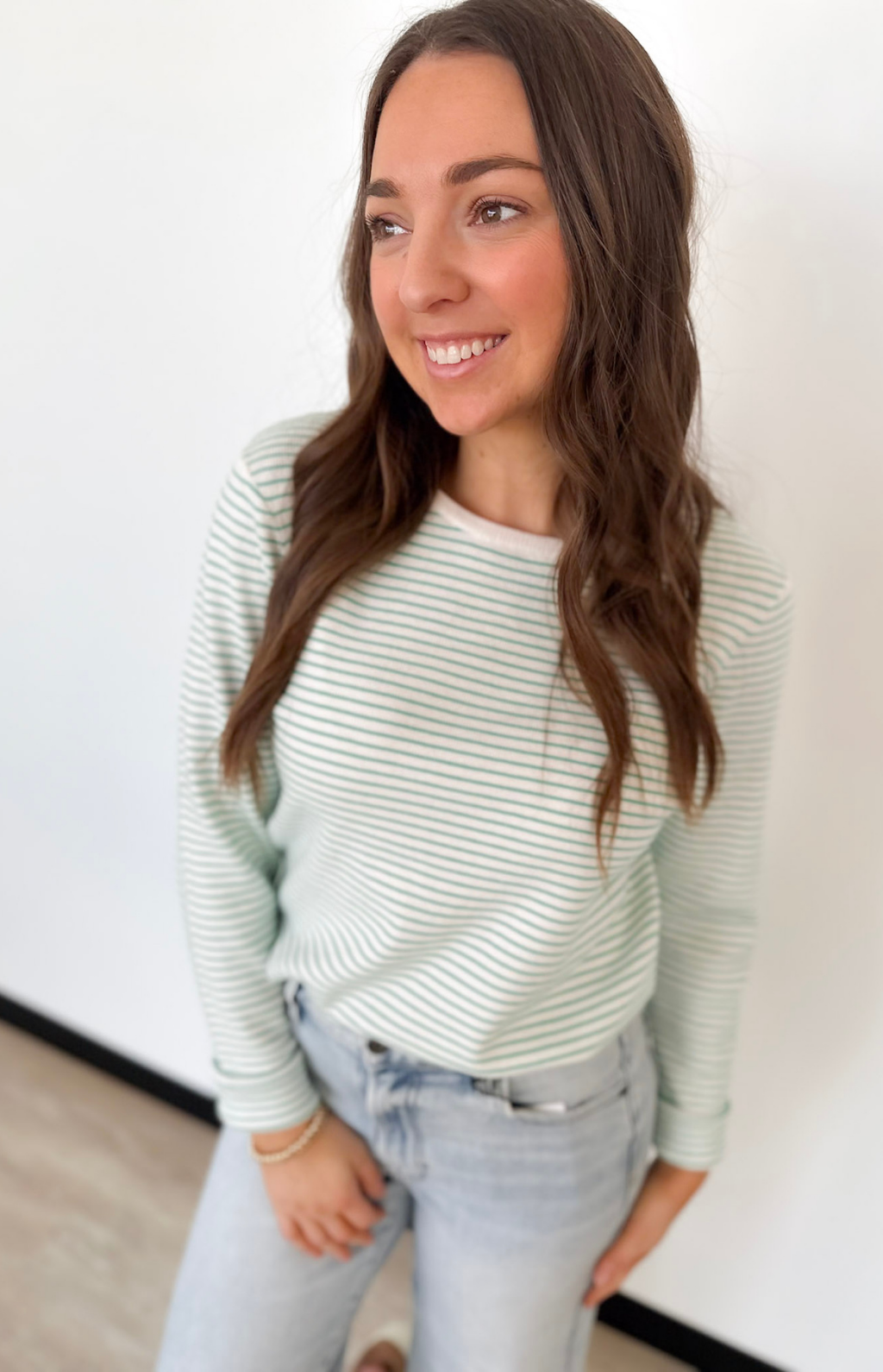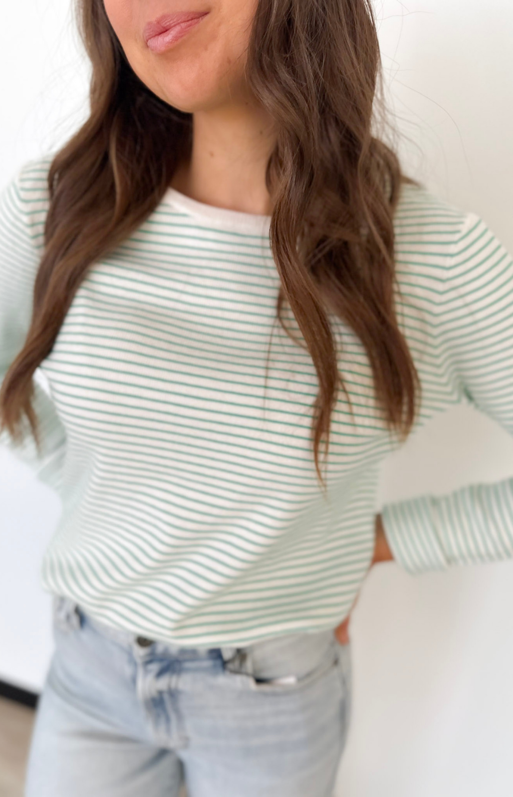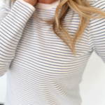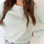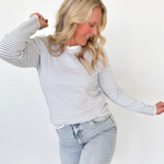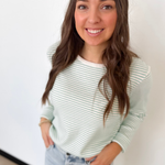 This lightweight pinstripe long sleeve top is the kind of piece that makes getting dressed feel effortless. The ribbed fabric adds just the right amount of texture while keeping it soft and breathable for all-day wear. Available in ivory with blue or ivory with green, both colorways are fresh, timeless, and easy to style.