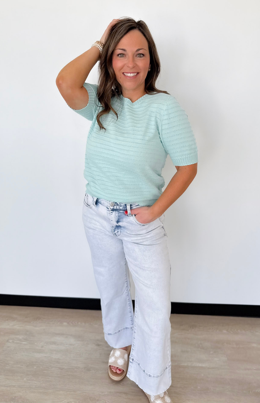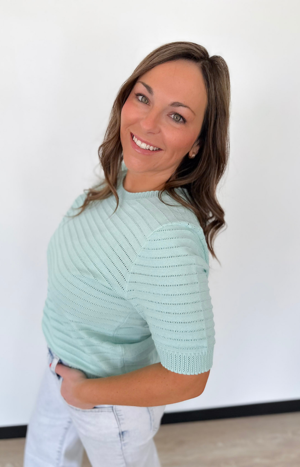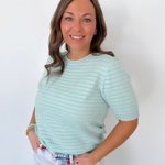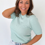 This pointelle textured mint short sleeve sweater is the perfect mix of lightweight comfort and everyday polish. The soft knit and breathable pointelle detail keep it feeling airy while still offering just the right amount of coverage. Subtle striped texture adds interest without overwhelming your outfit. The classic crew neckline makes it easy to layer or wear on its own.
