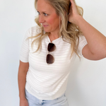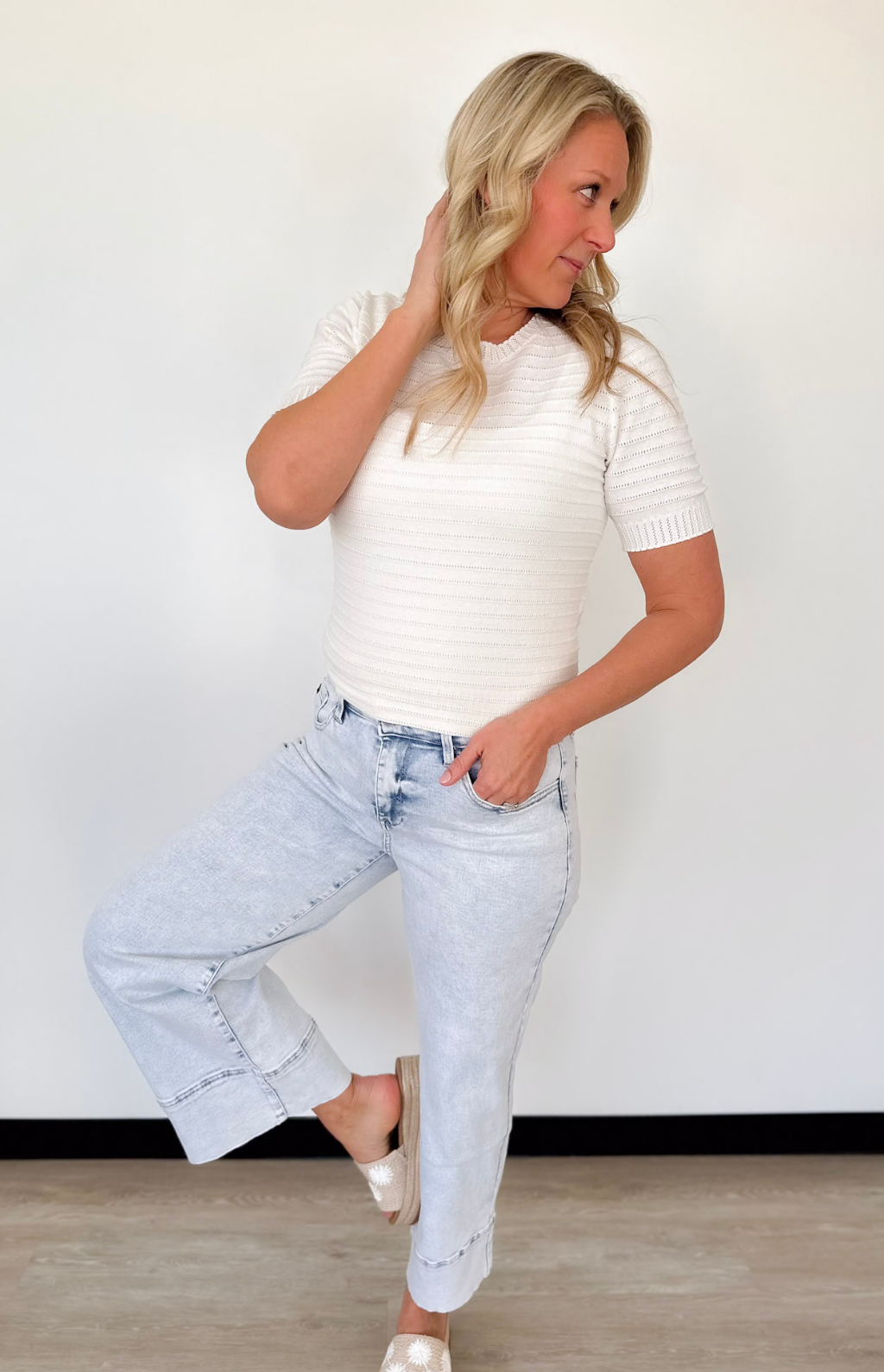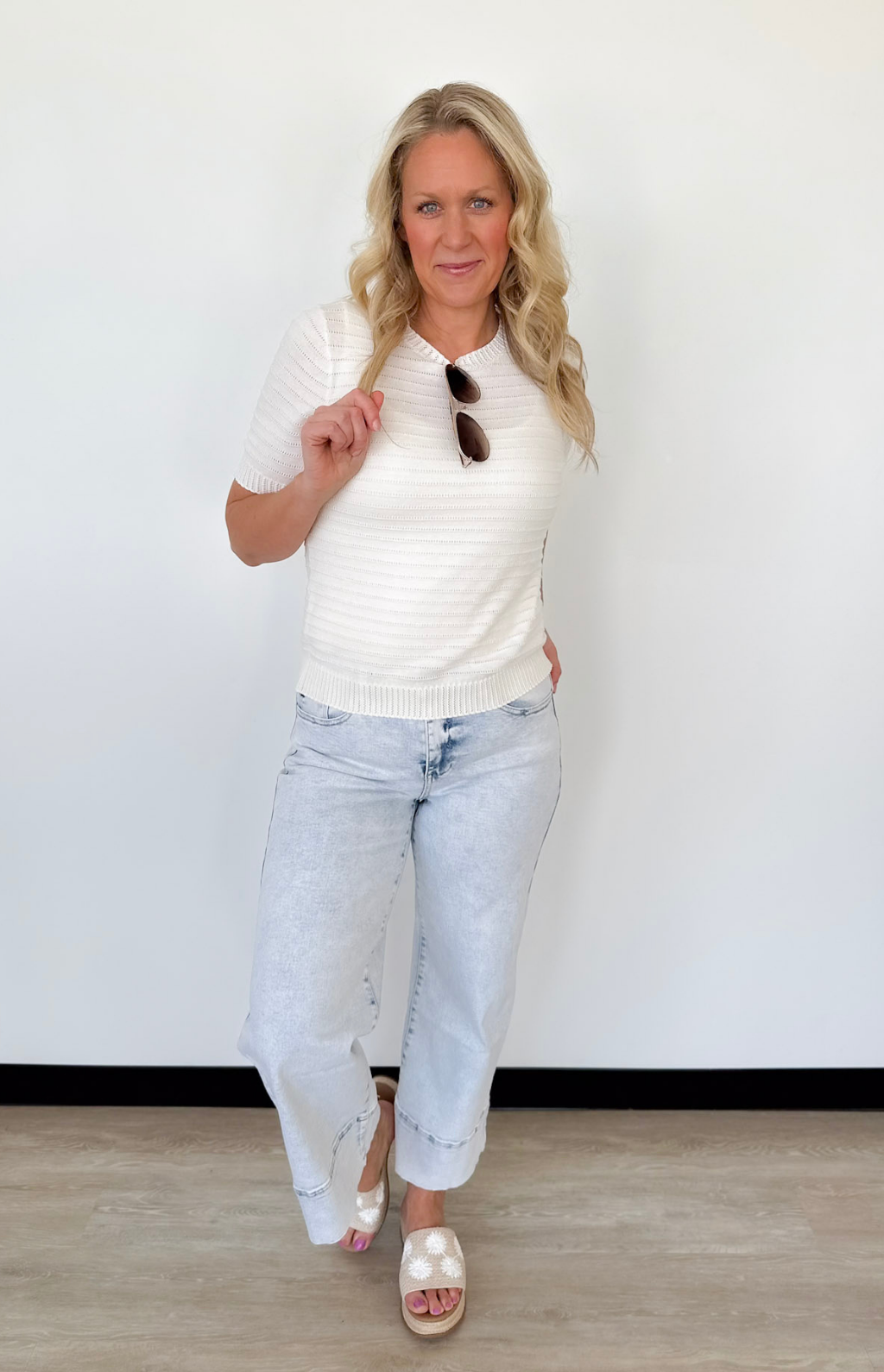 This pointelle textured off white short sleeve sweater is the perfect mix of lightweight comfort and everyday polish. The soft knit and breathable pointelle detail keep it feeling airy while still offering just the right amount of coverage. Subtle striped texture adds interest without overwhelming your outfit. The classic crew neckline makes it easy to layer or wear on its own.
