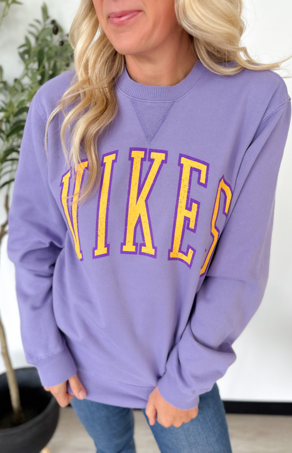 Celebrate your love for Minnesota football with this purple relaxed-fit crewneck sweatshirt. Sweatshirt features an oversized, retro Minnesota Football "VIKES" design.