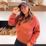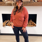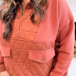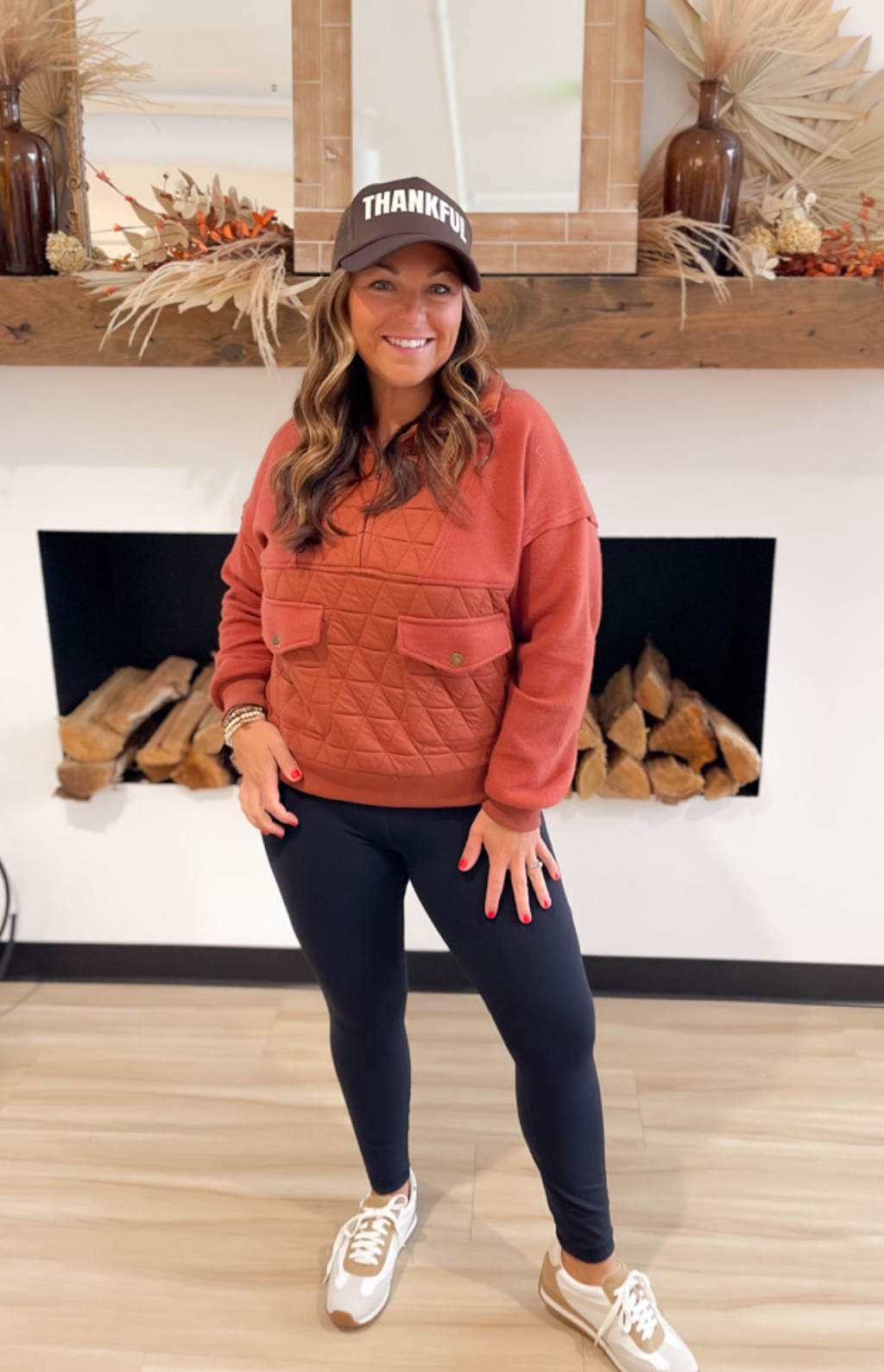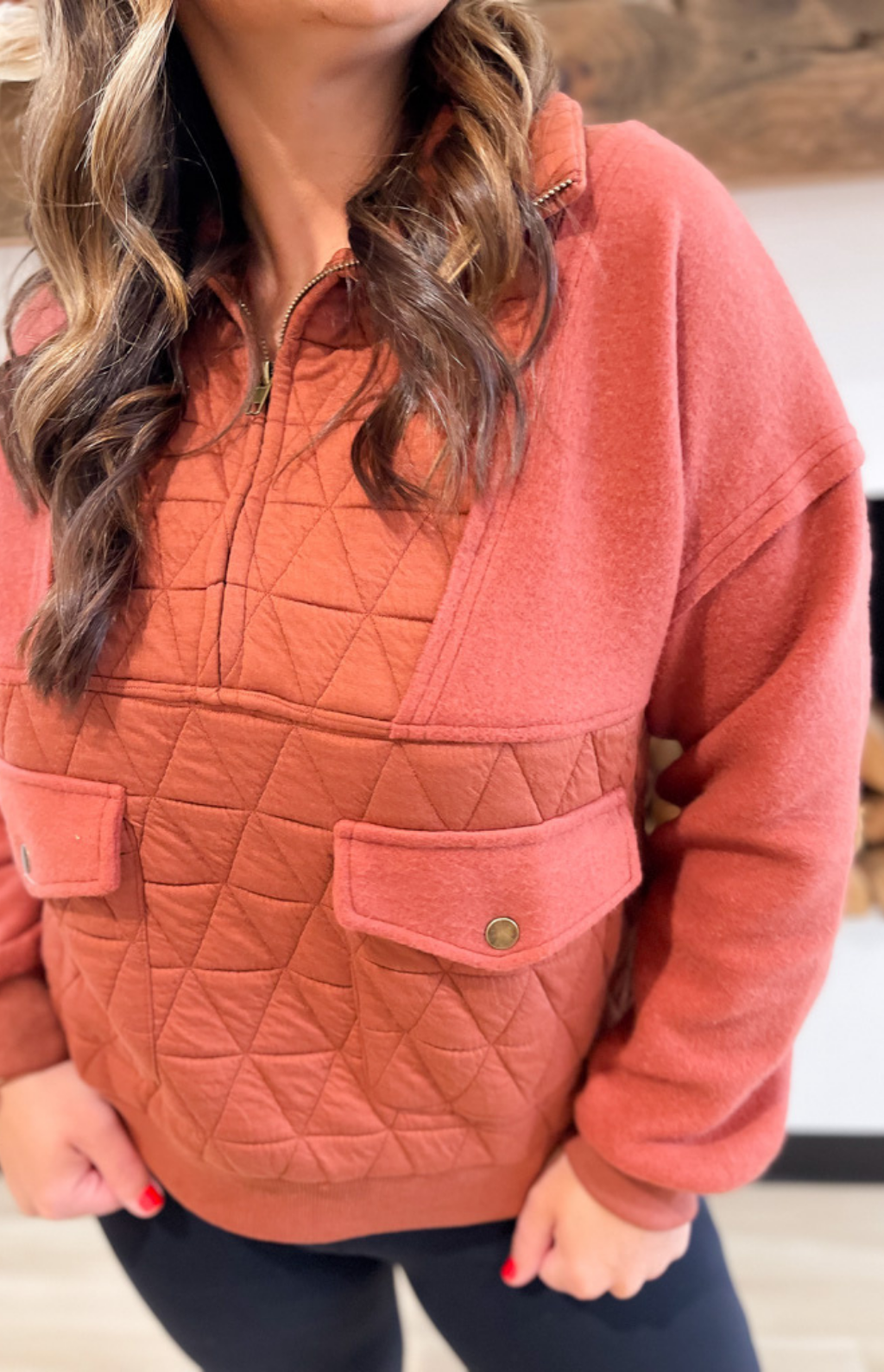 This rust-colored half zip pullover is the perfect mix of cozy and stylish. The quilted contrast detailing adds texture and interest, while the half zip neckline lets you adjust for comfort and layering. Its warm rust hue makes it a standout piece that still pairs easily with jeans, leggings, or joggers. Designed with a relaxed fit, it’s comfy enough for everyday wear but polished enough to feel put-together. A go-to pullover for those grab-and-go days when you still want to look effortlessly chic.
