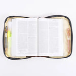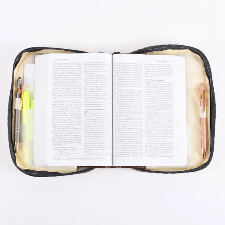 Introducing the perfect companion for your Bible - a Cover designed to protect, organize, and enhance your Bible throughout your spiritual journey. Crafted from durable and water-resistant canvas, this cover ensures that your Bible remains shielded from the elements and daily life, offering peace of mind, as well as style, wherever you go. The polyester-lined interior not only offers an organizational haven and security for your Bible, it is also effortless to wipe clean and maintain, ensuring its pristine condition over time. On the inside you will find two elastic pen loops, ready to accommodate your pen and highlighter