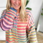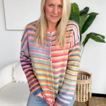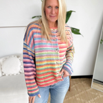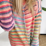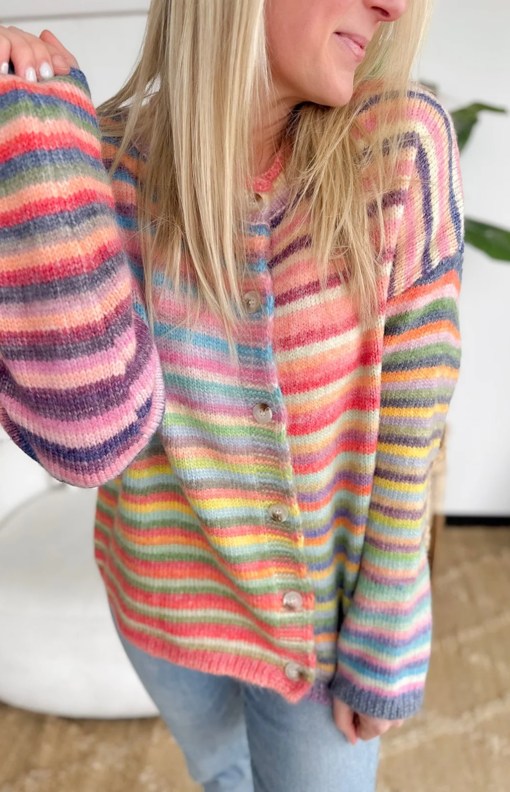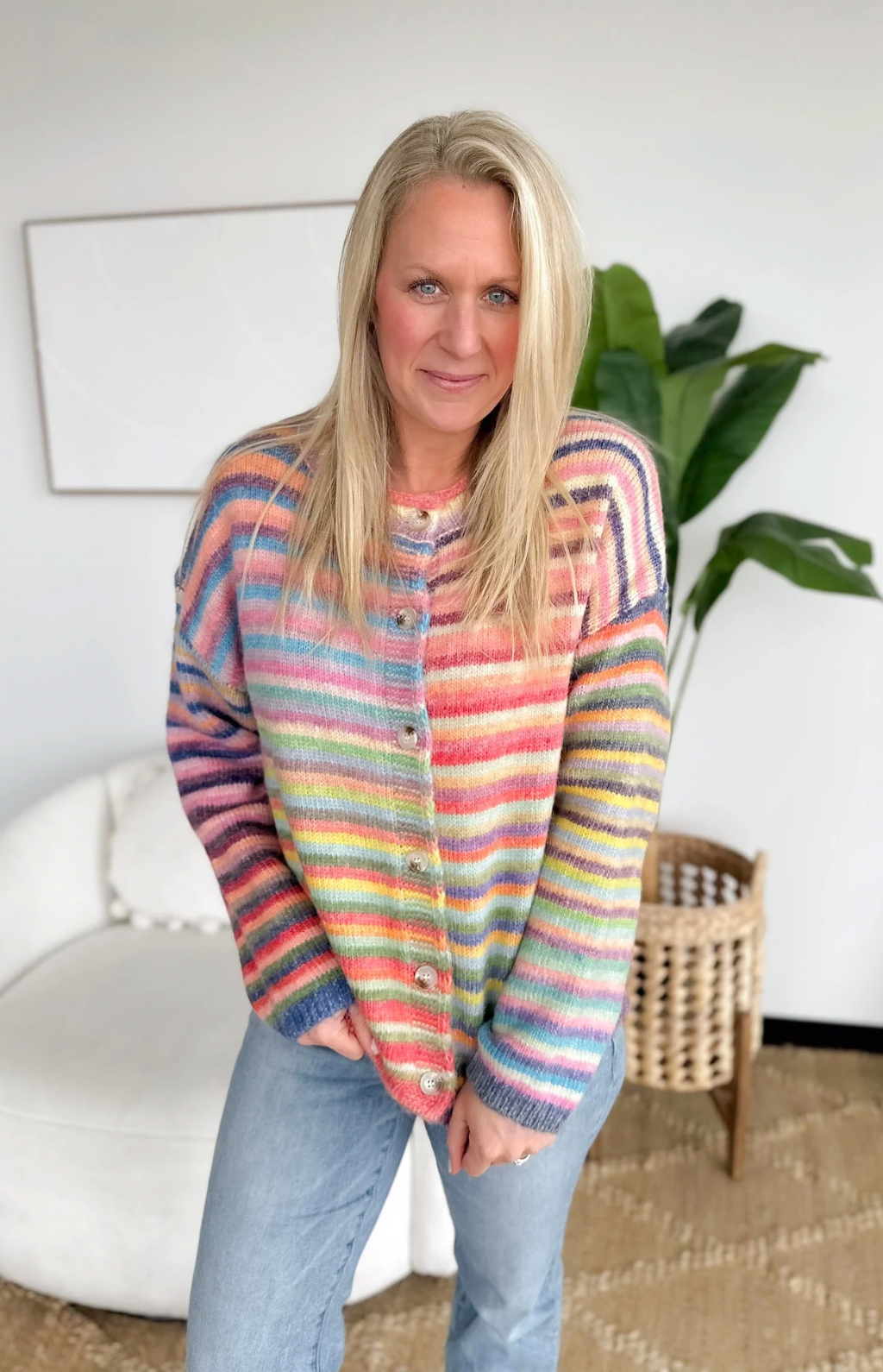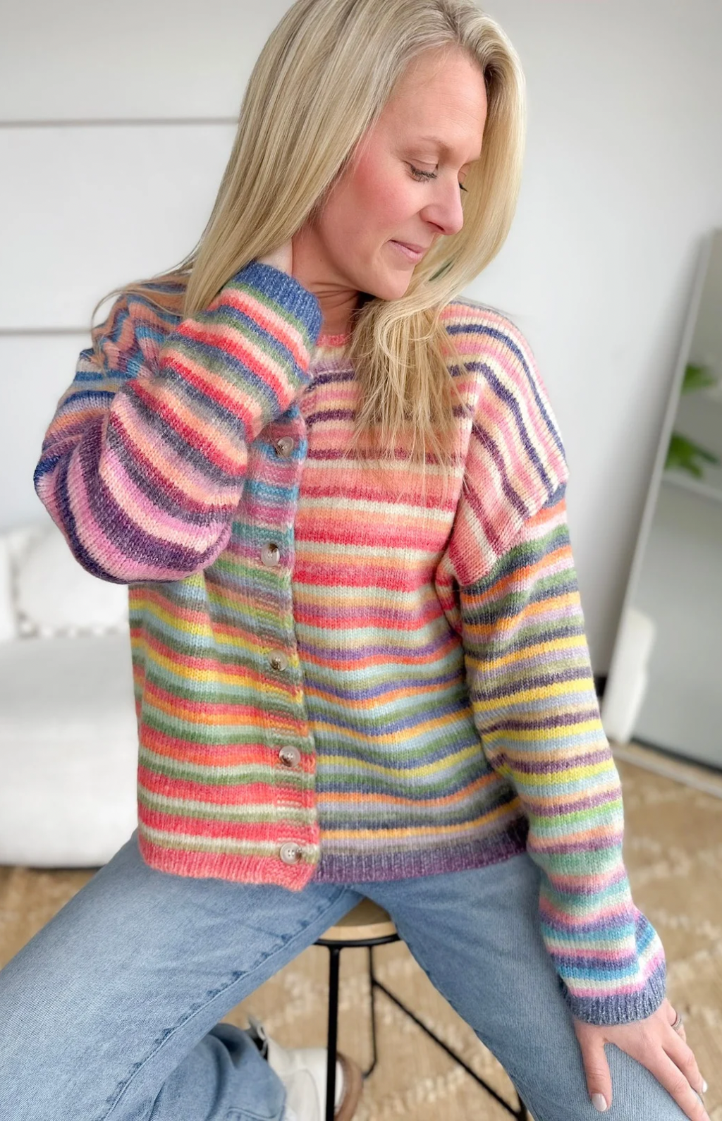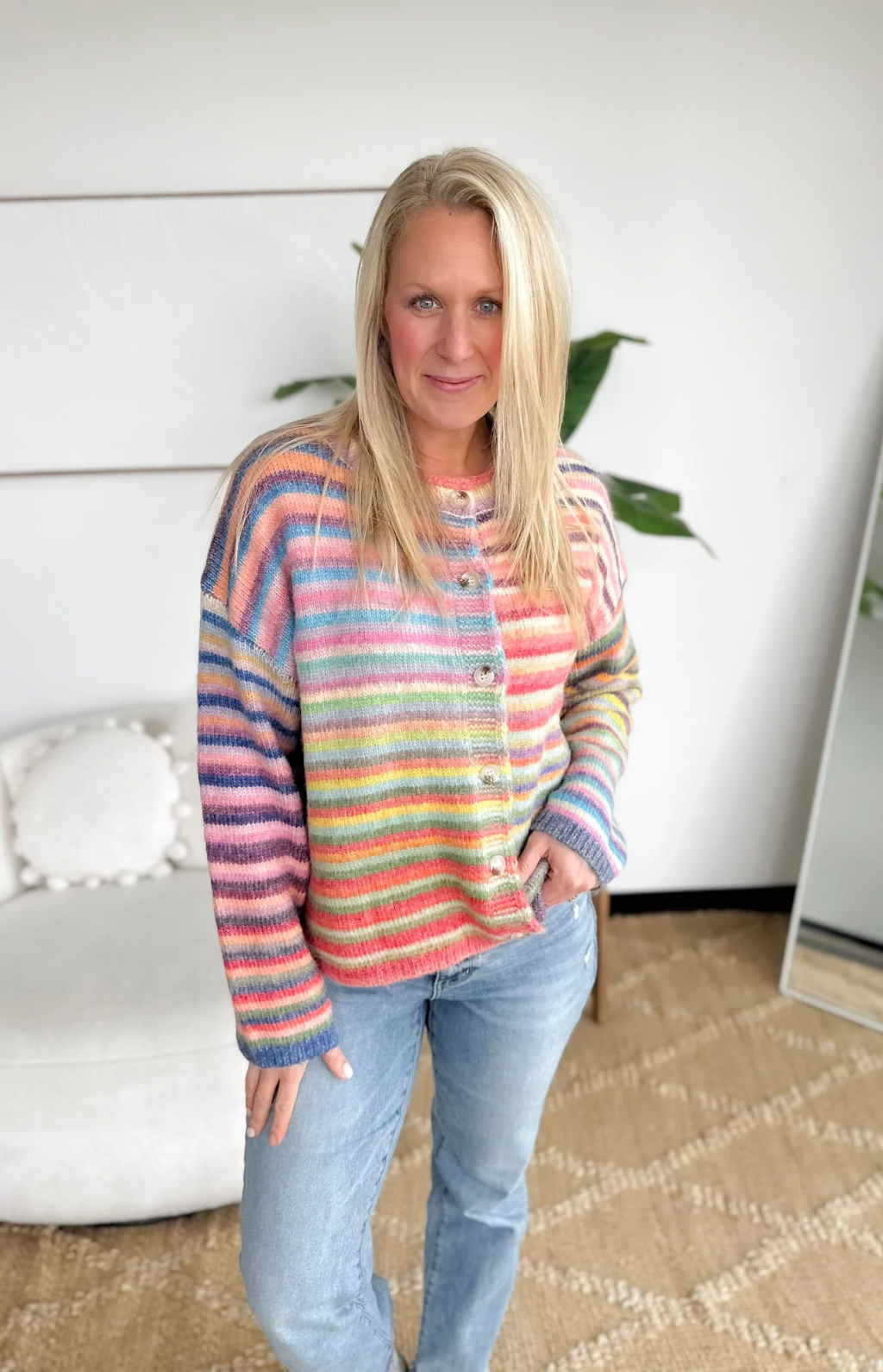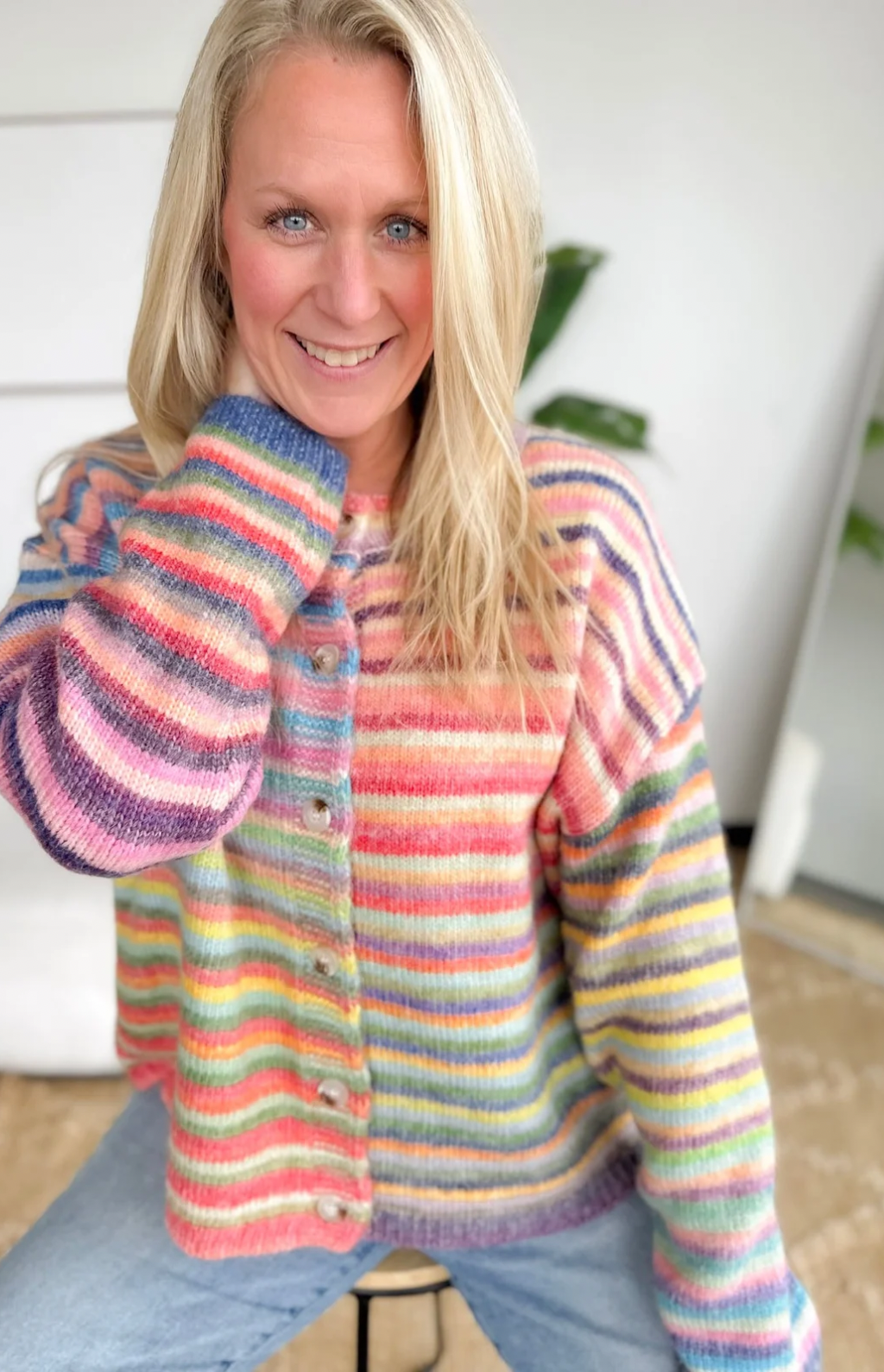 This rainbow striped button-front cardigan is the happy, feel-good layer your closet’s been waiting for. Made from a soft knit, it’s cozy without feeling heavy—perfect for busy days when you want comfort and color in one easy piece. The playful stripes brighten up any outfit while the button front keeps it classic and wearable.