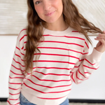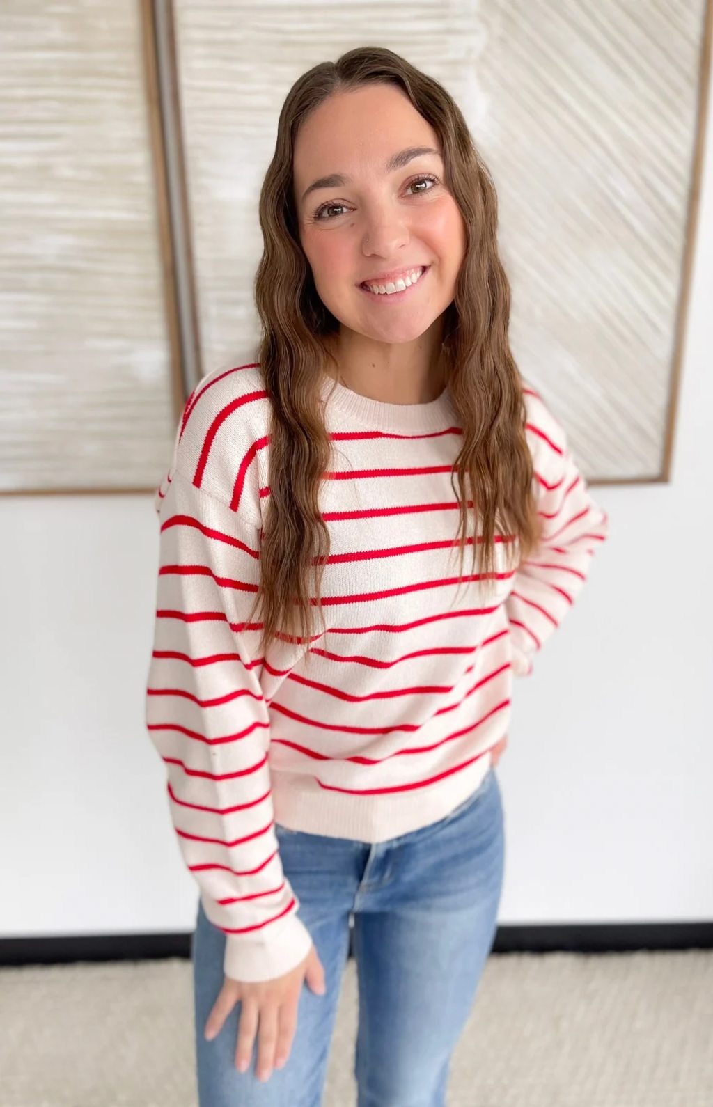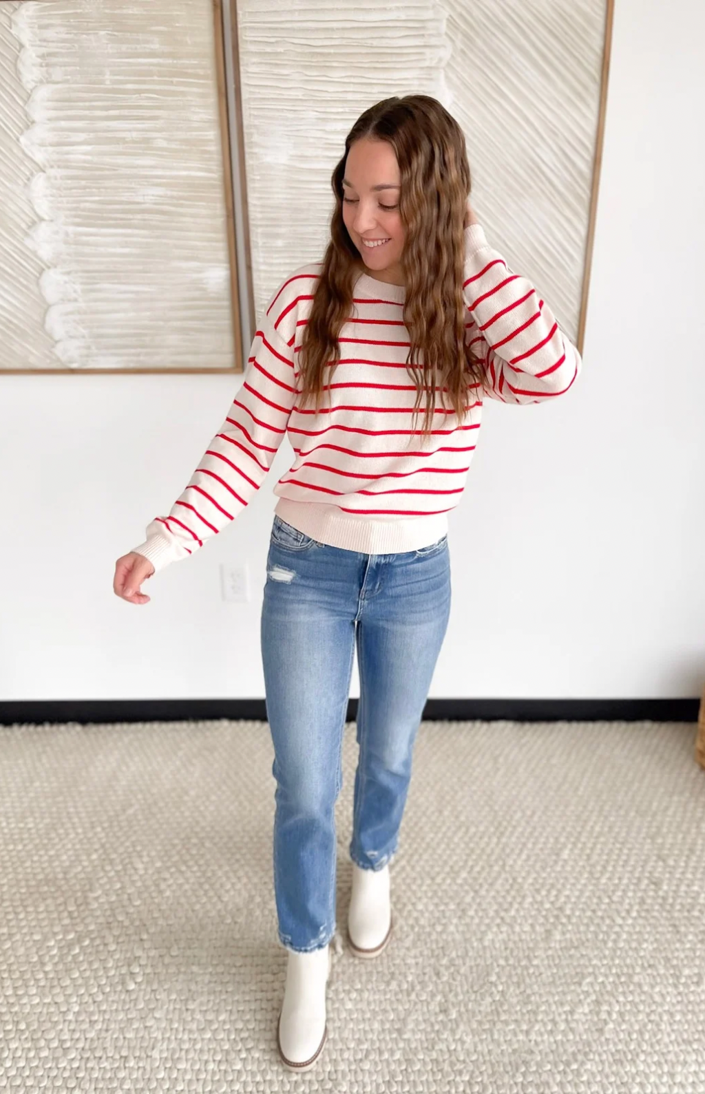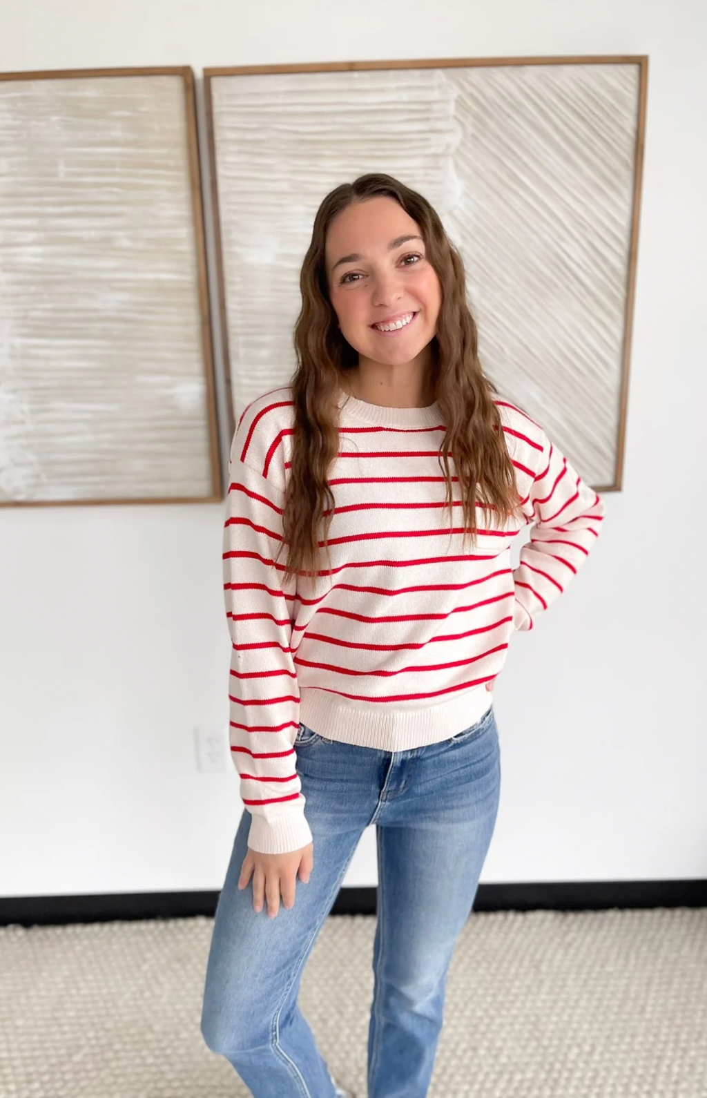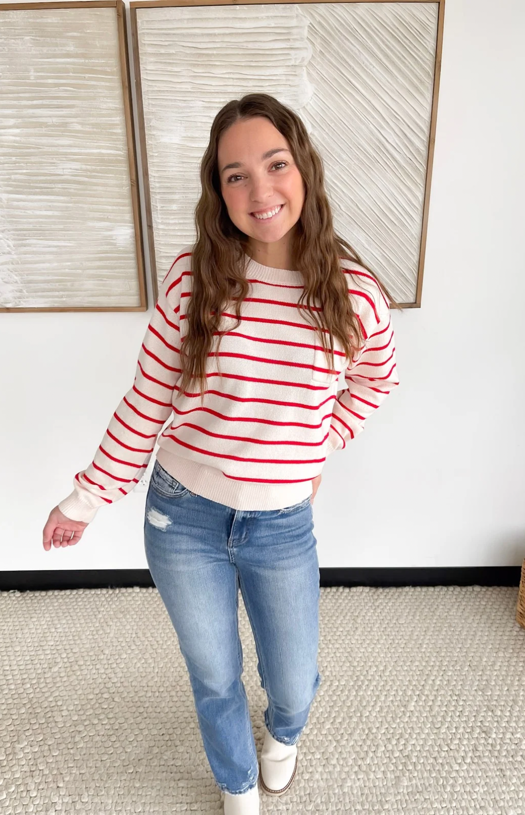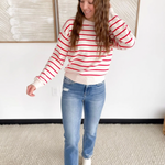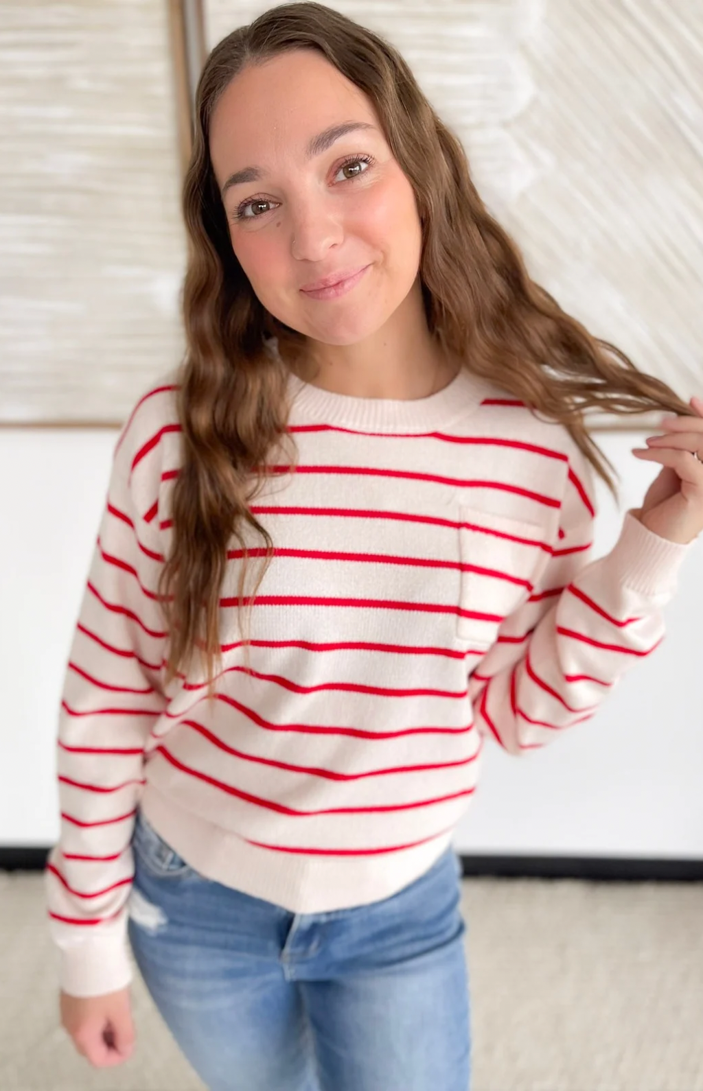 This red and cream striped sweater is the perfect mix of cozy and cute for your go-go-go days. The soft knit feels dreamy against your skin, and the little chest pocket adds that touch of charm without trying too hard. The fit is relaxed enough for all-day comfort but still polished so you look put together in a snap. Pair it with jeans for school drop-off or leggings for a comfy weekend vibe. It’s one of those sweaters you’ll reach for again and again because it just works.