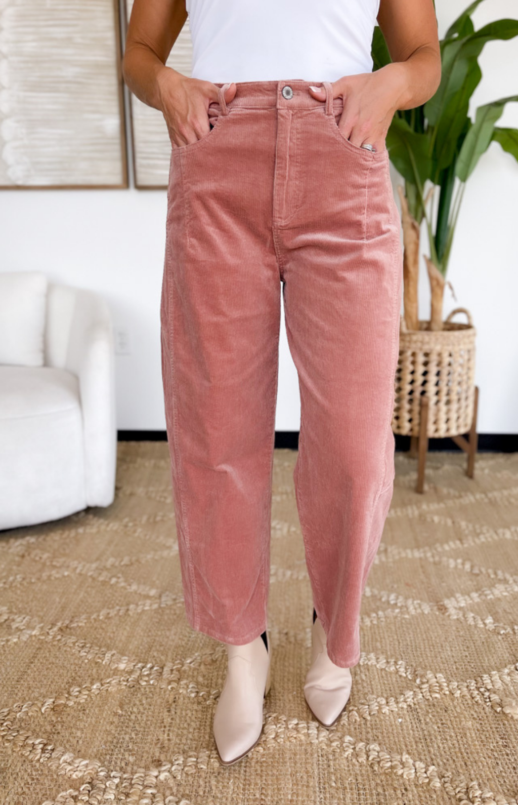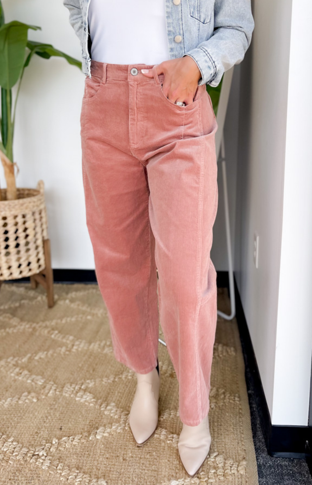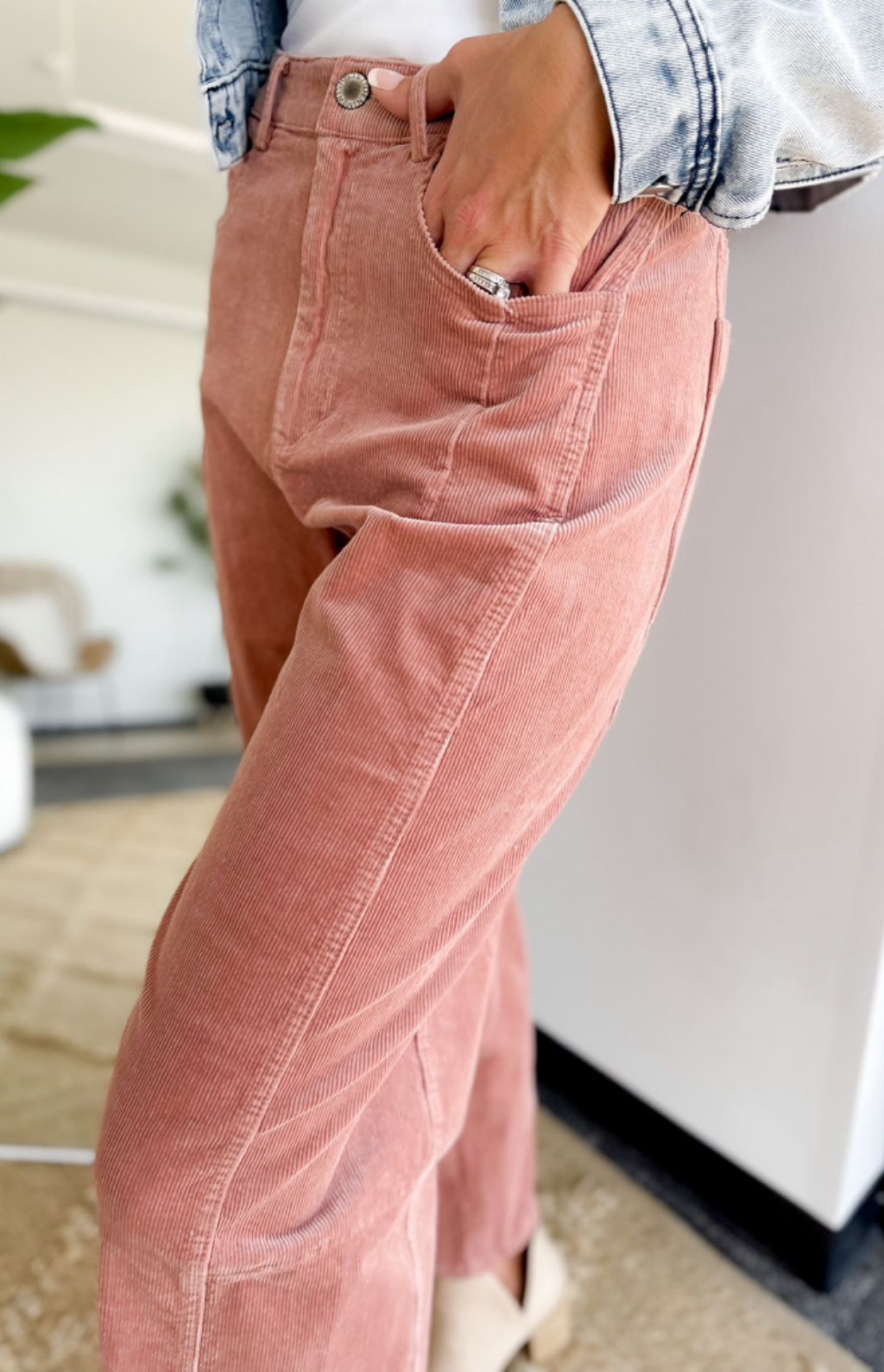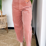 Step into effortless style with these rose-colored corduroy pants, designed in a flattering high-waist and wide-leg silhouette. The soft corduroy texture adds a vintage-inspired feel, while the structured cut keeps your look polished and modern. Perfect for pairing with chunky sweaters or sleek blouses, these pants easily transition from workdays to weekends. A chic upgrade to your everyday bottoms that makes comfort and style go hand in hand.