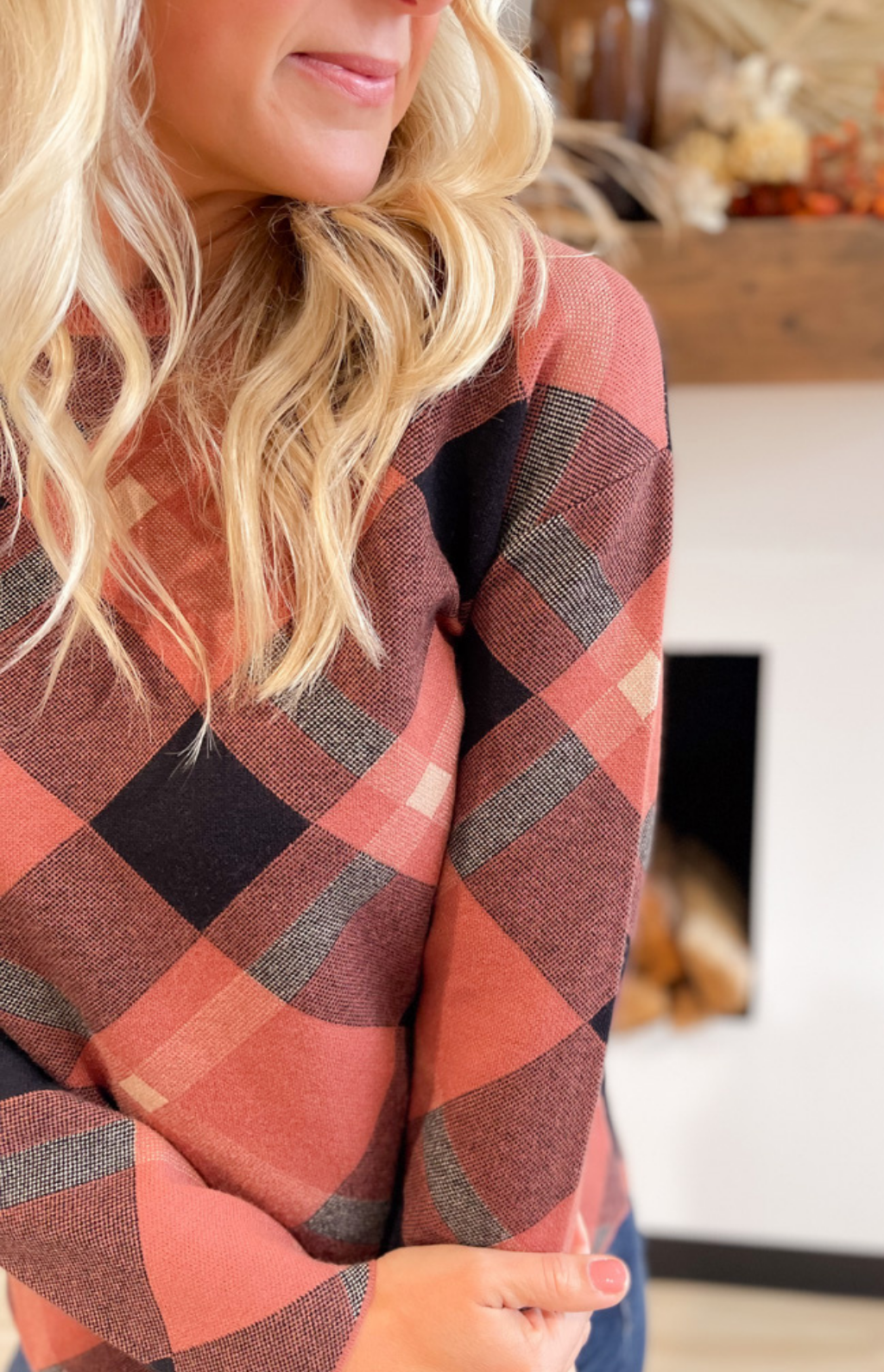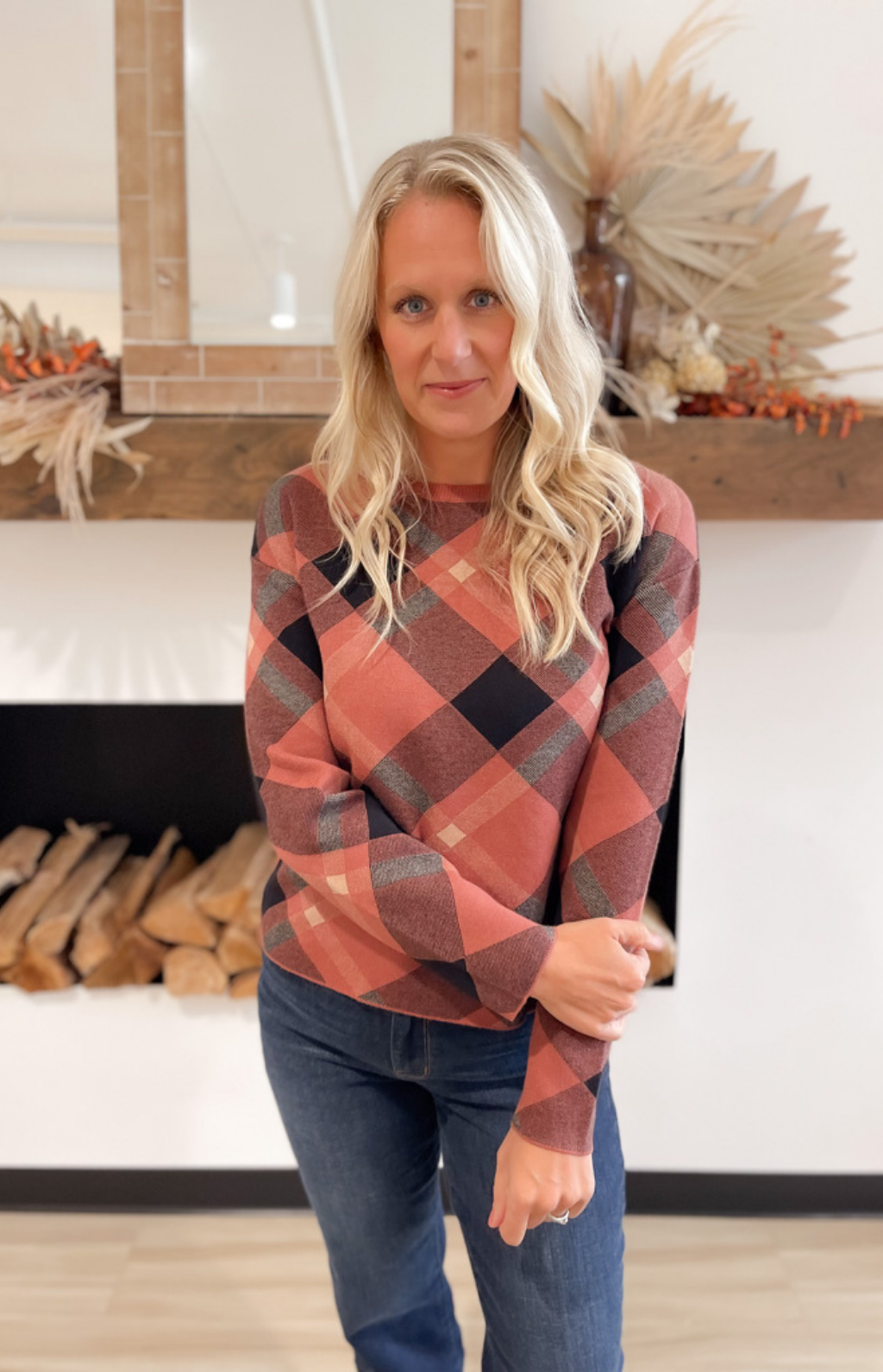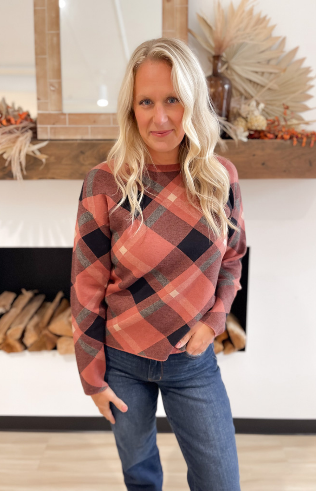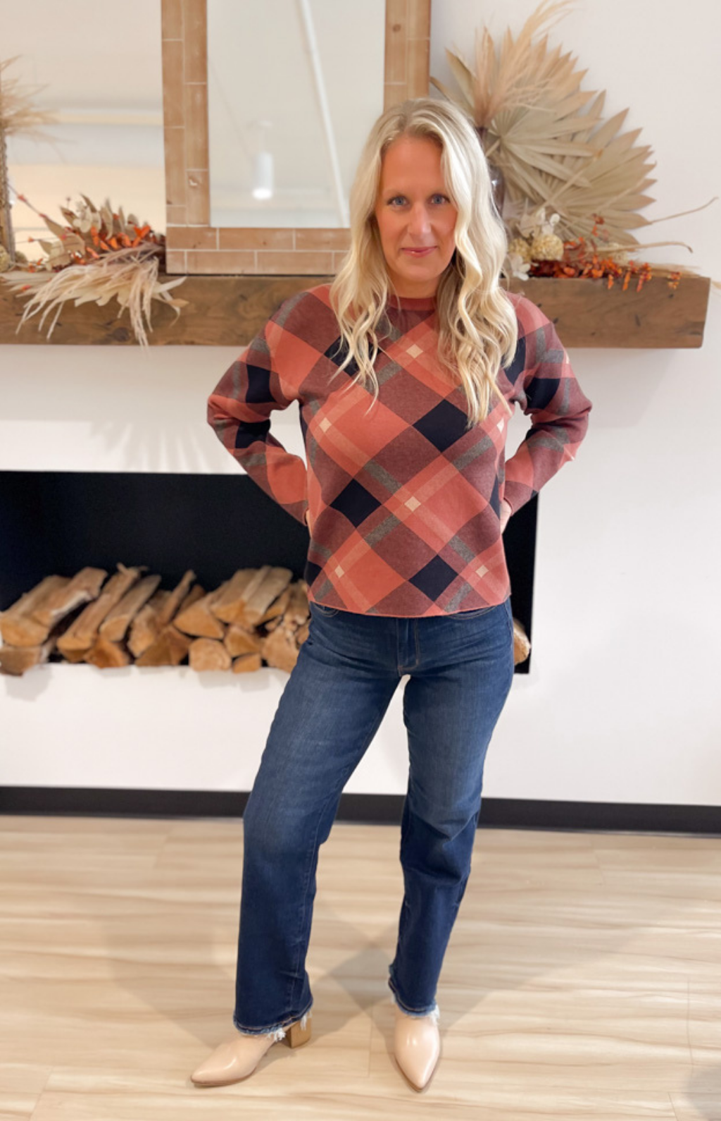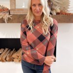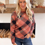 This rust-colored checkered pullover is cozy with a bold, modern twist. The classic crew neckline and long sleeves keep it timeless, while the checkered pattern adds just the right amount of personality. The warm rust tone makes it perfect for fall but versatile enough to wear all season. Soft and easy to style, it pairs just as well with jeans and boots as it does with leggings on laid-back days. It’s that effortless piece that makes you look pulled together without even trying.
