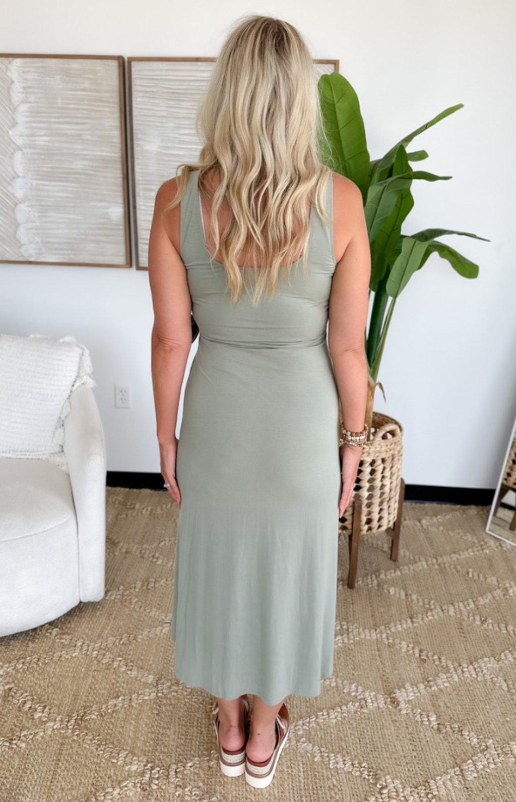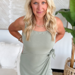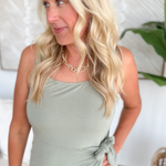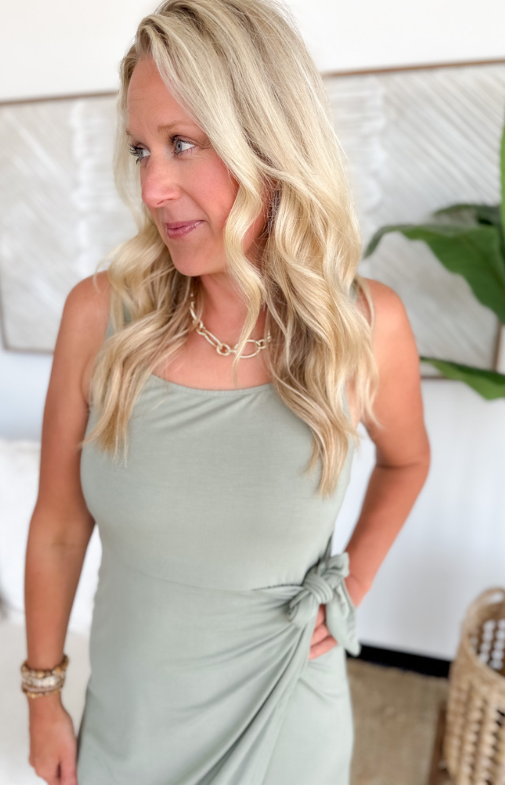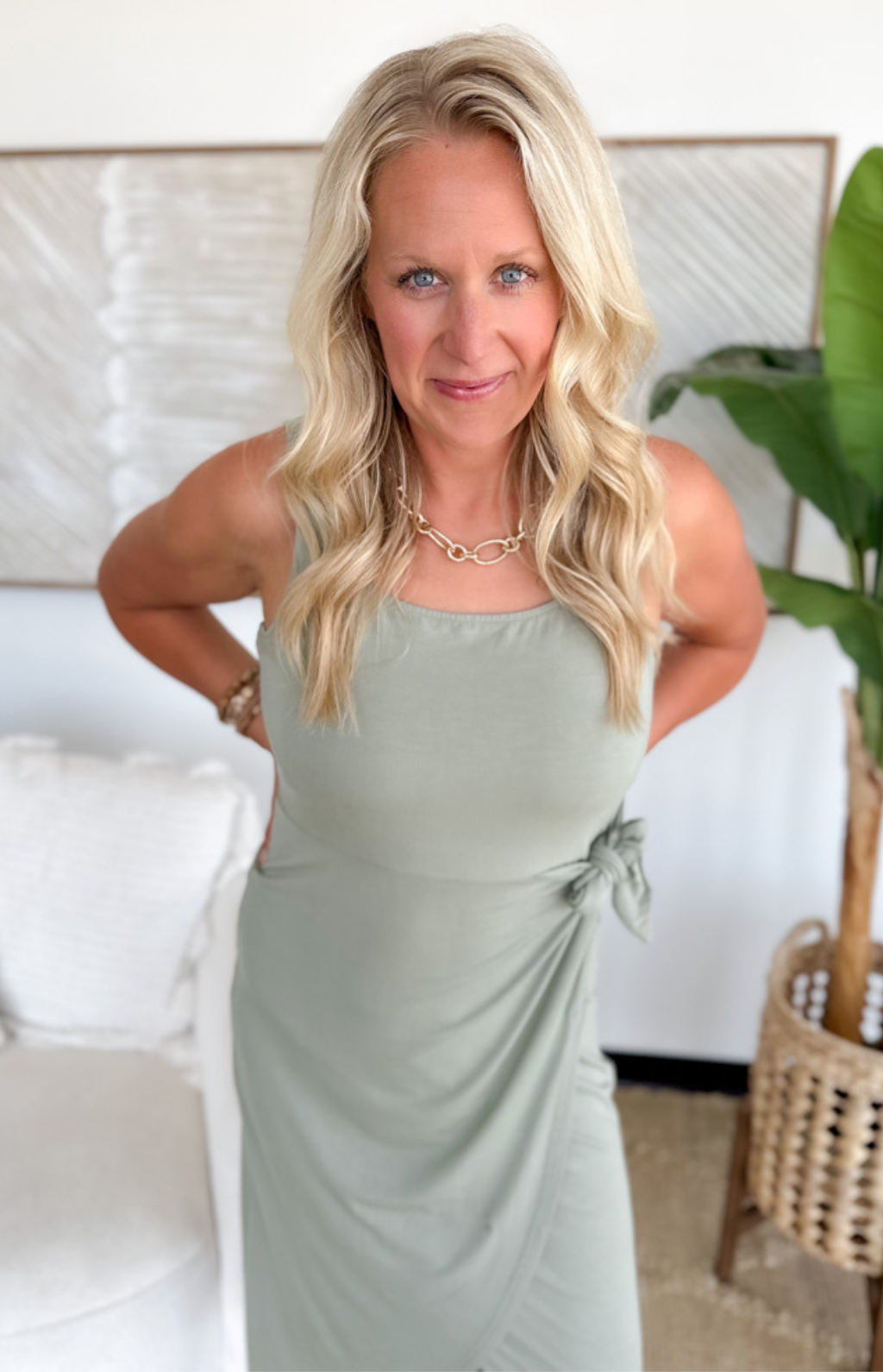 Feminine, flowy, and full of charm—this sage green midi dress is your new go-to for feeling put together without the fuss. The double square neckline adds a modern touch, while the side wrap tie lets you create a flattering silhouette with ease. The high-low hemline gives it that graceful, floaty movement we love, making it perfect for date nights, garden parties, or church on Sunday. It’s soft, effortless, and ready for wherever the day takes you.