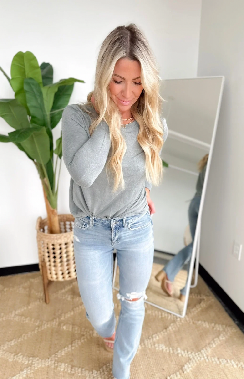 This seagrass toned long sleeve top is all about effortless, everyday style with a modern twist. The lightweight fabric keeps it comfortable and easy to layer, while the front knot detail adds a flattering, playful touch.