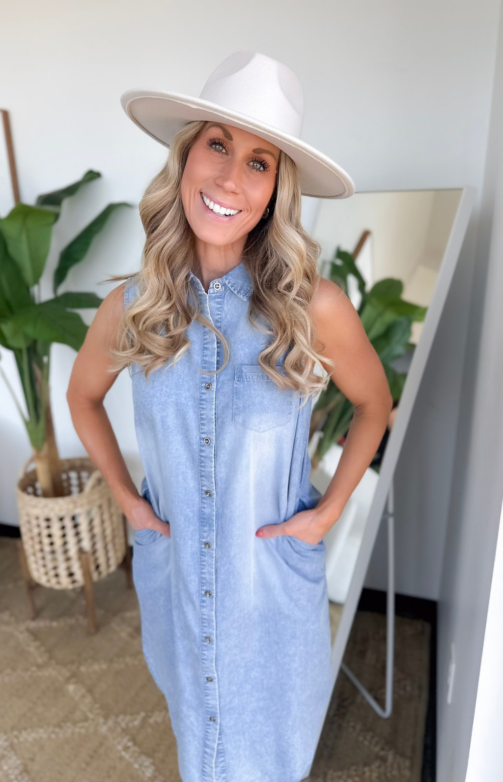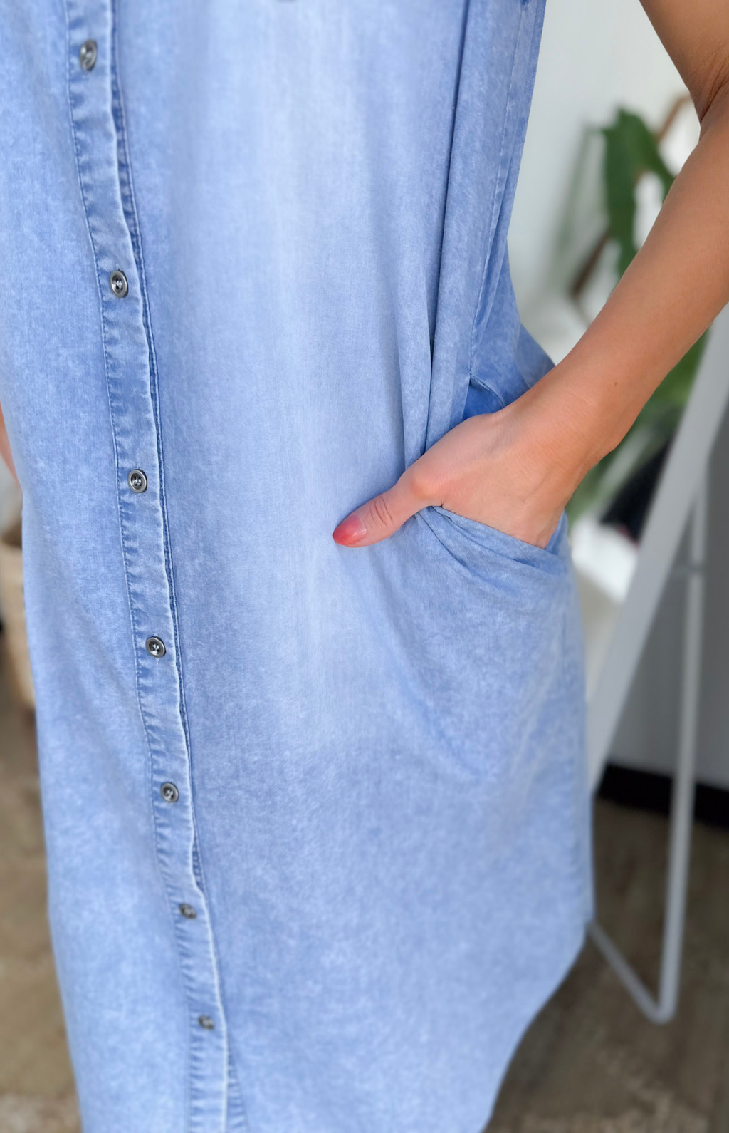 This sleeveless denim dress is a true wear-anywhere staple you’ll be so glad you grabbed. The collared neckline and button-front design give it a classic, polished feel, while the rounded hemline keeps it relaxed and modern.
