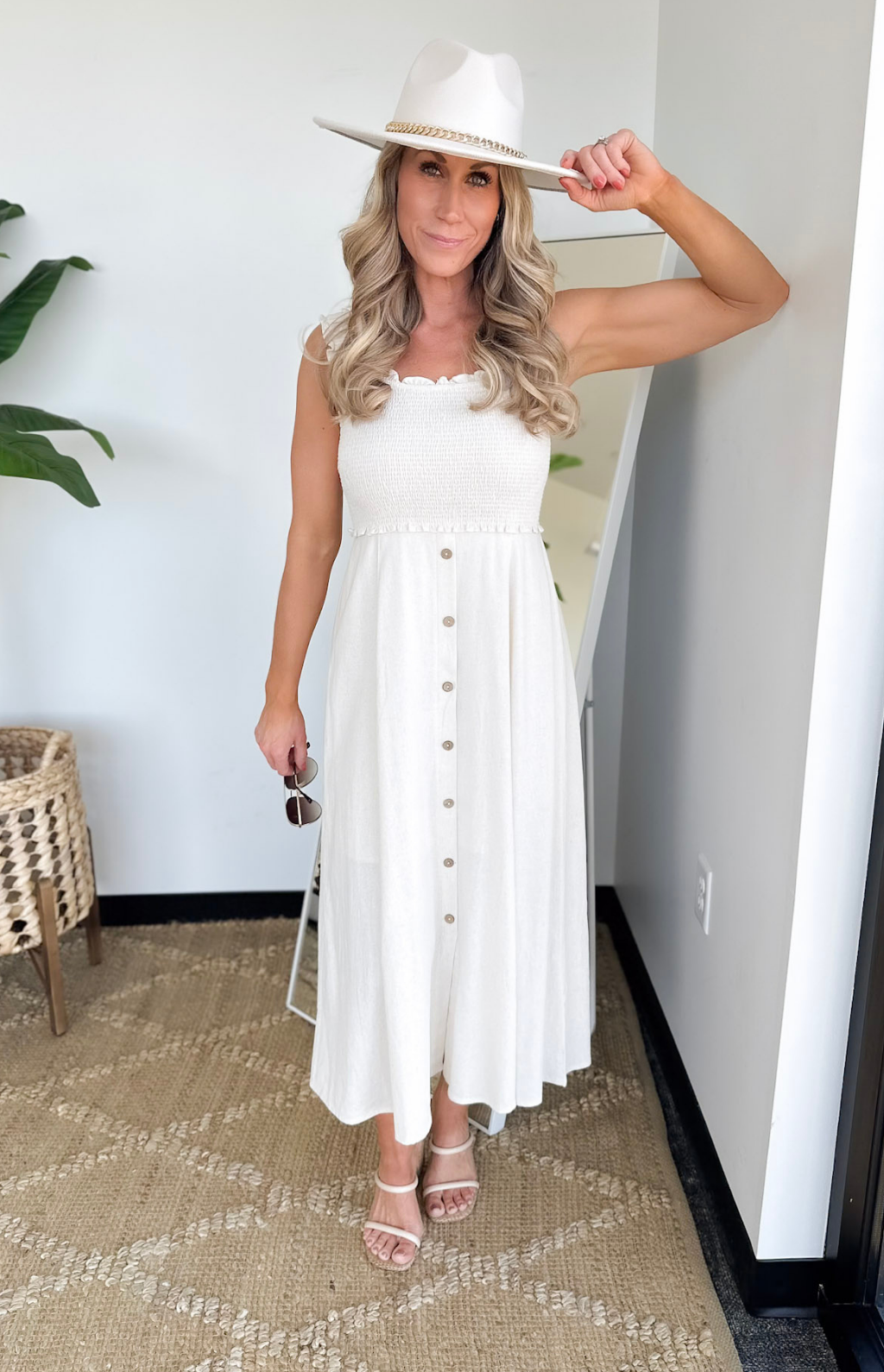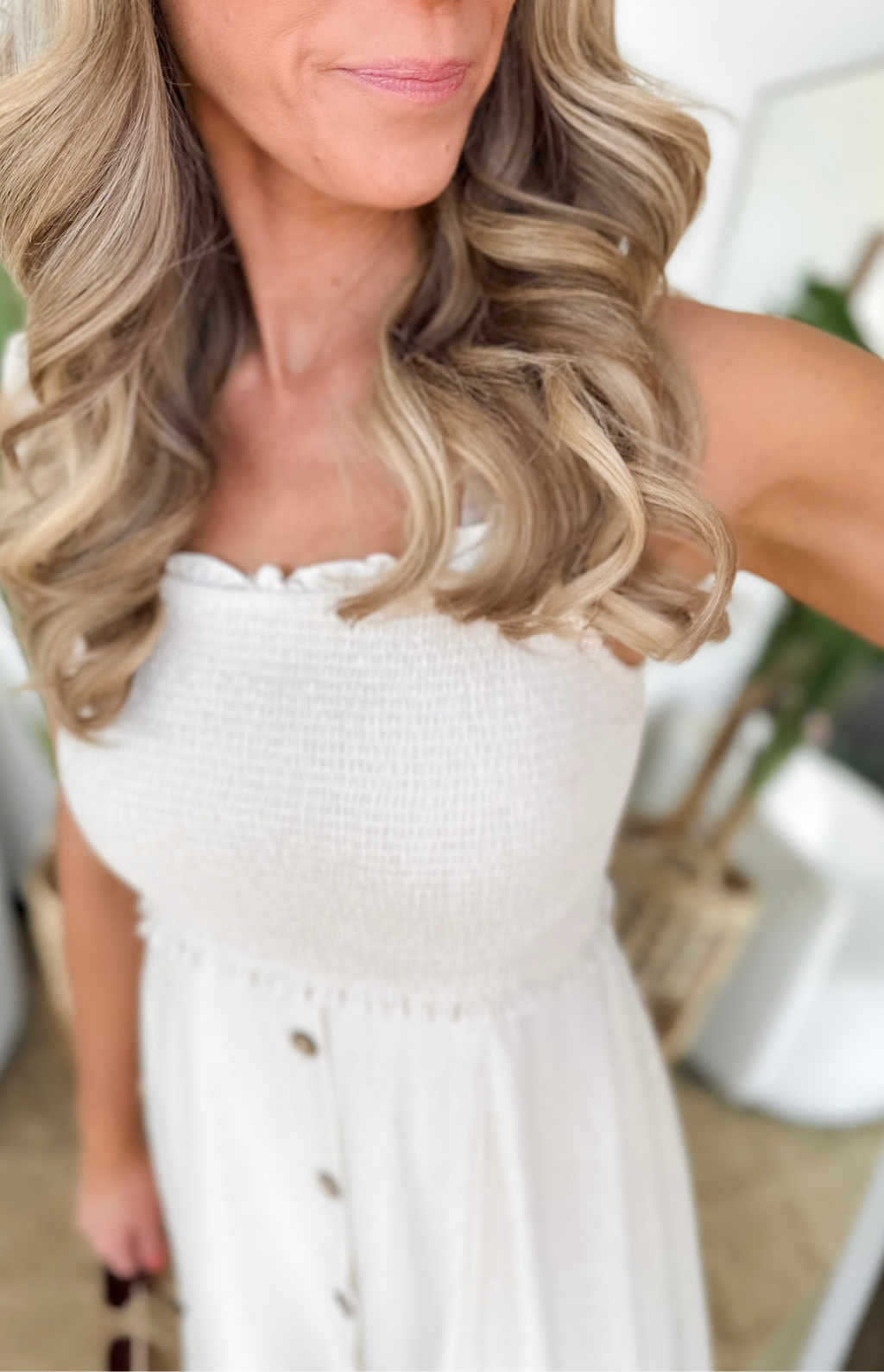 This natural-colored midi dress with a smocked bust and straps is such a beautiful blend of comfort and effortless style. The stretchy smocking gives you a flattering, flexible fit up top, while the flowy silhouette creates that easy, feminine movement we all love. It’s lightweight, breathable, and perfect for warm days when you want to feel pretty without trying too hard.