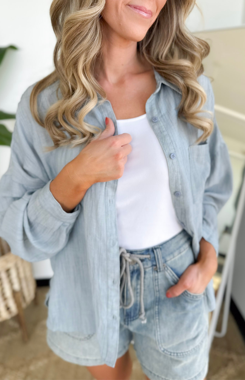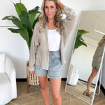 - Details: Lightweight, collared neckline, side slits, can be worn open or buttoned, high-low hemline, chest pocket, drop-shoulder