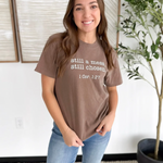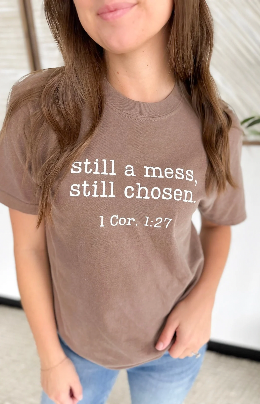 This brown short sleeve tee is a reminder that you’re beautifully chosen, even on your messy days. The relaxed fit makes it super comfortable for busy mornings or casual weekends, and the inspiring “Still a mess, still chosen. 1 Cor. 1:27” message on the front keeps your faith close to your heart. Pair it with jeans or leggings everyday look that feels intentional and uplifting. It’s simple, soft, and full of meaning—just like you.
