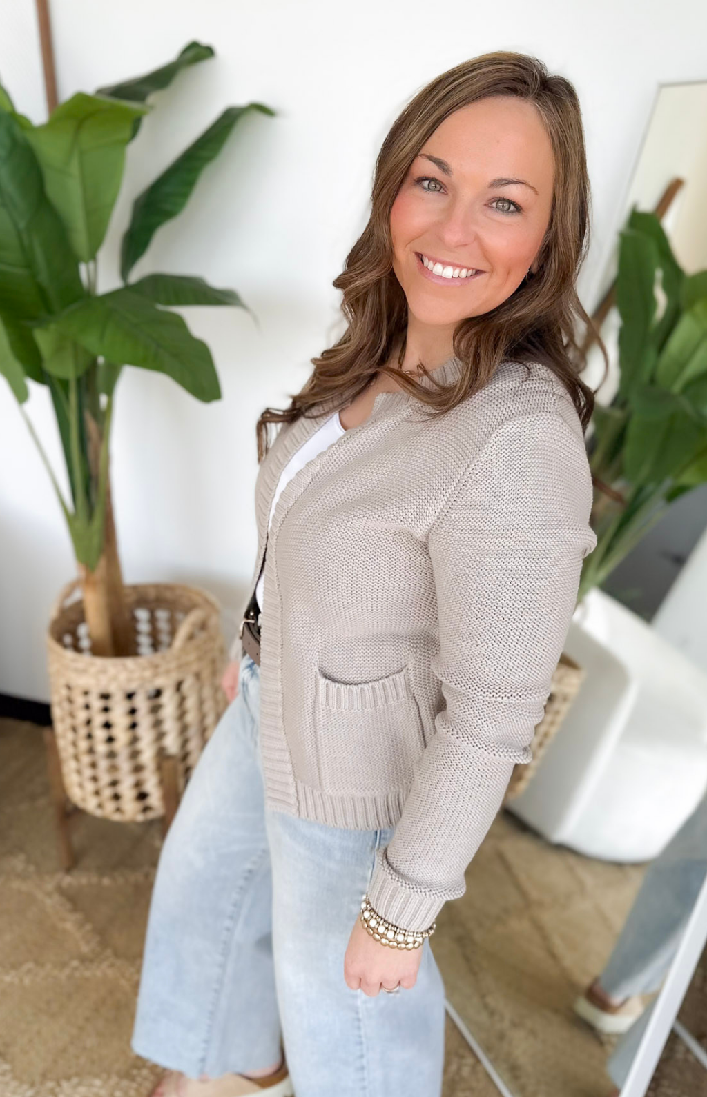 This stone-colored knit cardigan is that easy layer you’ll reach for on busy mornings when you want to look pulled together without overthinking it. The open front makes it effortless to throw on and go, while the front pockets are perfect for keeping your hands cozy or stashing the essentials.