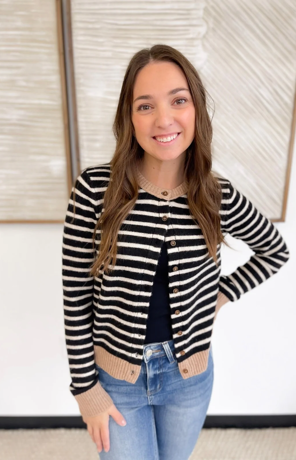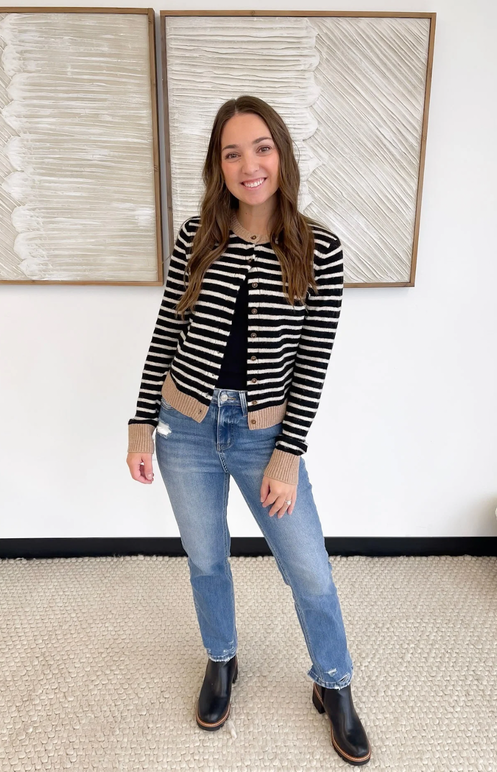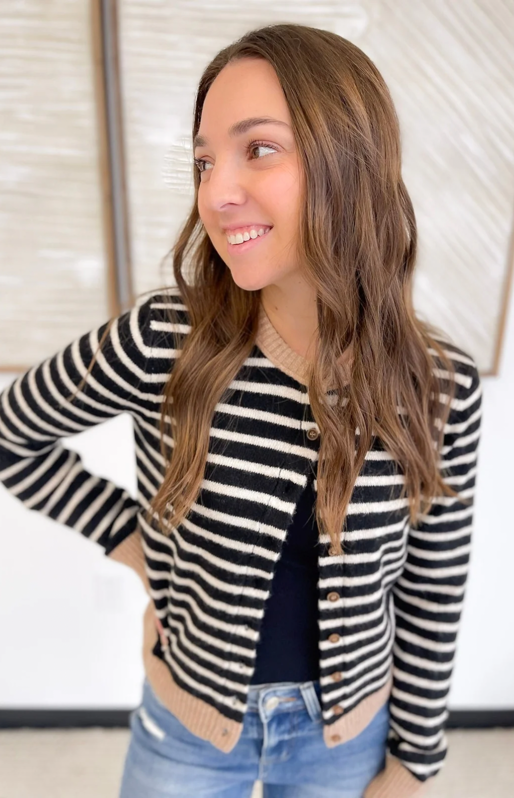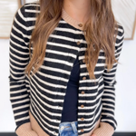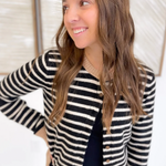 This little cardigan is the definition of effortless polish, girl. The black-and-white stripes give it that classic, goes-with-everything vibe, while the contrast tan trim adds just the right pop of warmth and personality. The fitted silhouette keeps you looking pulled together, even on the busiest mornings when you’re racing out the door. Toss it on with jeans for school drop-off or layer it over a dress for work—you’ll feel instantly confident either way. It’s one of those pieces that makes you look like you tried… even when you absolutely didn’t.
