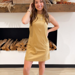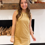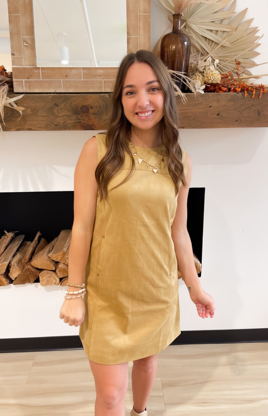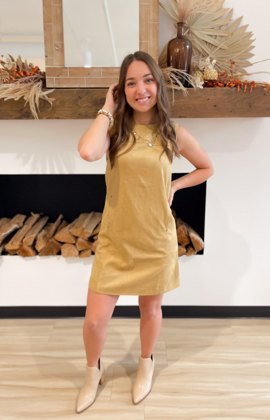 This soft suede sleeveless mini dress in muted mustard is your new “throw on and go” piece that still looks effortlessly chic. The buttery suede texture gives it a luxe feel while keeping it comfortable for all-day wear. Its sleeveless cut makes it perfect for layering with a denim jacket or long sleeve underneath, but it’s just as stunning worn solo with boots or heels. Whether you’re headed to brunch, date night, or a fall event, this little dress is a go-to that makes you feel polished without overthinking it.