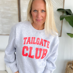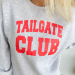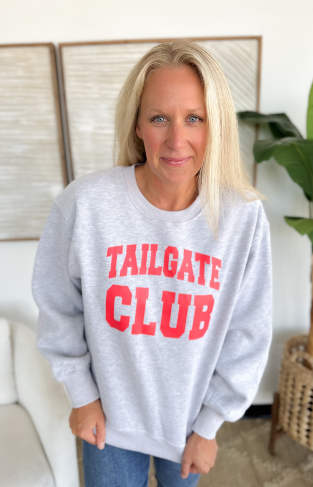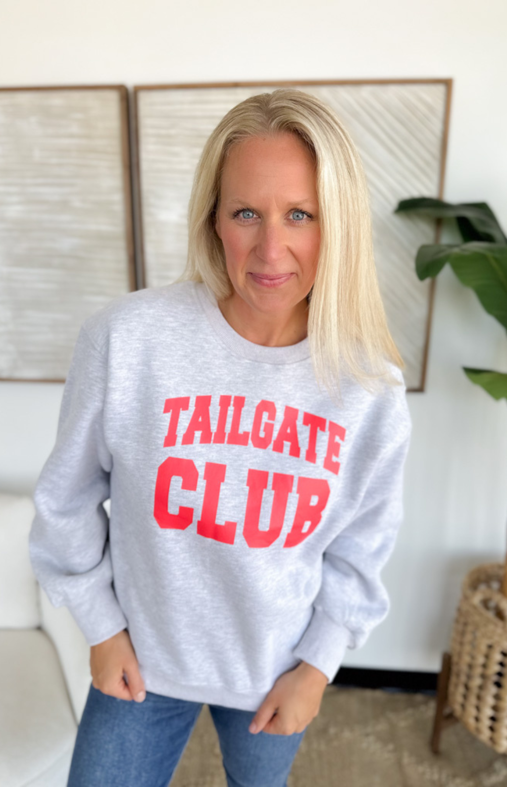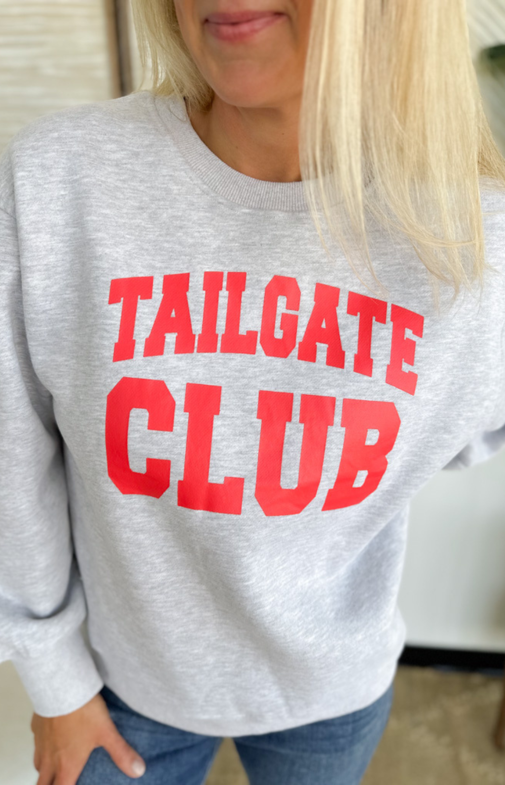 This grey crew neck sweatshirt was made for game day vibes. With “Tailgate Club” boldly printed in red across the front, it’s the perfect mix of cozy and spirited. The classic crew neckline and relaxed fit make it easy to throw on with jeans, leggings, or layered under a jacket when the weather cools down. Soft and comfy, it’s ideal for long days of cheering, tailgating, or just lounging in style.