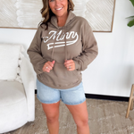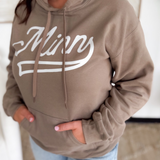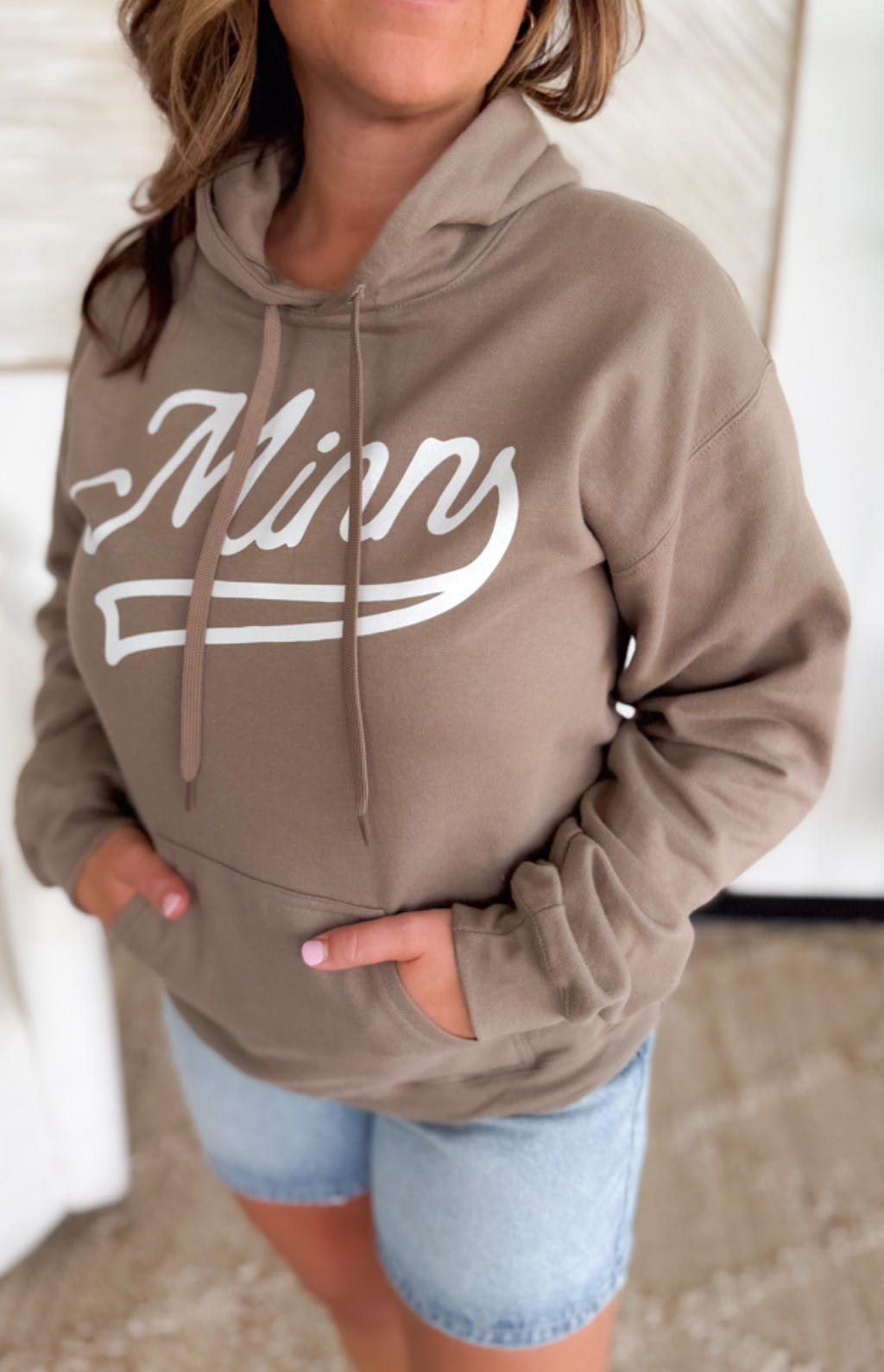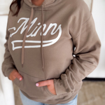 This relaxed fit hooded sweatshirt features a tan hue with a "Minn" design in white on the front and an attached hood with matching drawstrings. Perfect for any Minnesota activity!